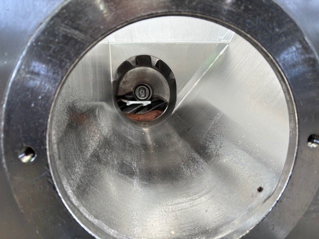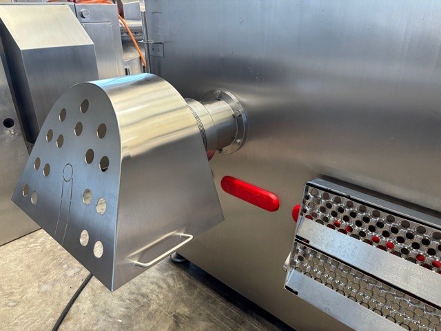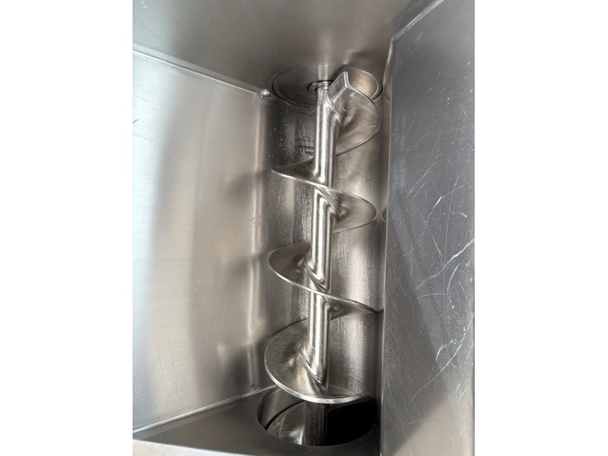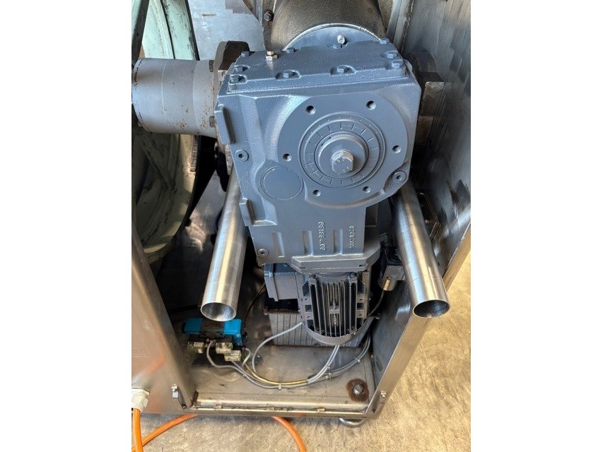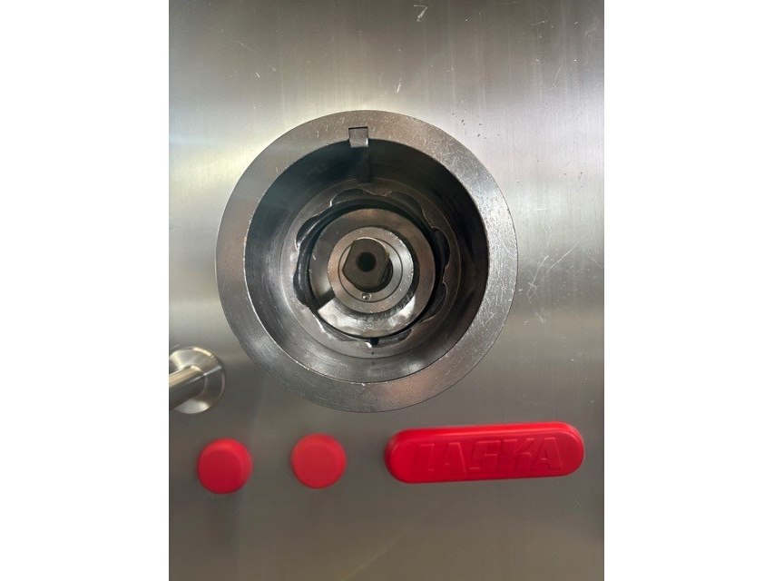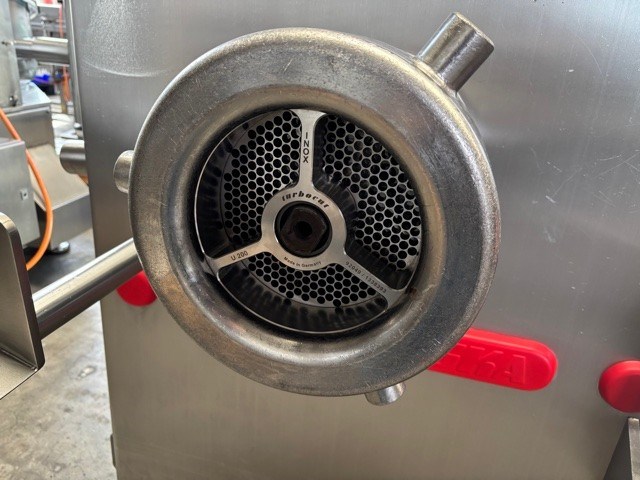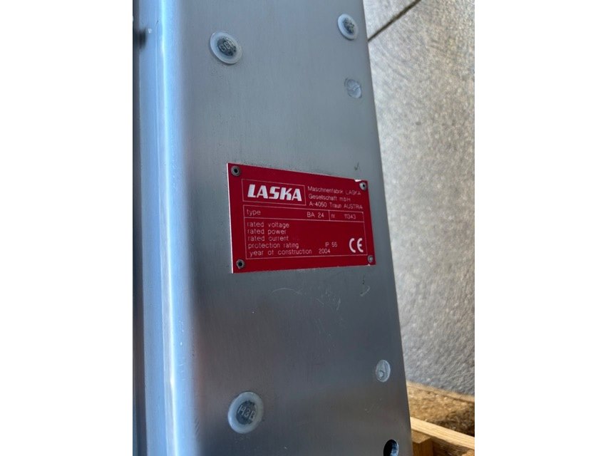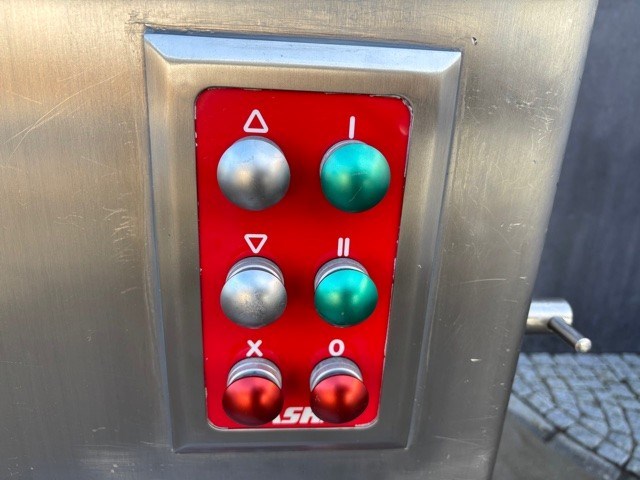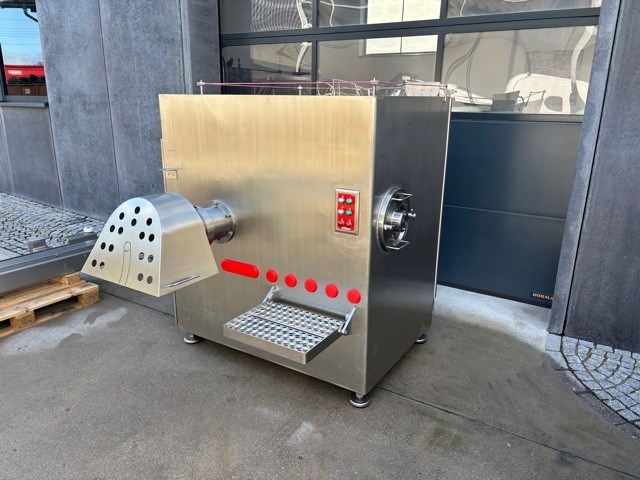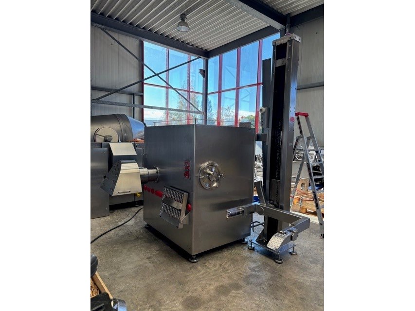 Laska grinder for fresh and frozen meat with lifter for meat bins, model: WW 200 2G, machine number: 11341, year of construction: 2004, plate diameter: 200 mm, total dimensions grinder: 1700 mm x 1300 mm x 1750 mm, model lifter: BA 24, number: 11343, year of construction: 2004. Overhauled.