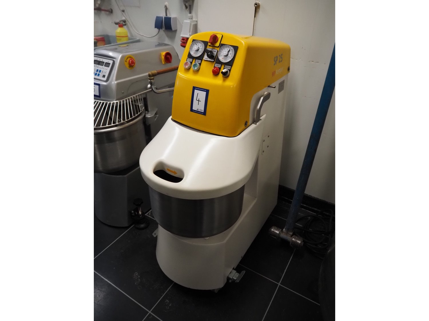 WP Kemper GmbH mobile mixer, type: Spiraalkneedmachine "schuifbaar" SP 25, machine number: KEM-0007584, year of construction: 03/17, 400 V, 3 Ph, 50 Hz, 16 A, 2.1 kW, volume: 25 liter, s/s bowl, bowl dimensions: Ø 430 mm x 280 mm, total dimensions: 940 mm x 470 mm x 1200 mm.
