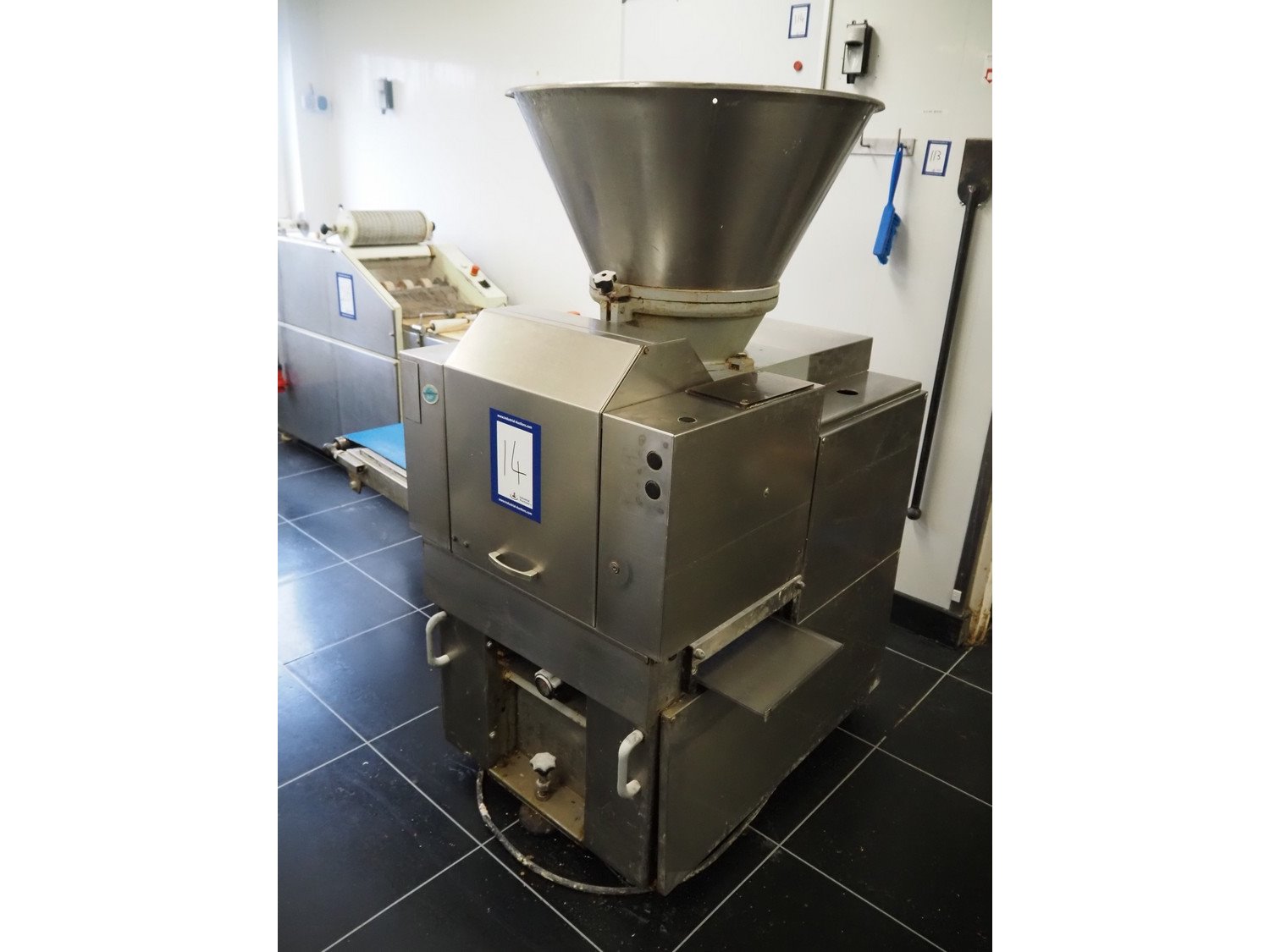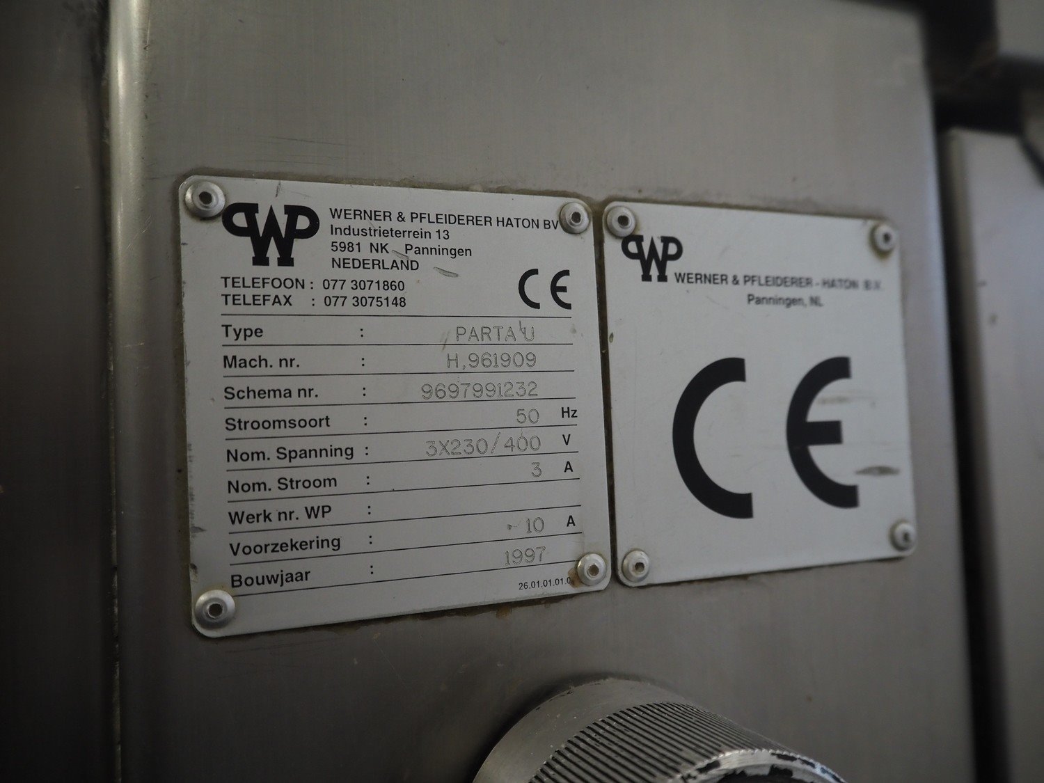 Werner & Pfleiderer Haton BV mobile dough divider, type: PARTA U, machine number: H.961909, year of construction: 1997, 230/400 V, 3 Ph, 50 Hz, 3/10 A, s/s infeed funnel, funnel dimensions: Ø 730 mm x 600 mm, plastic belt, belt width: (2x) 300 mm, total dimensions: 1500 mm x 1100 mm x 1600 mm.