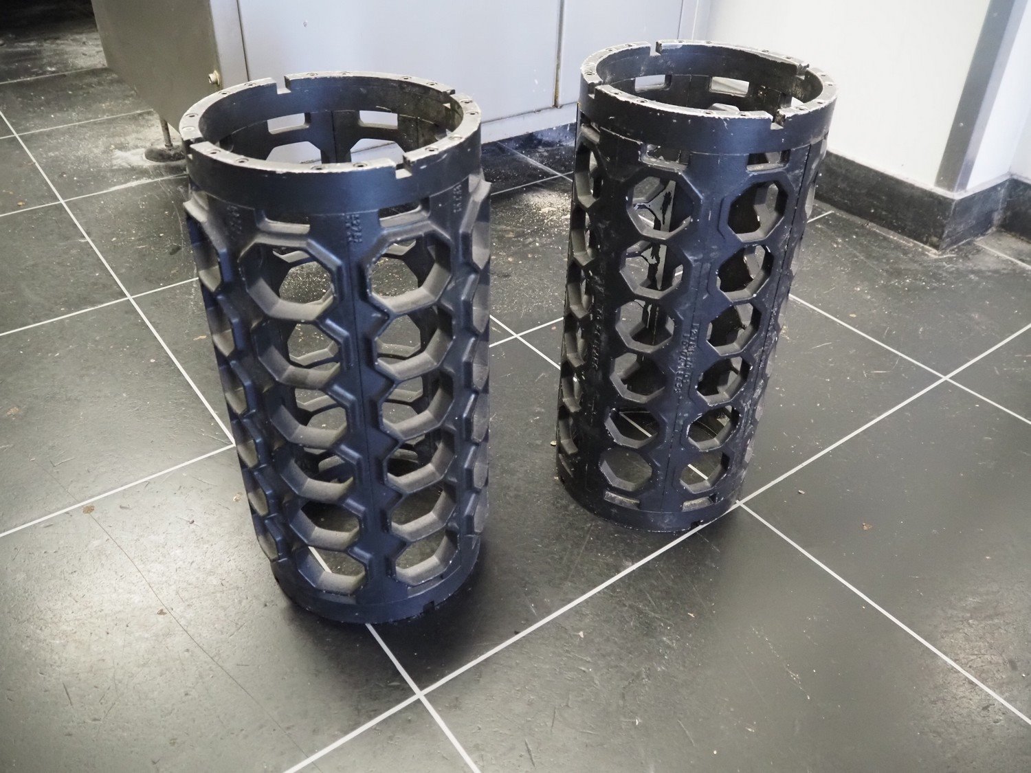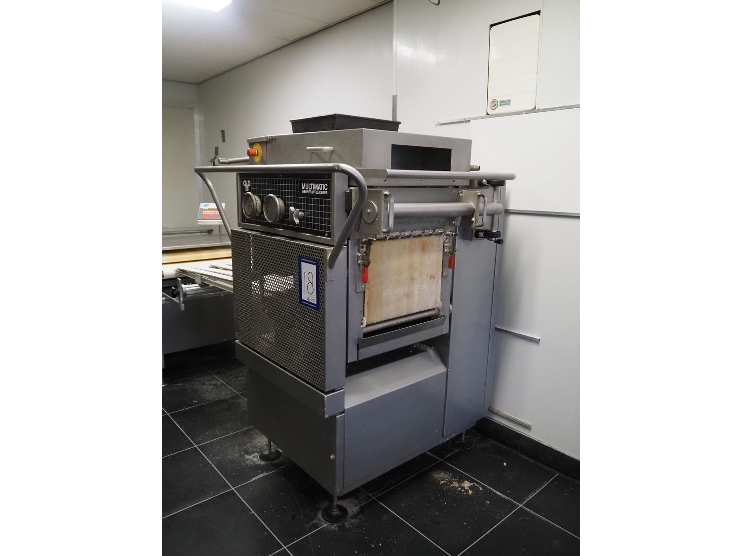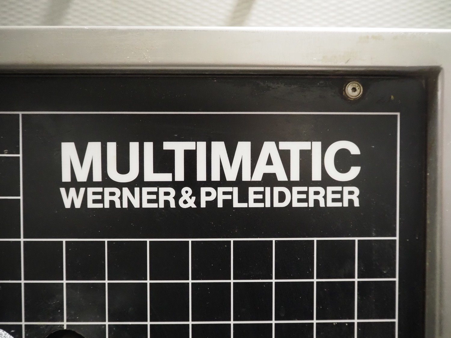 Werner & Pfleiderer Haton BV dividing and rounding machine, infeed clearance: 340 mm x 360 mm, dye dimensions: 65 mm x 75 mm, cloth belt, belt width: (1x) 460 mm, (6x) 60 mm, brush length: 410 mm, total dimensions: 2250 mm x 1200 mm x 1760 mm. Including 2 extra dyes, dye dimensions: (1x) 75 mm x 65 mm, (1x) 60 mm x 65 mm.
