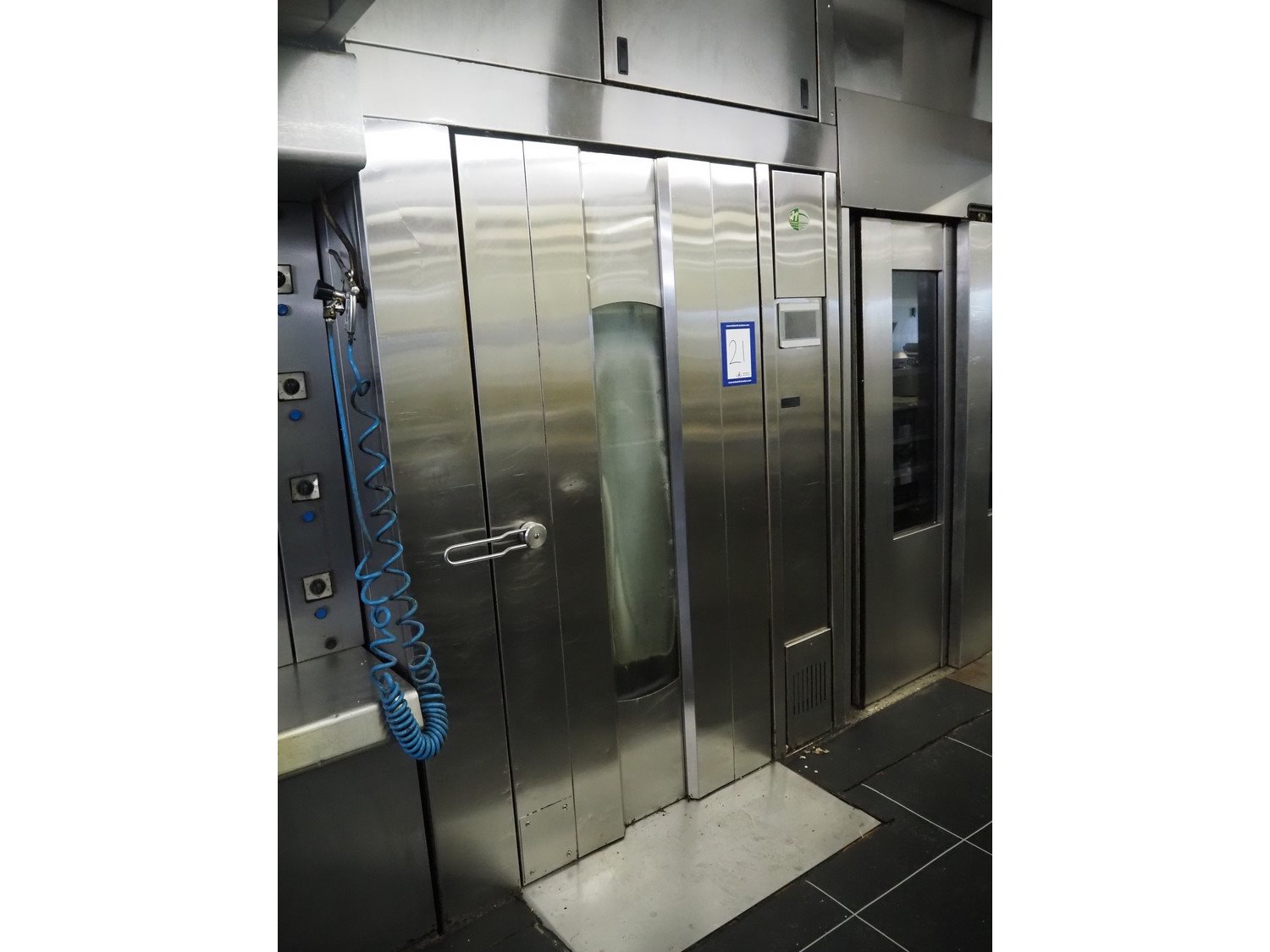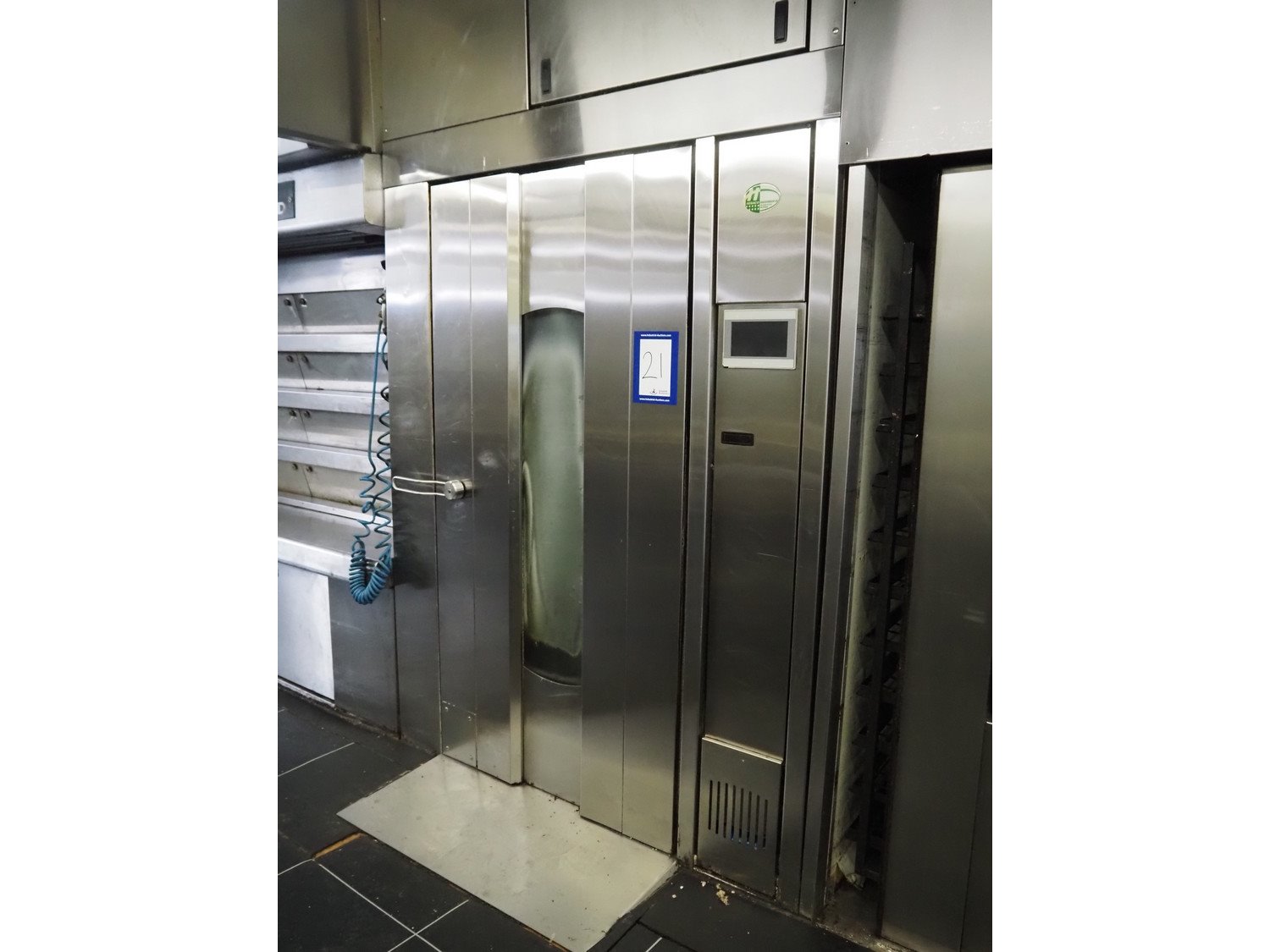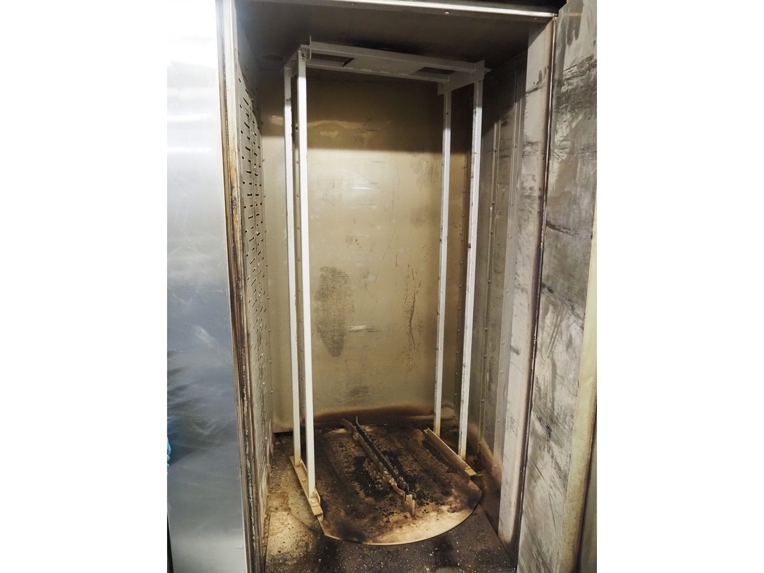 Hebaco rotary oven, turning device: Ø 1050 mm, height: 1980 mm, inside dimensions: 1250 mm x 1140 mm x 2000 mm, total dimensions: 2200 mm x 1620 mm x 2660 mm.
