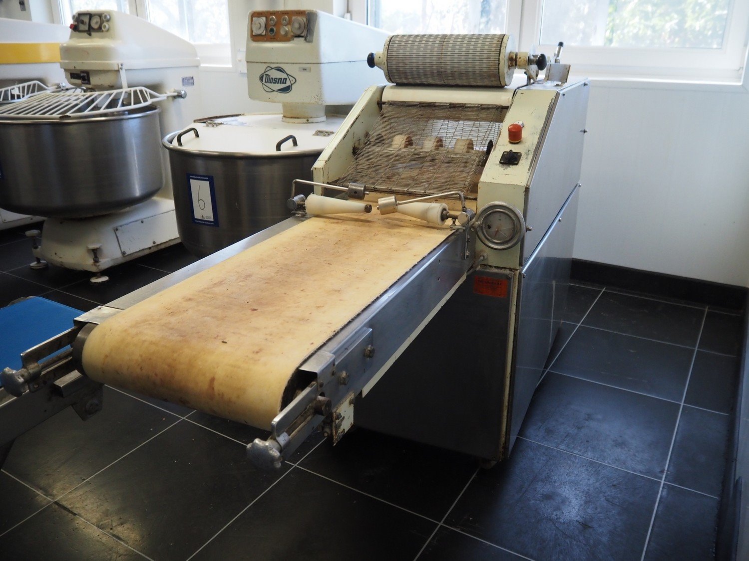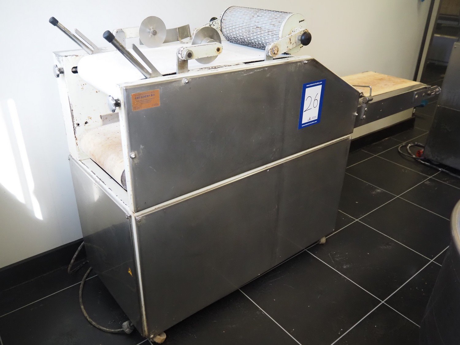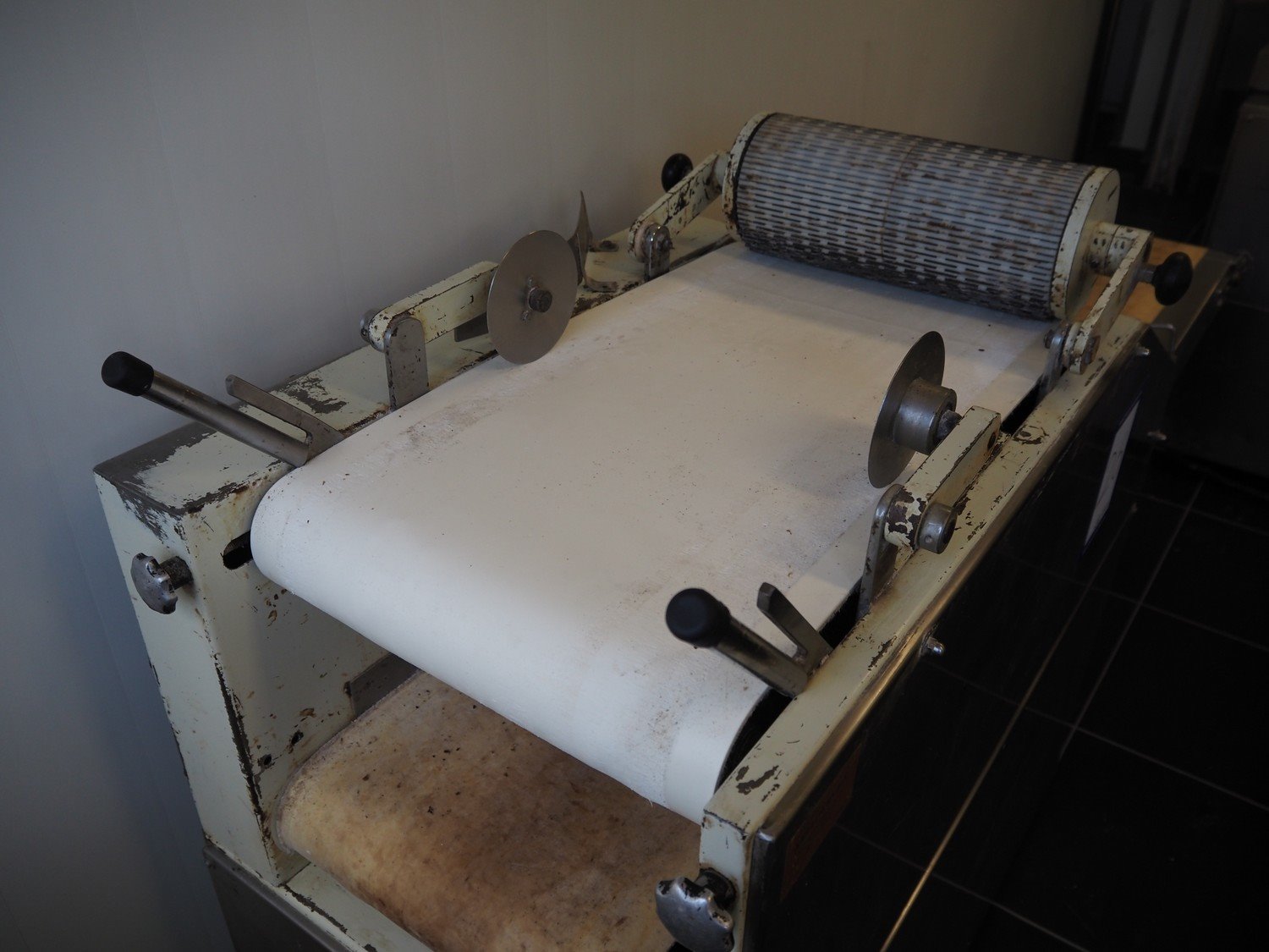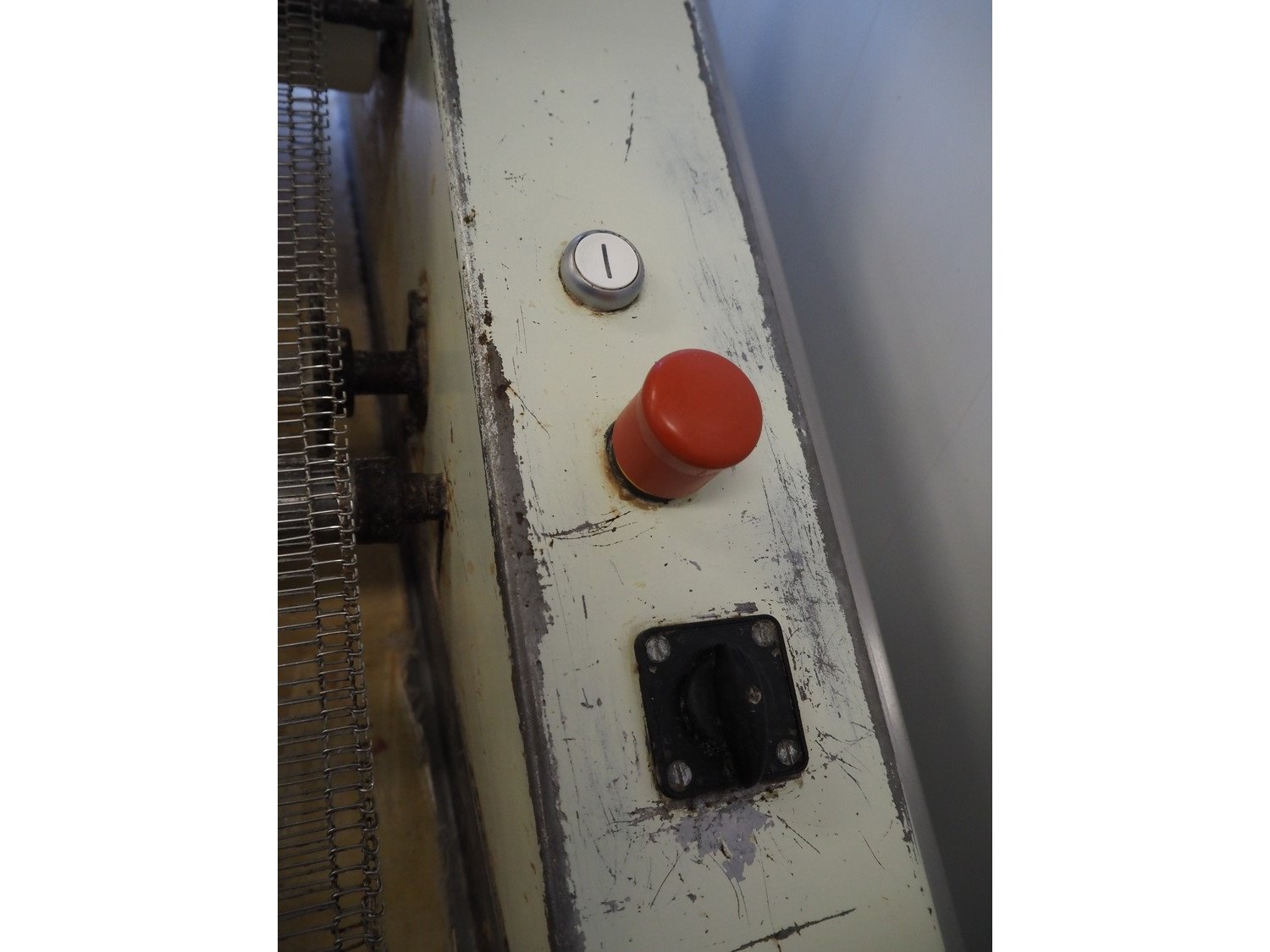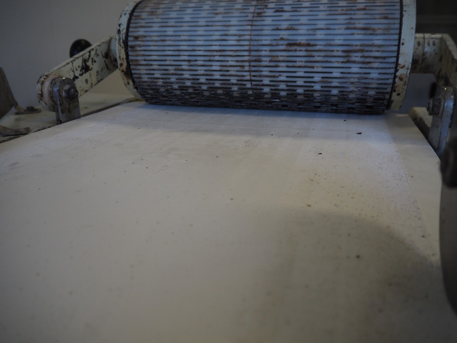 Mobile dough lattice machine, plastic belt, belt width: 370 mm, s/s mesh belt width: 370 mm, roller width: 390 mm, total dimensions: 2200 mm x 630 mm x 1240 mm.