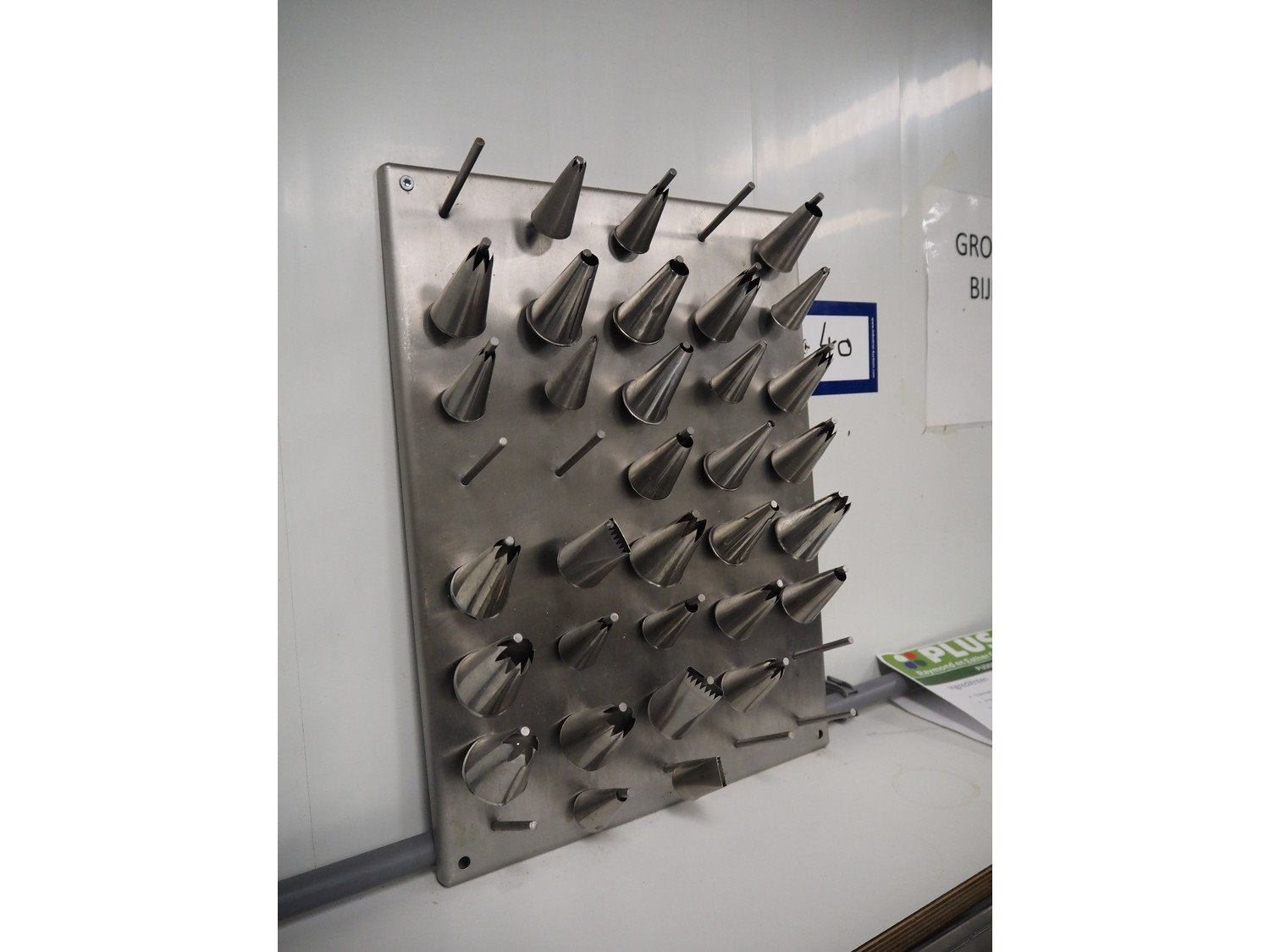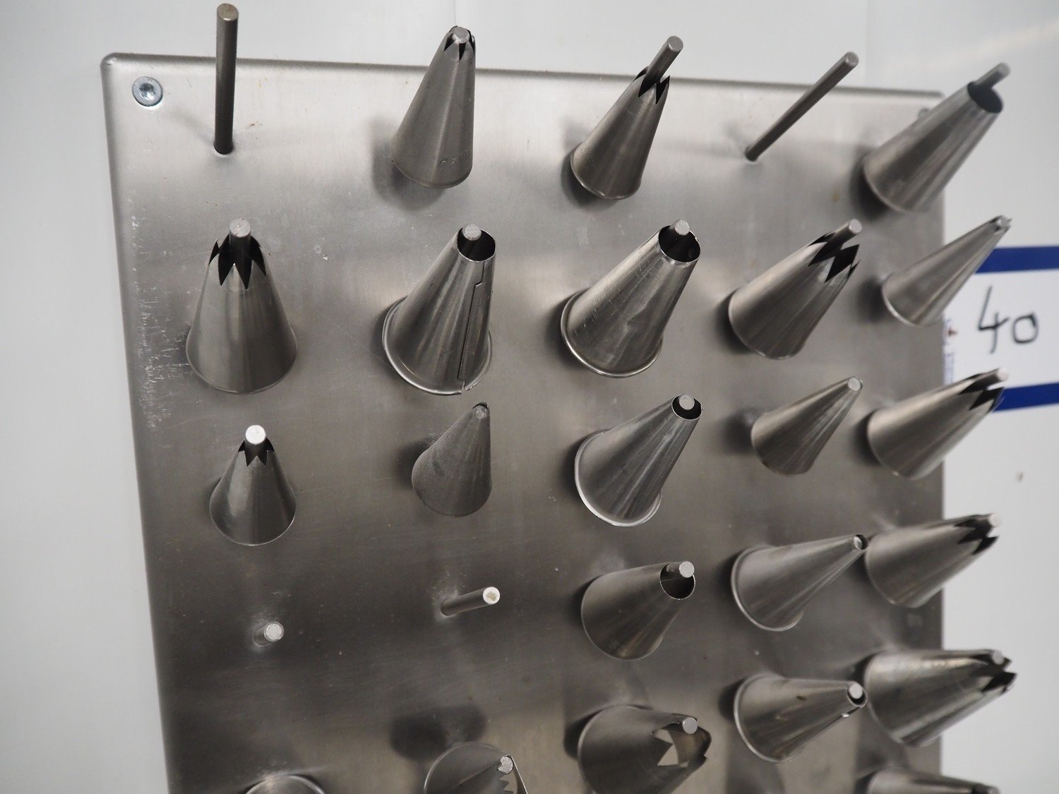 S/s holder with large amount of piping tips, dimensions: 300 mm x 60 mm x 400 mm.