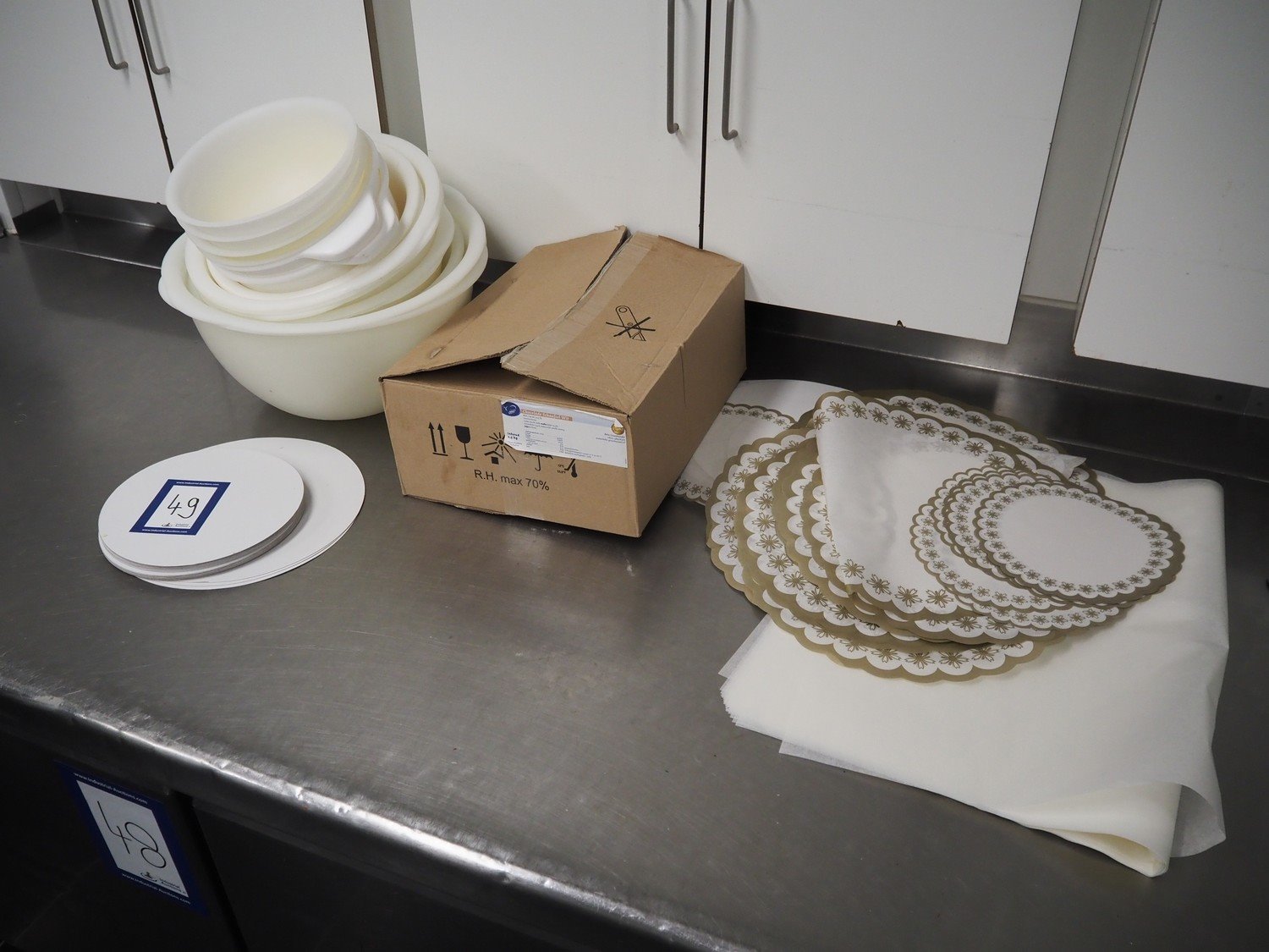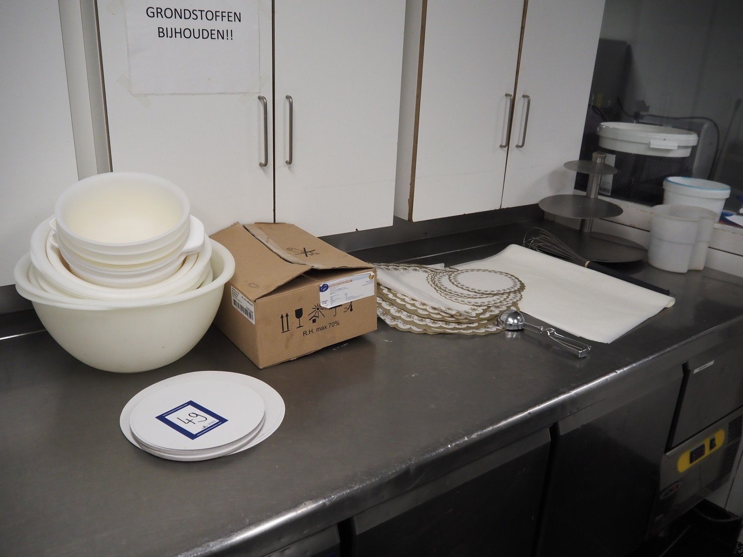 Kitchen equipment, among others: s/s ice cream scoop, whisk, cartonnen, dimensions: Ø 220 mm, paper, dimensions: Ø 350 mm. Without plastic cups.