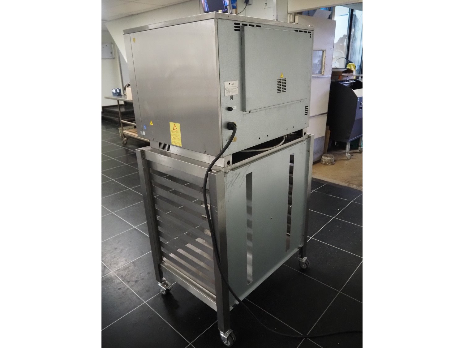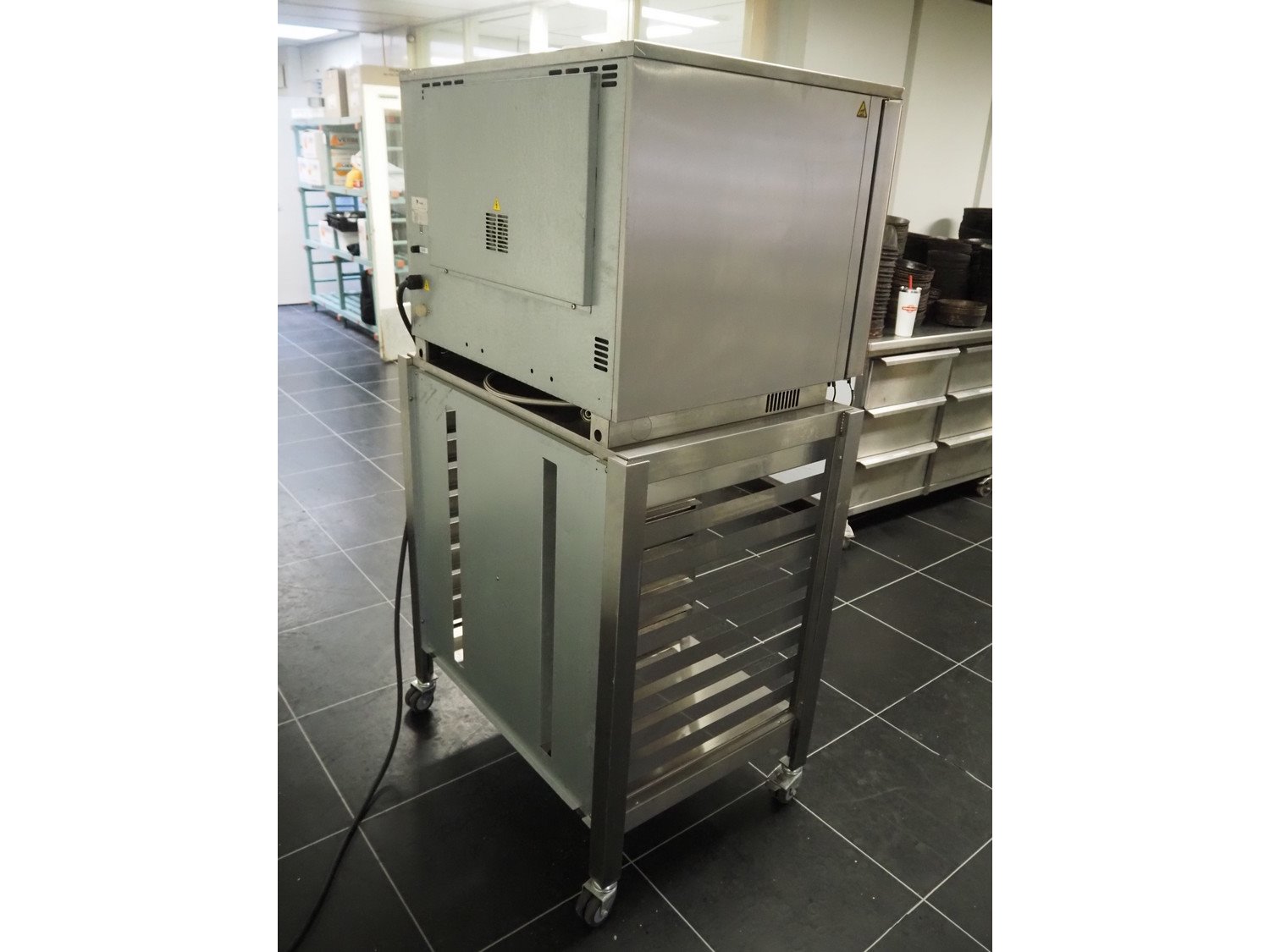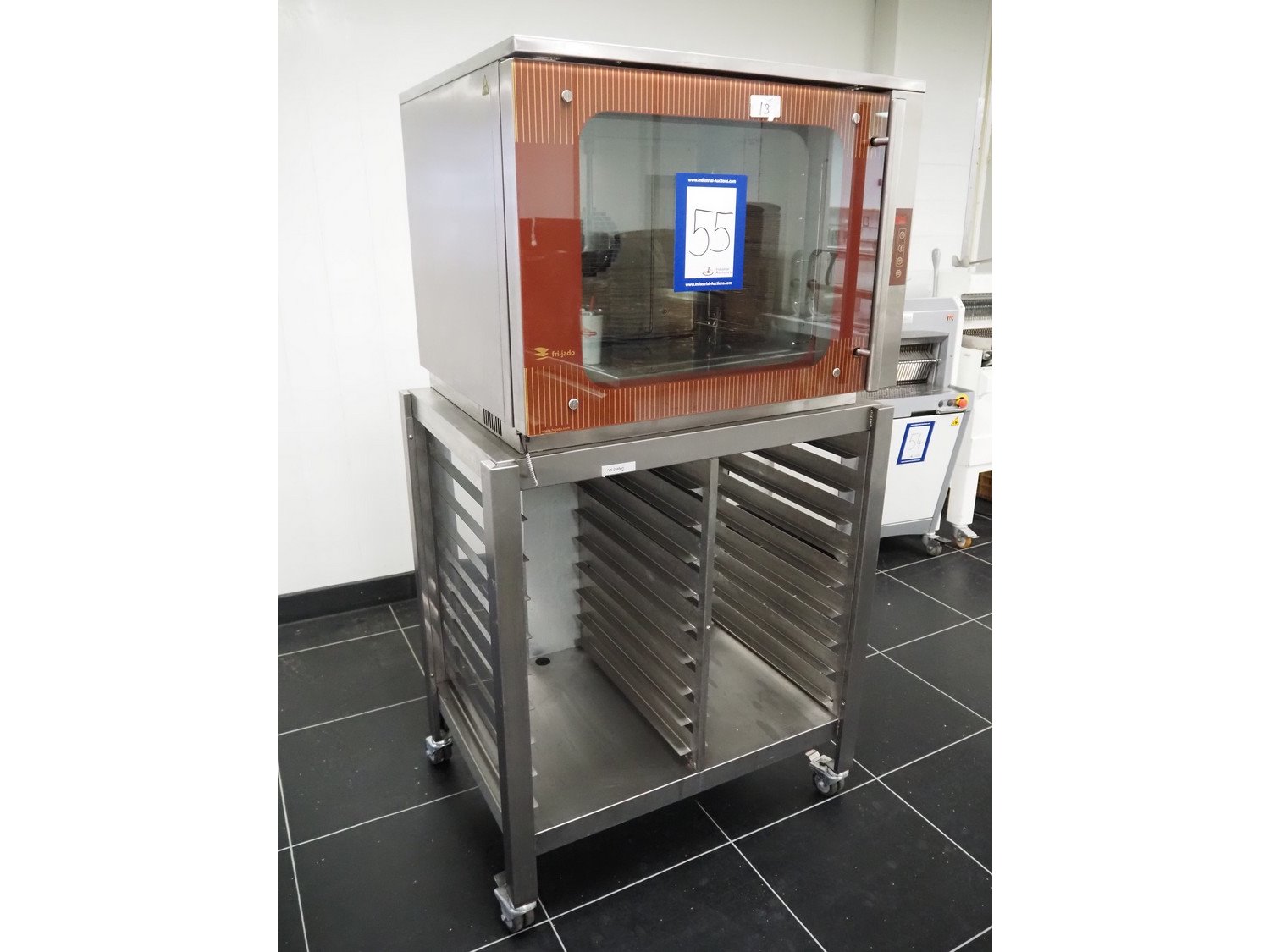 Fri-Jado B.V. combi steamer on s/s trolley, model: BB 5-P, number: 100045944, year of construction: LG, 200/400 V, 3 Ph, 50/60 Hz, 9.5 A, 5760 W, 5 floors, floor dimensions: 610 mm x 400 mm, total dimensions: 950 mm x 690 mm x 1750 mm.
