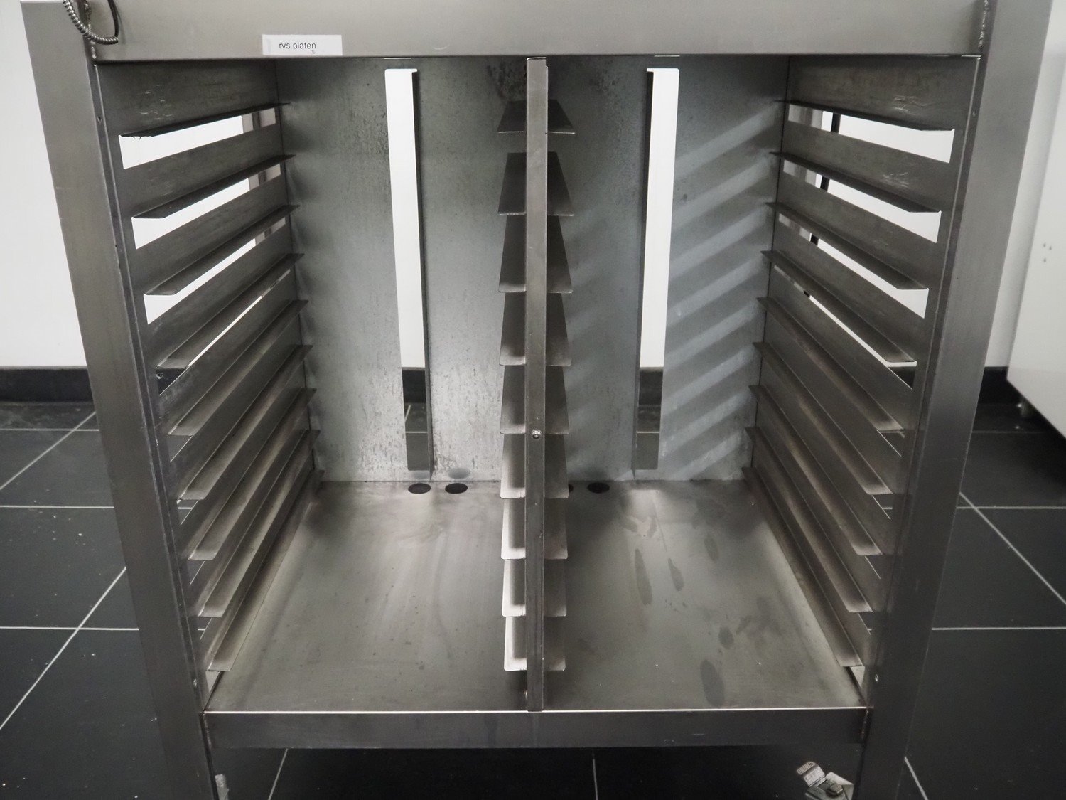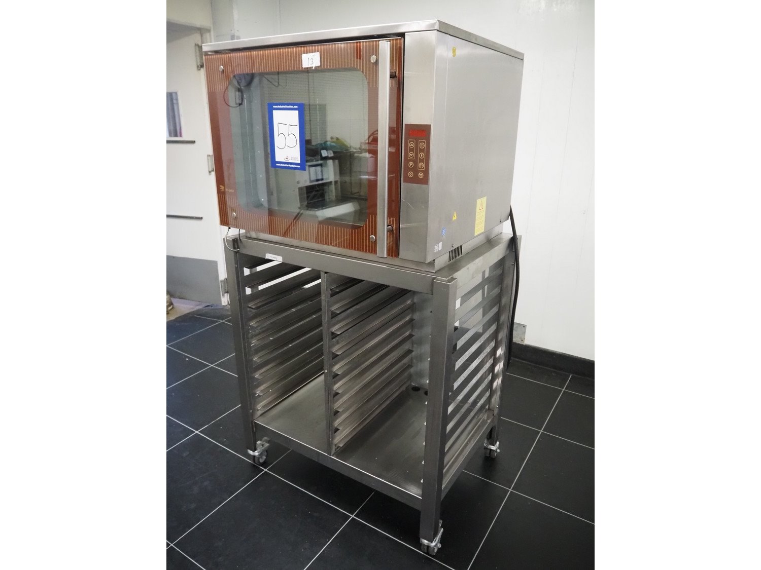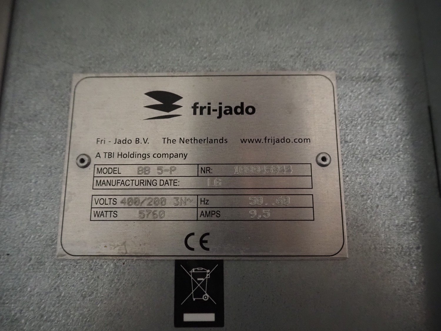 Fri-Jado B.V. combi steamer on s/s trolley, model: BB 5-P, number: 100045944, year of construction: LG, 200/400 V, 3 Ph, 50/60 Hz, 9.5 A, 5760 W, 5 floors, floor dimensions: 610 mm x 400 mm, total dimensions: 950 mm x 690 mm x 1750 mm.