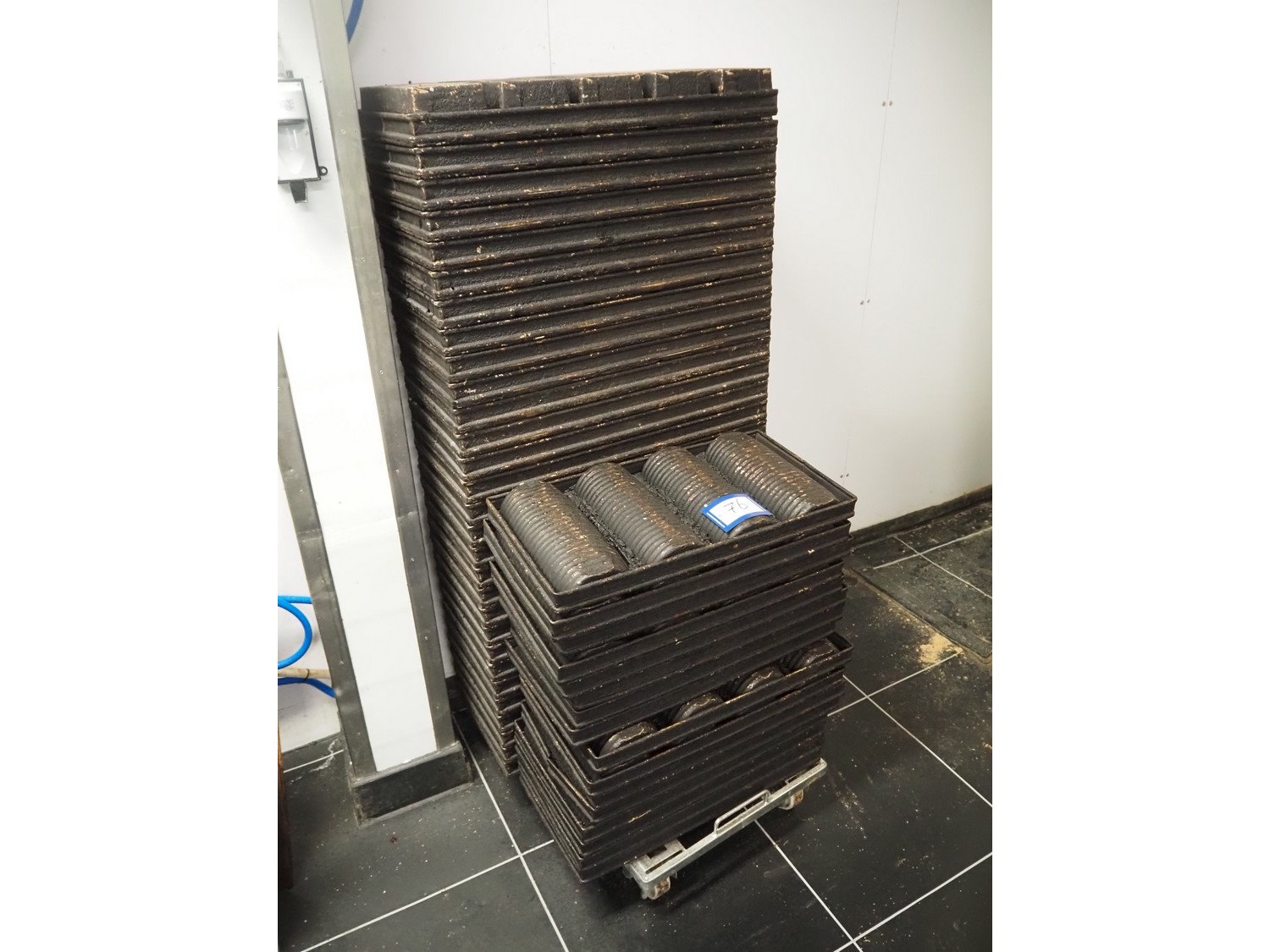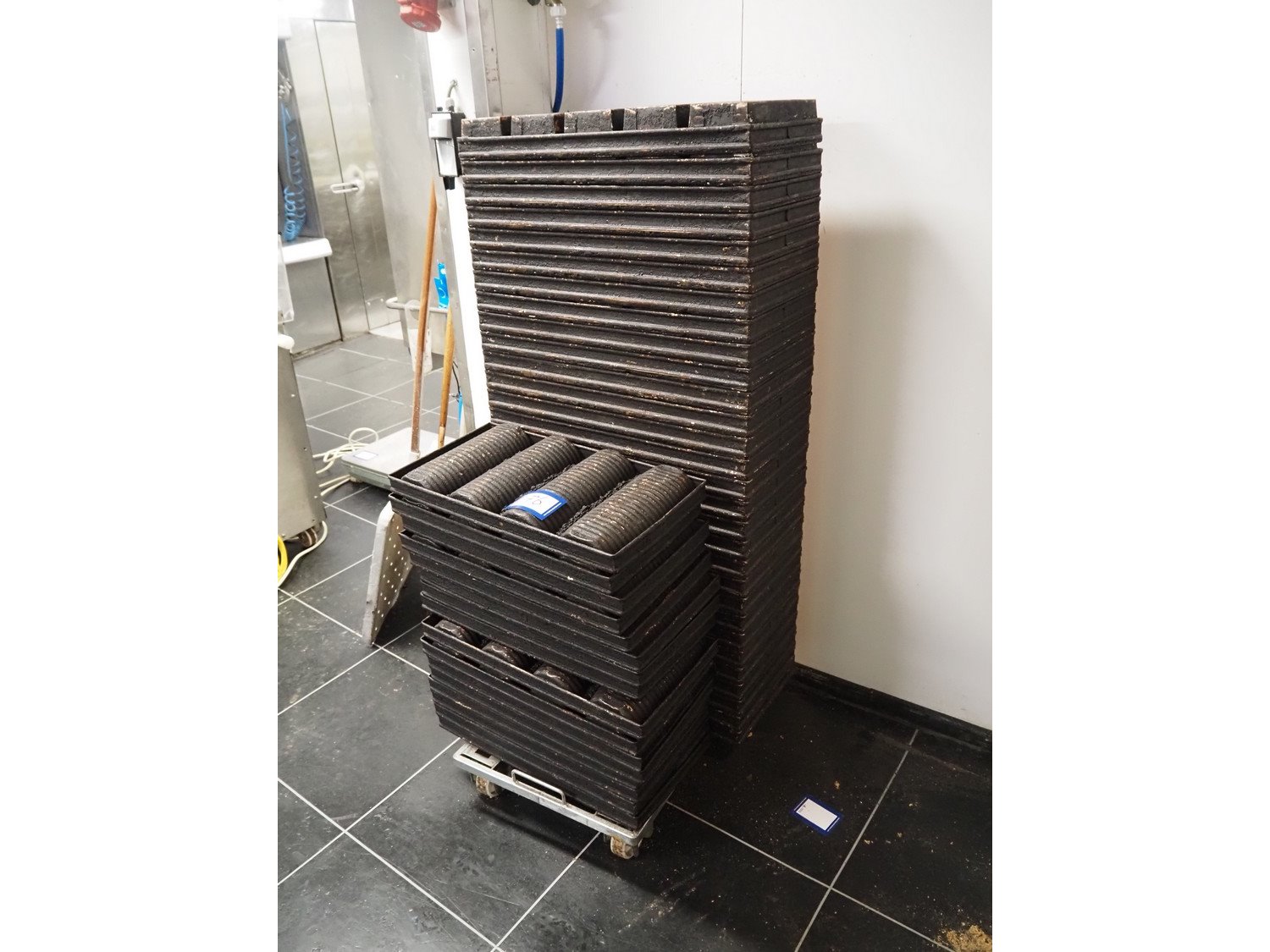 Large amount of baking forms, inside dimensions each form: (5x) 305 mm x 120 mm x 75 mm, (4x) 290 mm x 120 mm x 45 mm, total dimensions: 700 mm x 680 mm x 1450 mm.