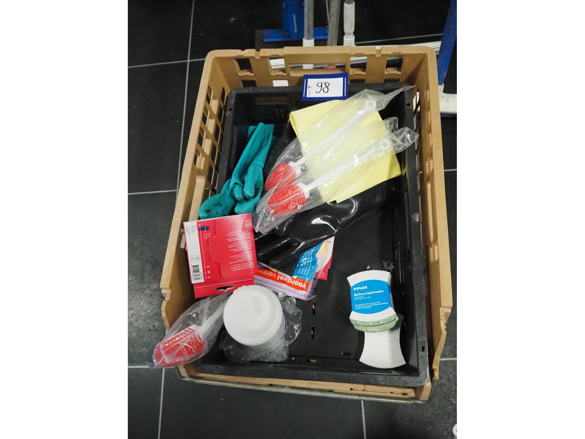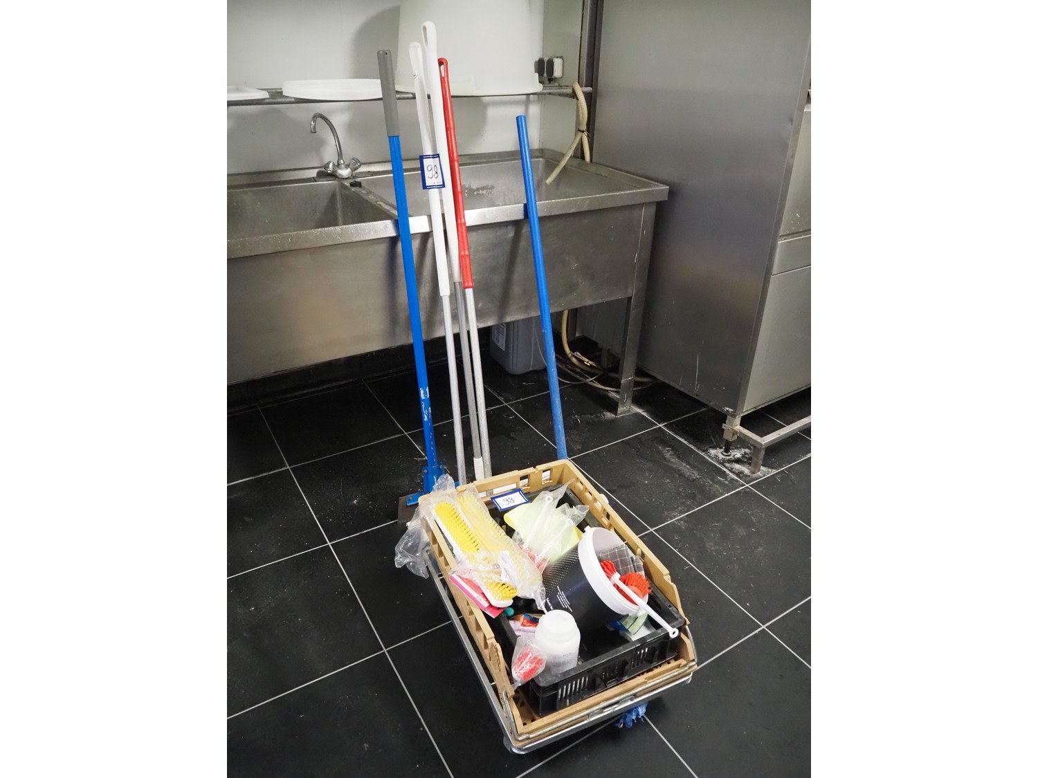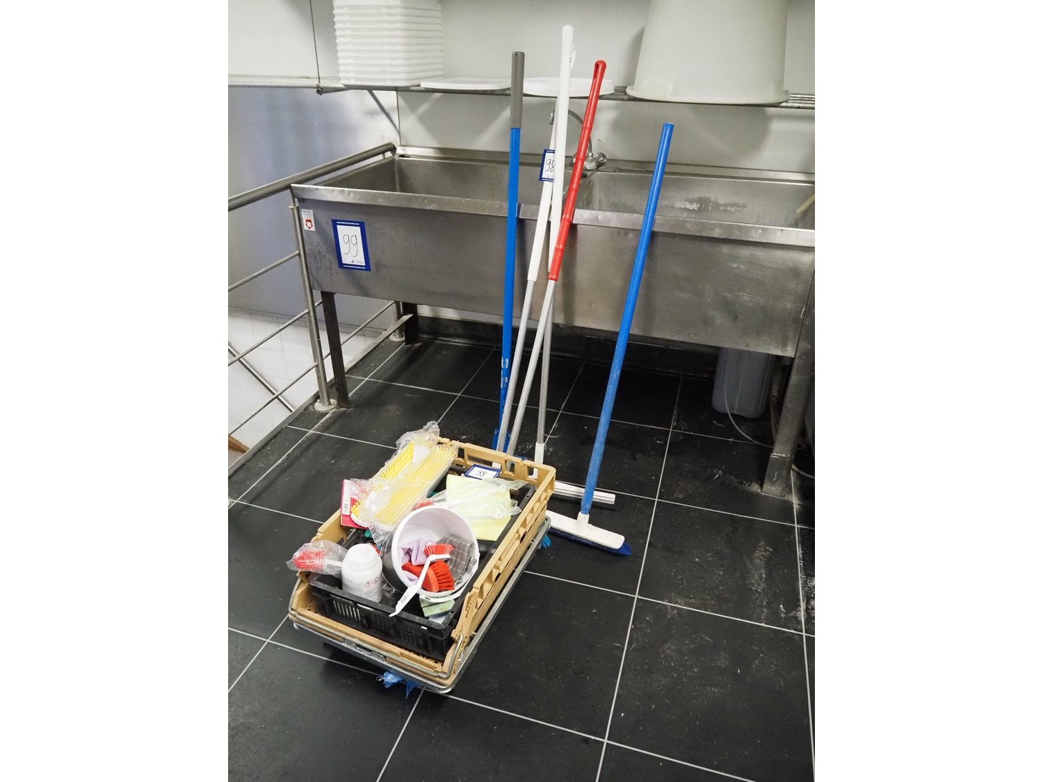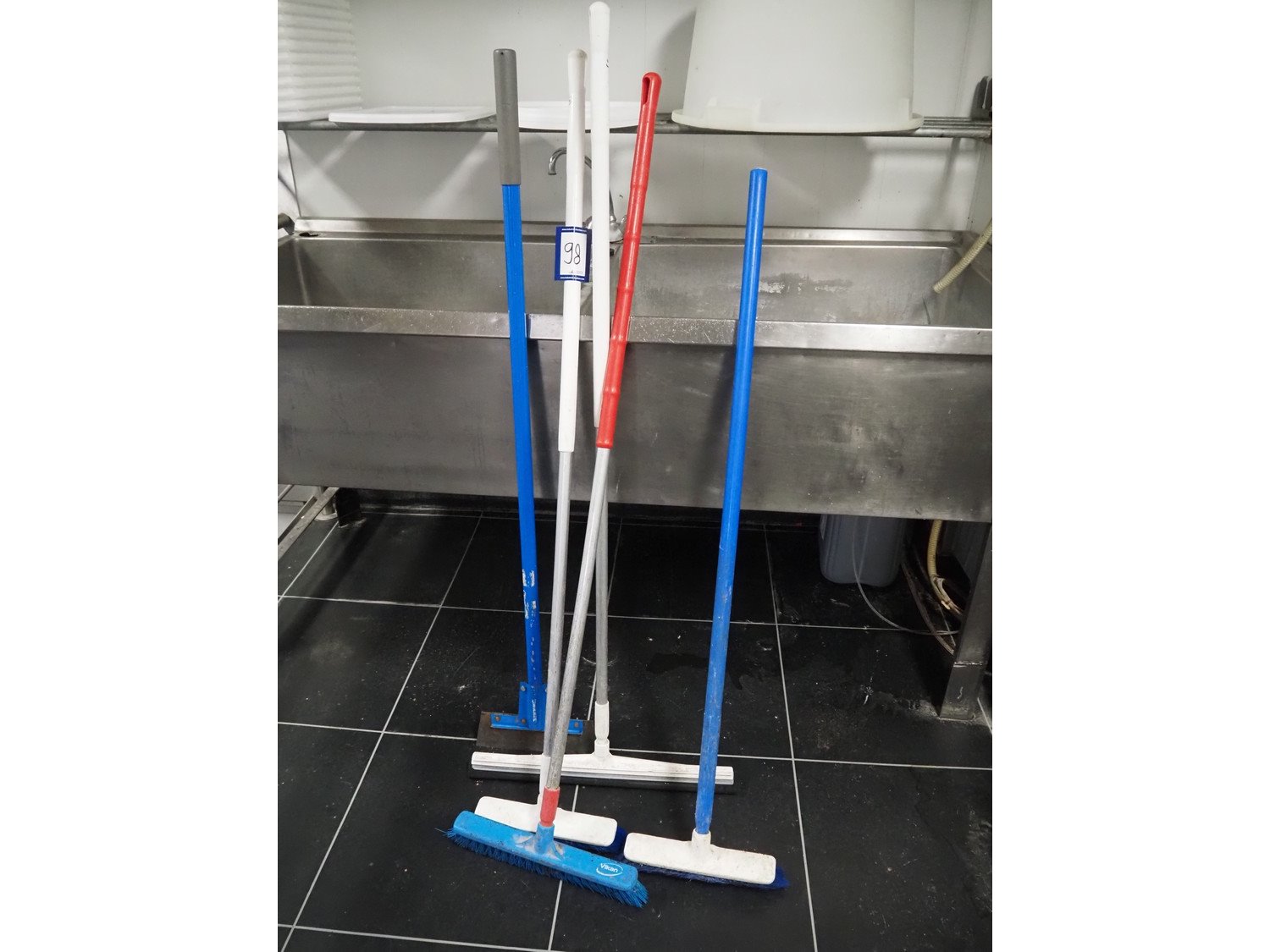 Cleaning equipment, among others: 3 plastic brooms, squeegee.