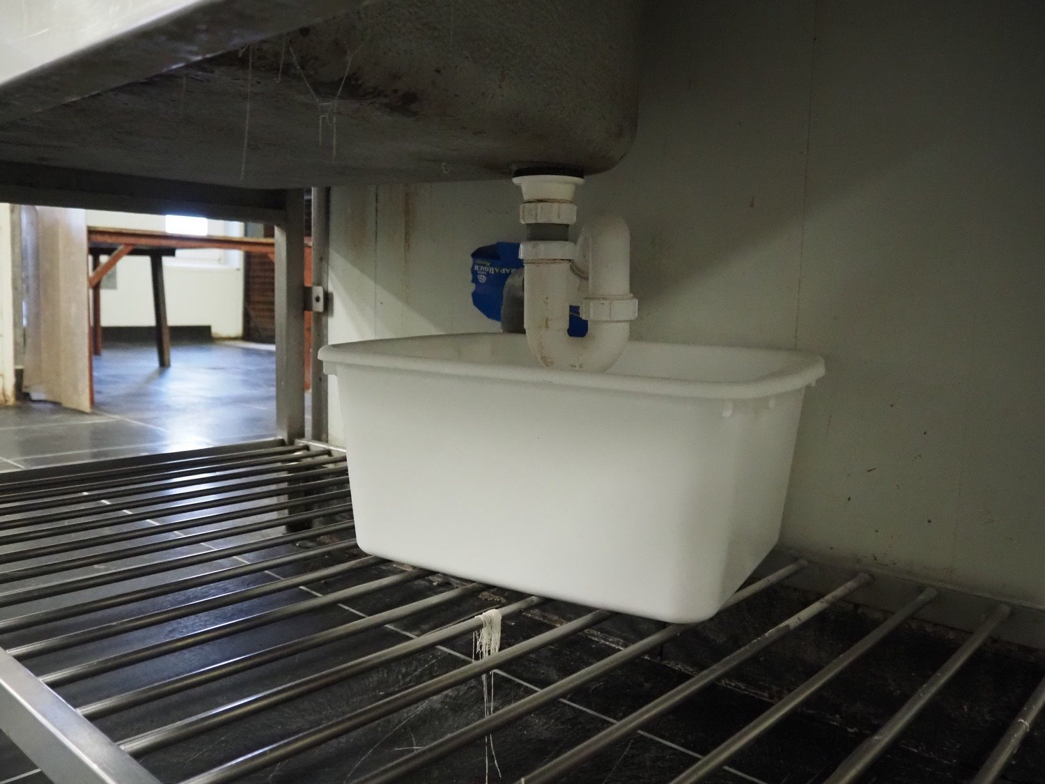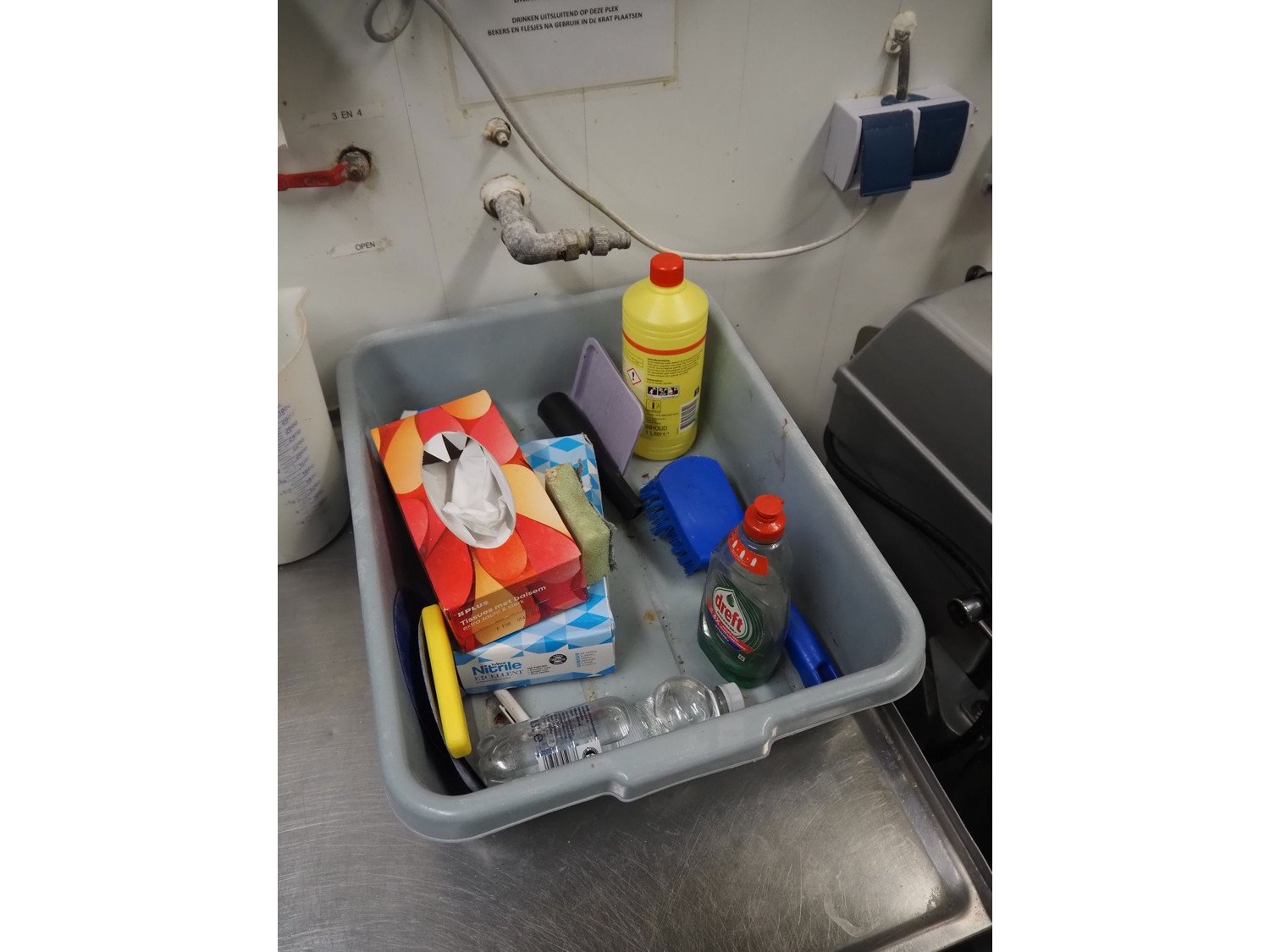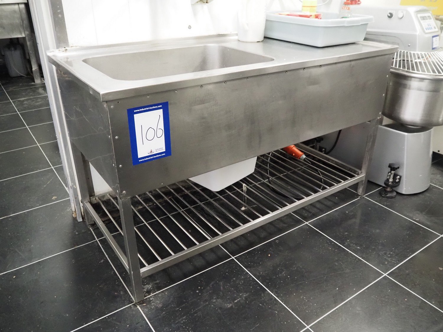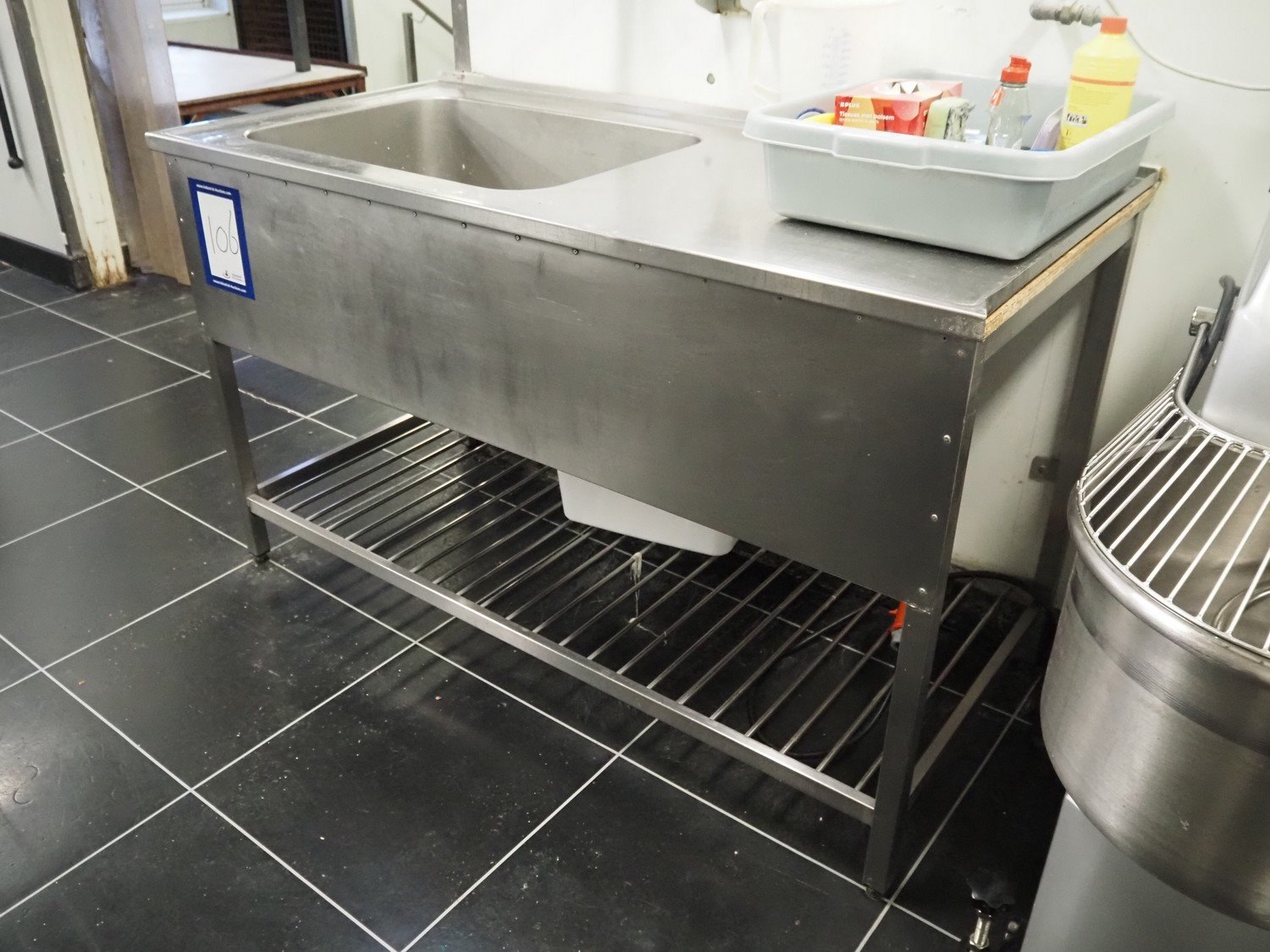 S/s sink with soap dispenser, trash bag holder and cleaning equipment, dimensions: 1500 mm x 700 mm x 900 mm.