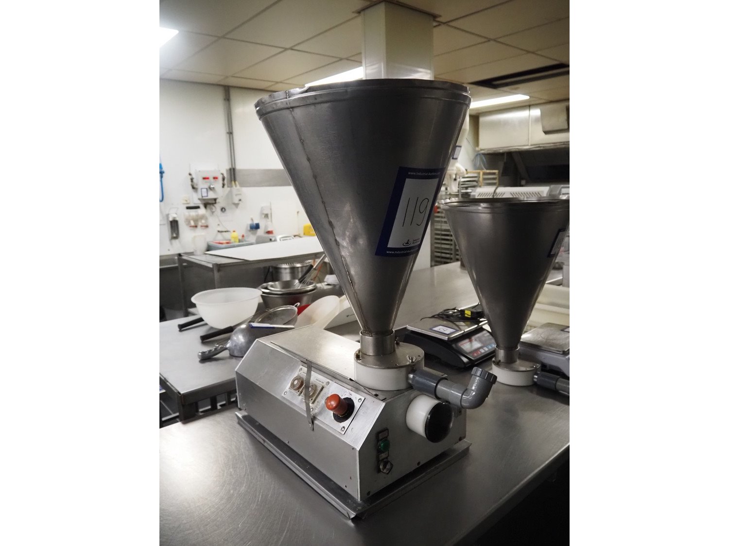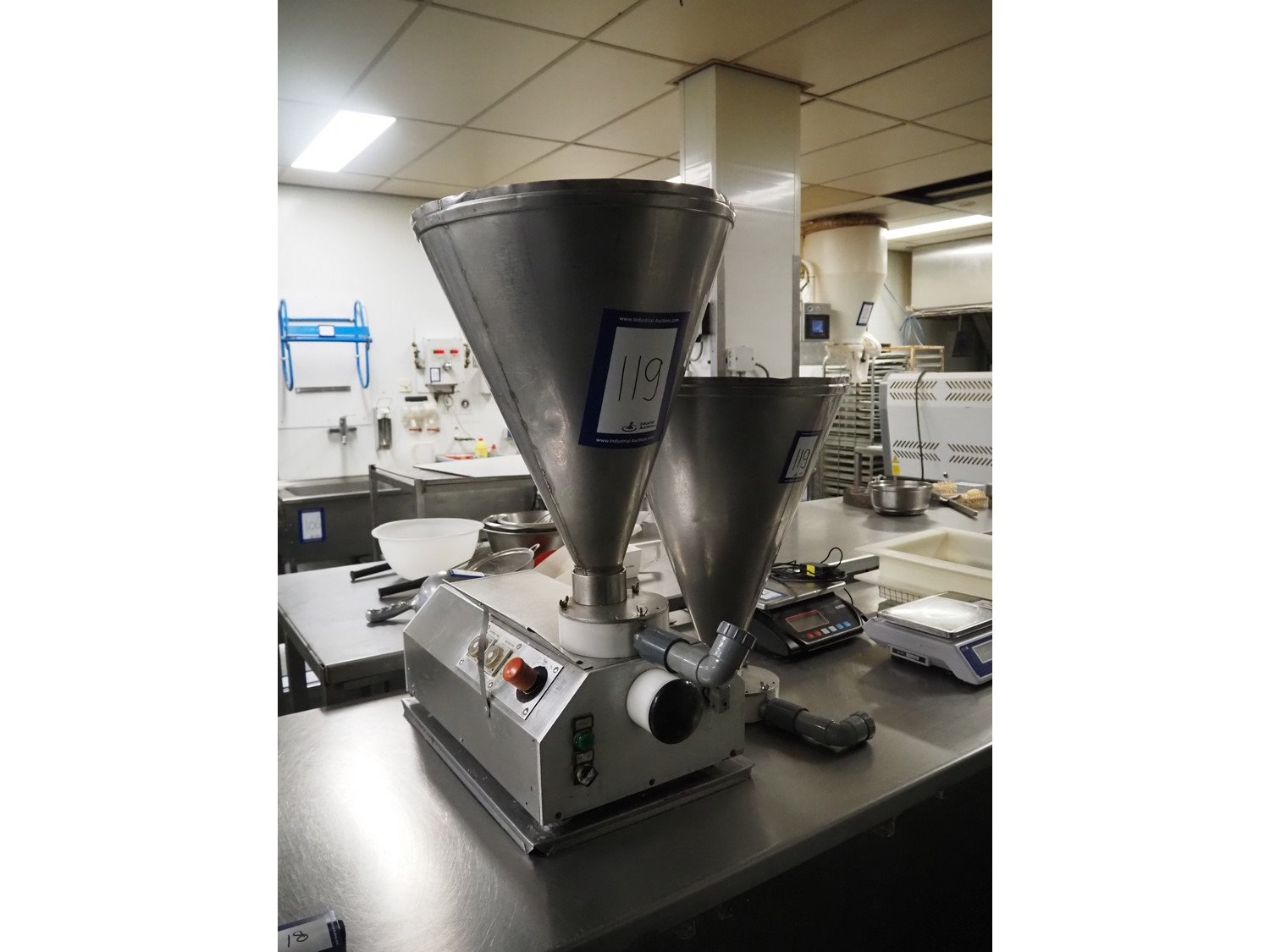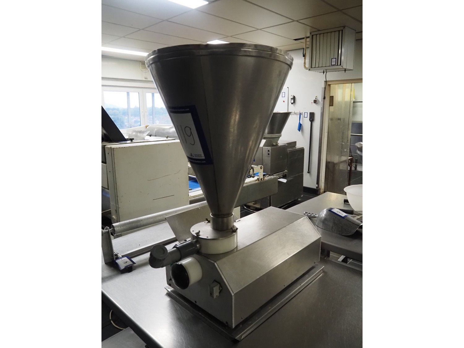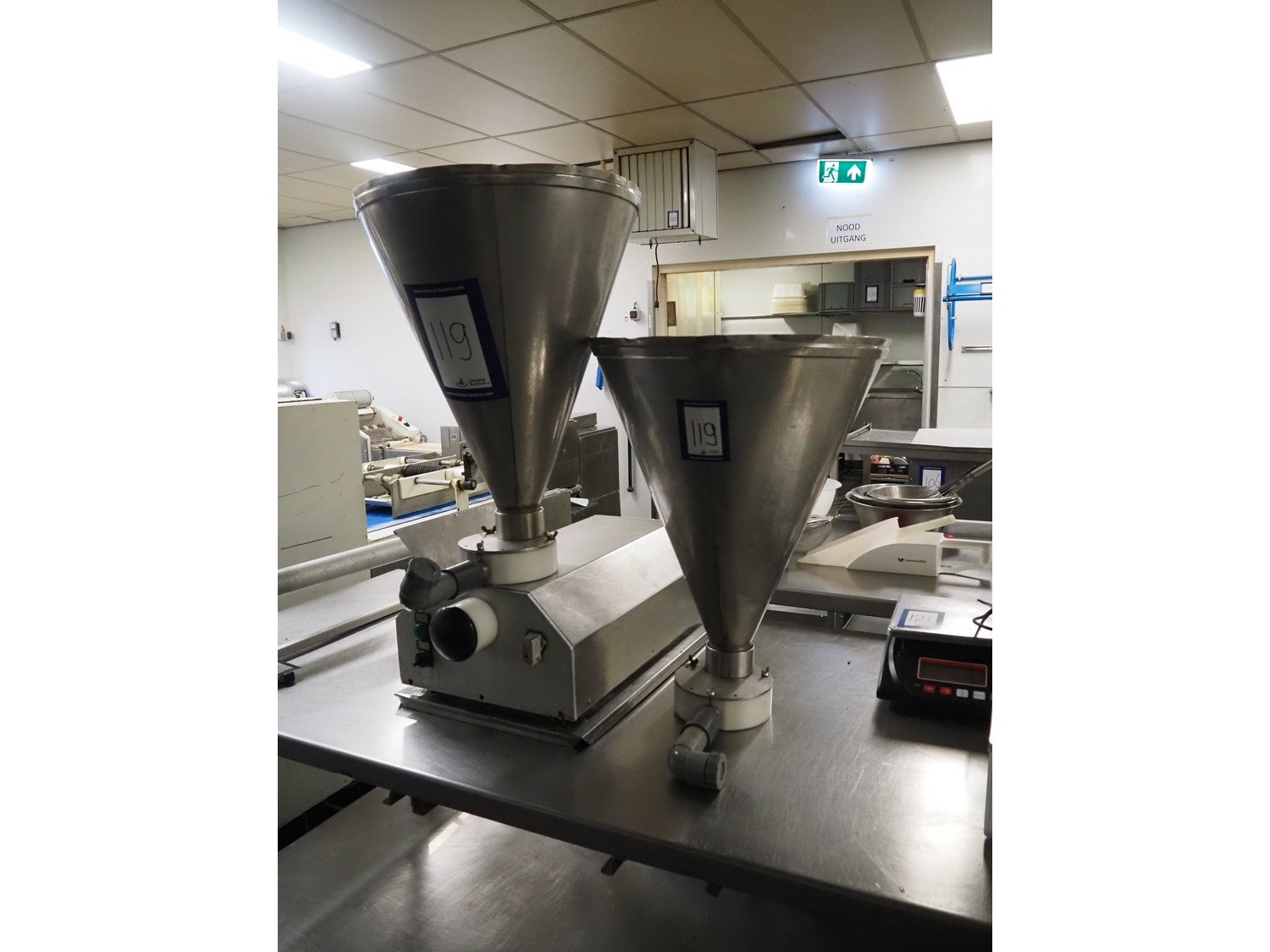 Mimac depositor, model: MDR100-S3, serial number: 034357, year of construction: 2003, 400 V, 50 Hz, funnel: Ø 460 mm x 630 mm, total dimensions: 770 mm x 400 mm x 880 mm. Including extra funnel, dimensions: Ø 470 mm x 635 mm.