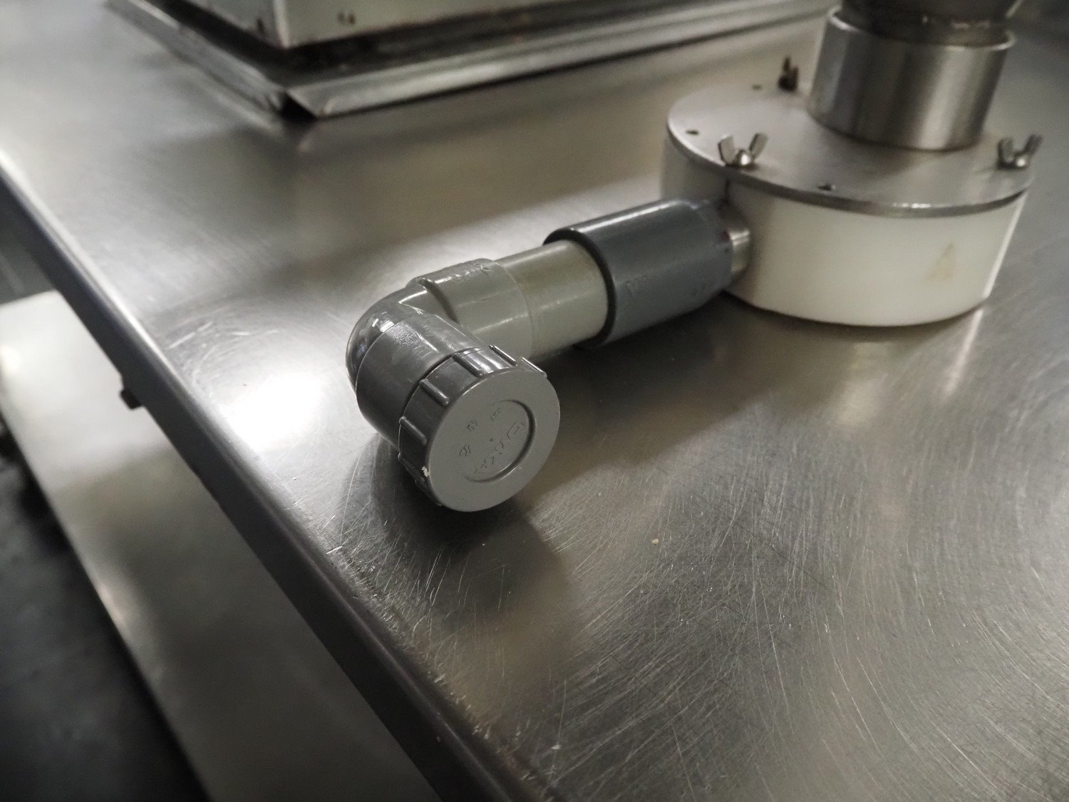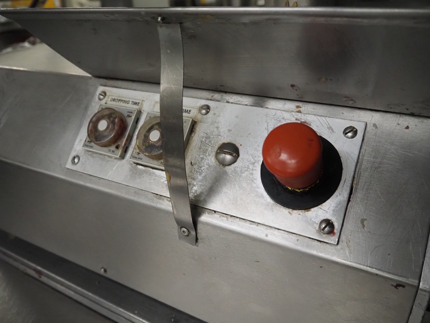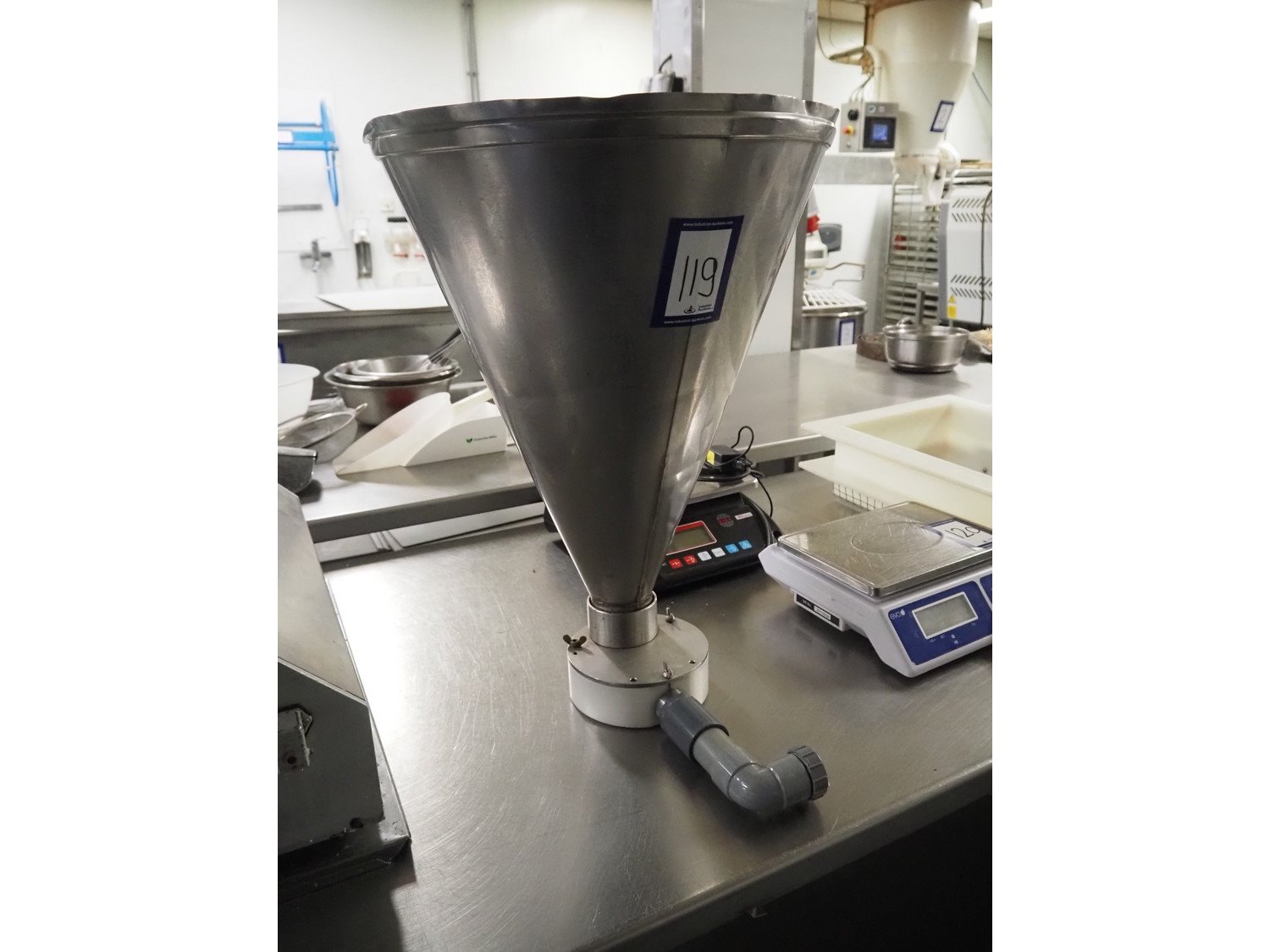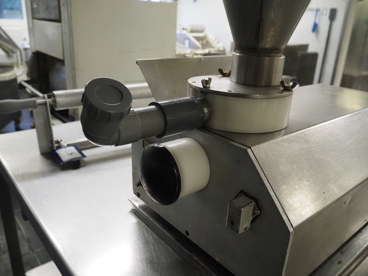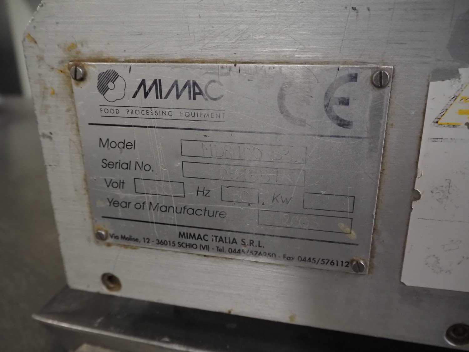 Mimac depositor, model: MDR100-S3, serial number: 034357, year of construction: 2003, 400 V, 50 Hz, funnel: Ø 460 mm x 630 mm, total dimensions: 770 mm x 400 mm x 880 mm. Including extra funnel, dimensions: Ø 470 mm x 635 mm.