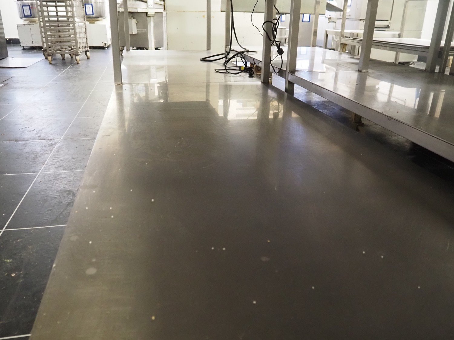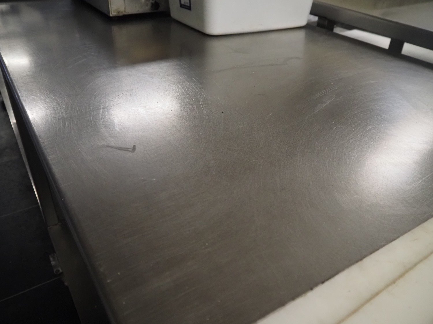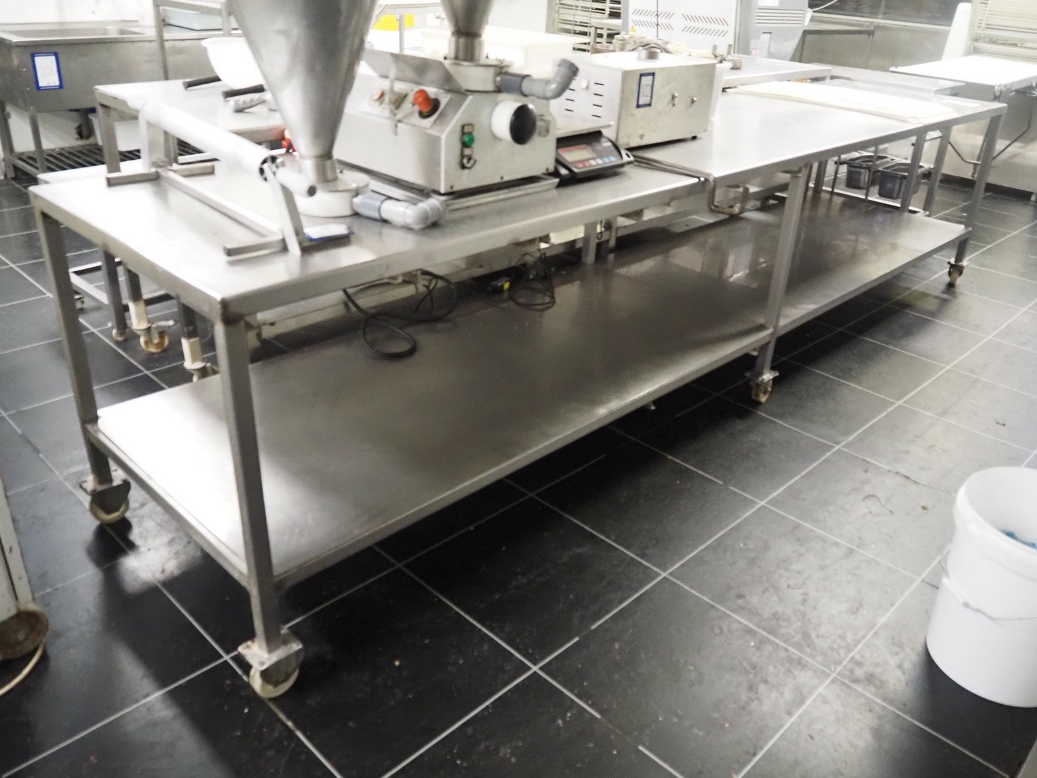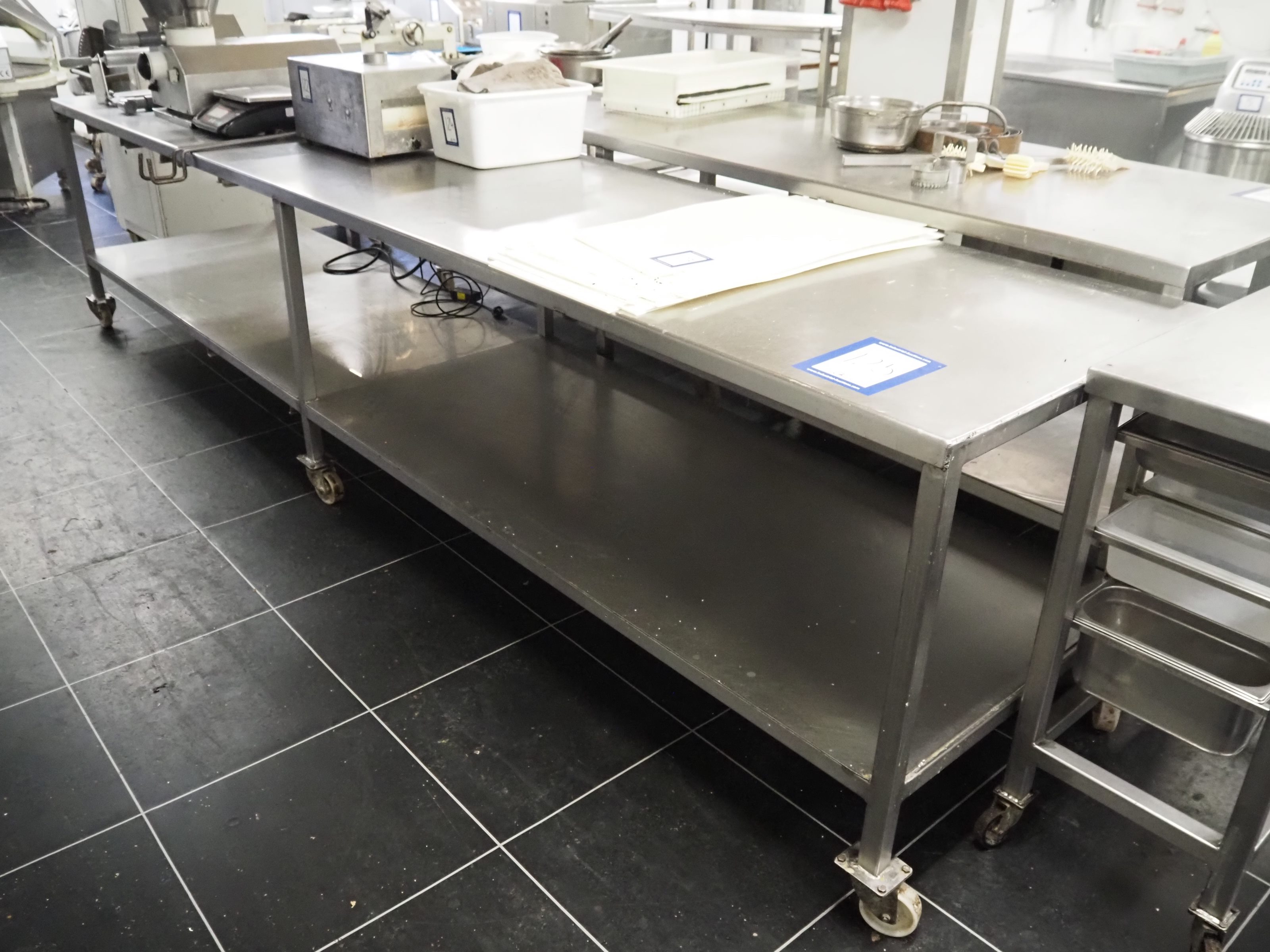 S/s mobile table, dimensions: 3990 mm x 860 mm x 910 mm.