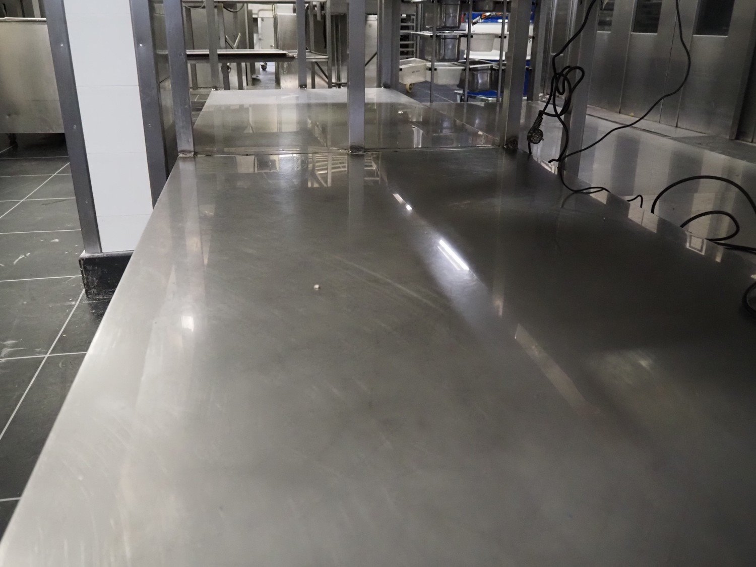 S/s mobile table, dimensions: 3400 mm x 900 mm x 980 mm. Without content.