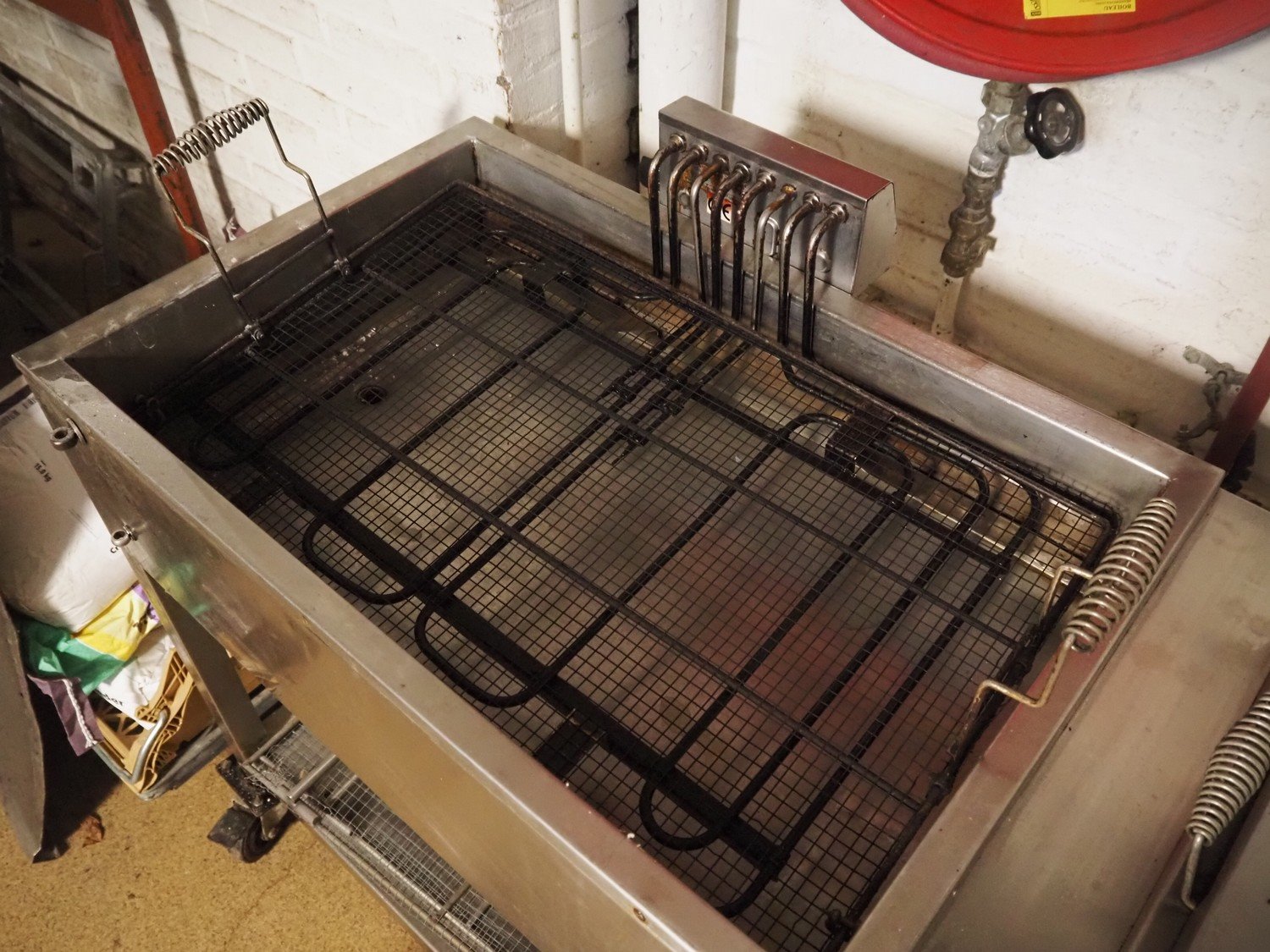 S/s mobile double chamber doughnut fryer, inside dimensions: (2x) 760 mm x 460 mm, total dimensions: 1760 mm x 630 mm x 1000 mm.