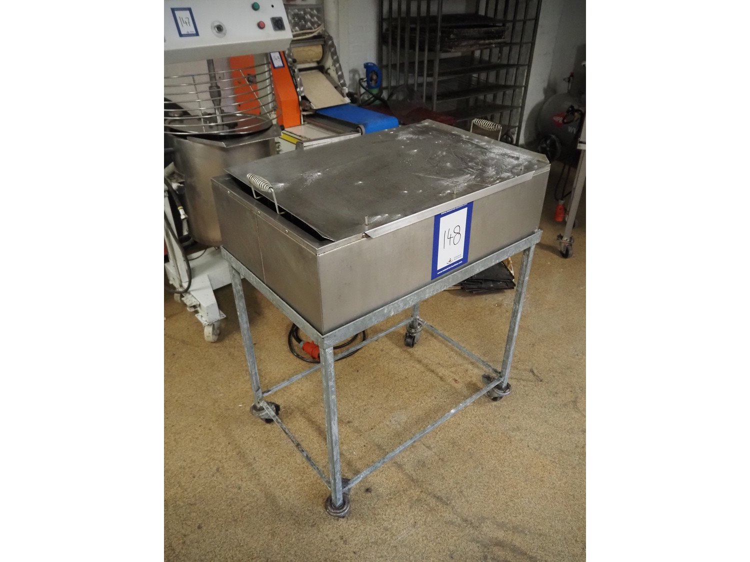 S/s doughnut fryer on trolley, inside dimensions: 760 mm x 460 mm, total dimensions: 940 mm x 560 mm x 1080 mm.