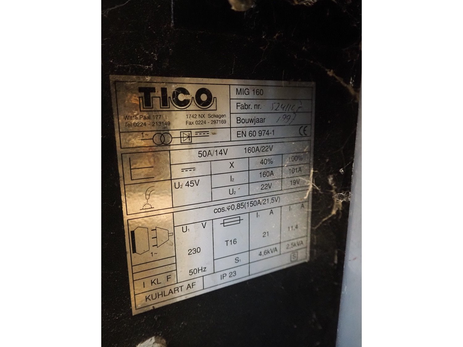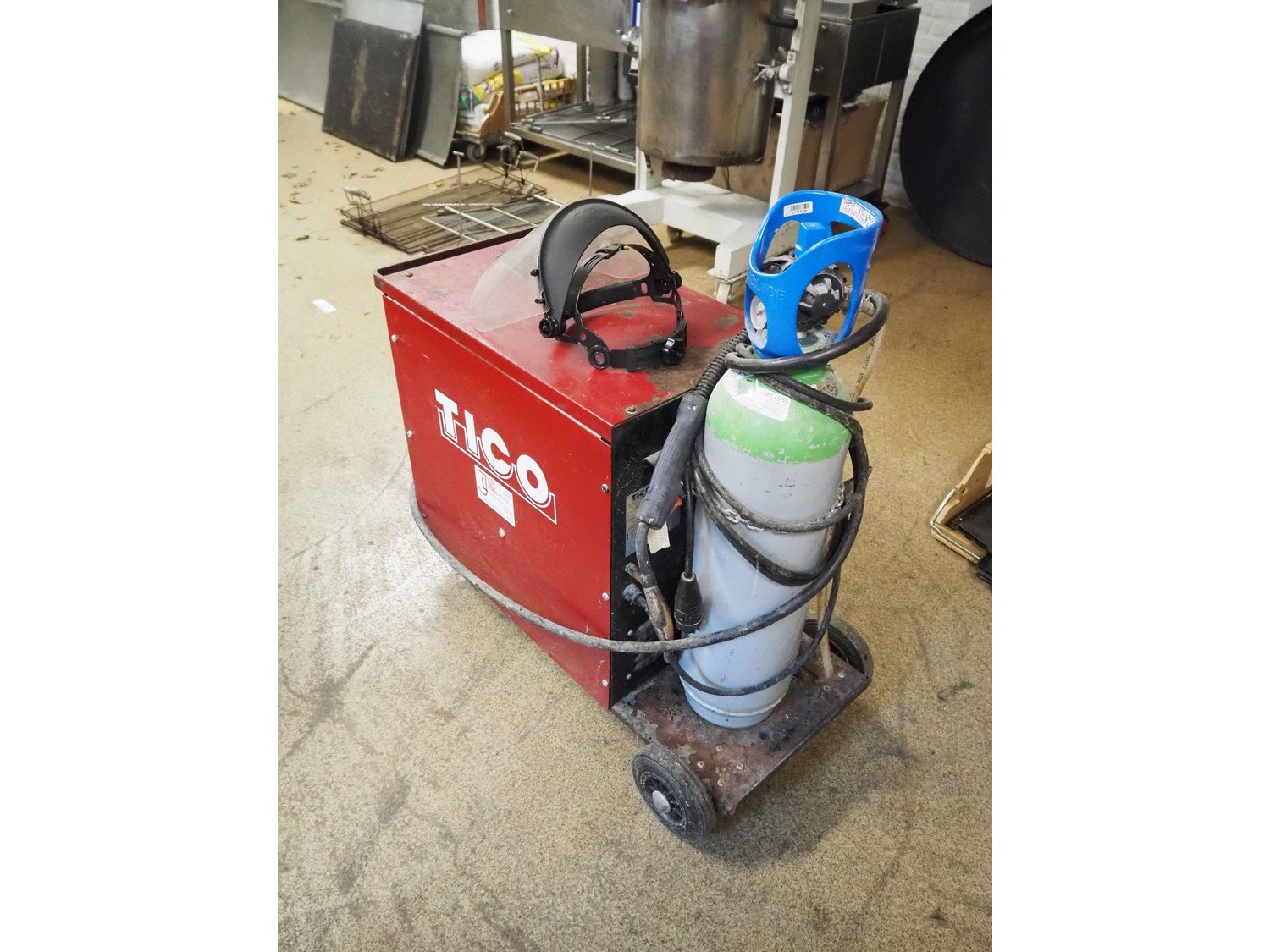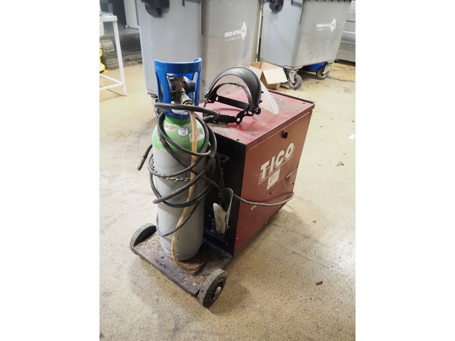 TICO mobile welding machine with gas bottle, model: MIG 160, number: 524110, year of construction: 1997, 230 V, 50 Hz, 21 A, dimensions: 1050 mm x 380 mm x 950 mm.