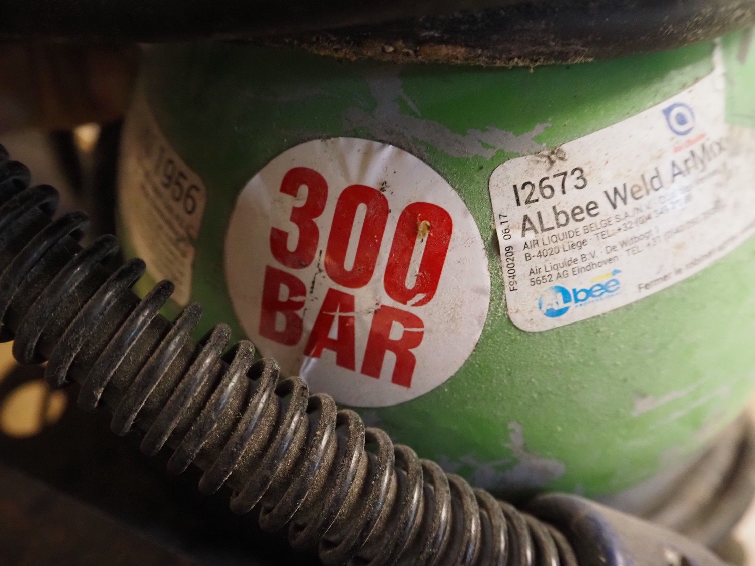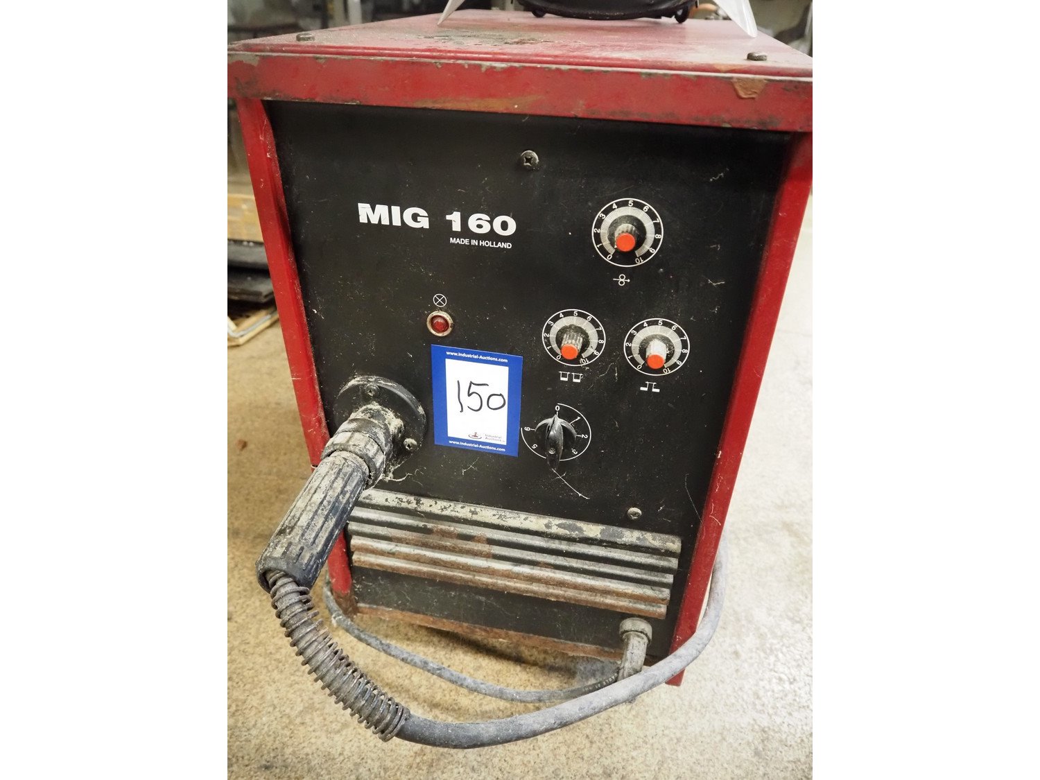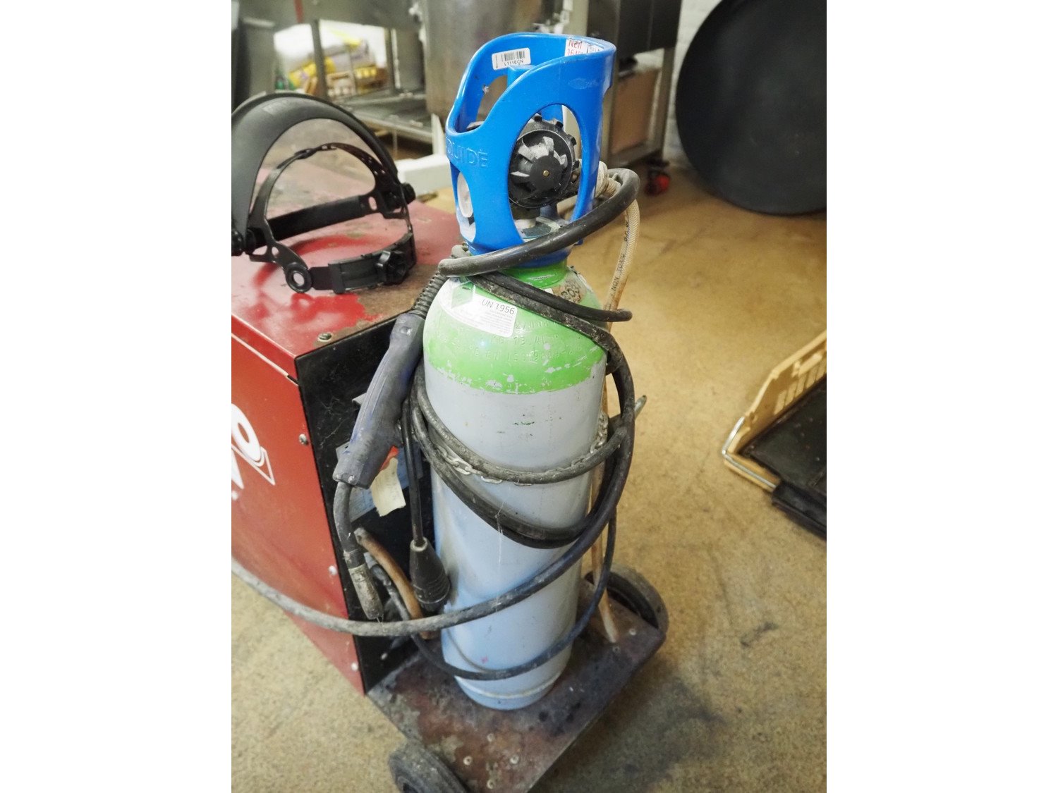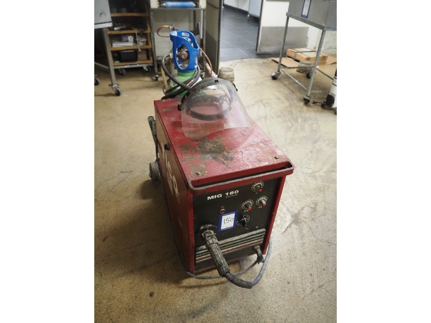 TICO mobile welding machine with gas bottle, model: MIG 160, number: 524110, year of construction: 1997, 230 V, 50 Hz, 21 A, dimensions: 1050 mm x 380 mm x 950 mm.