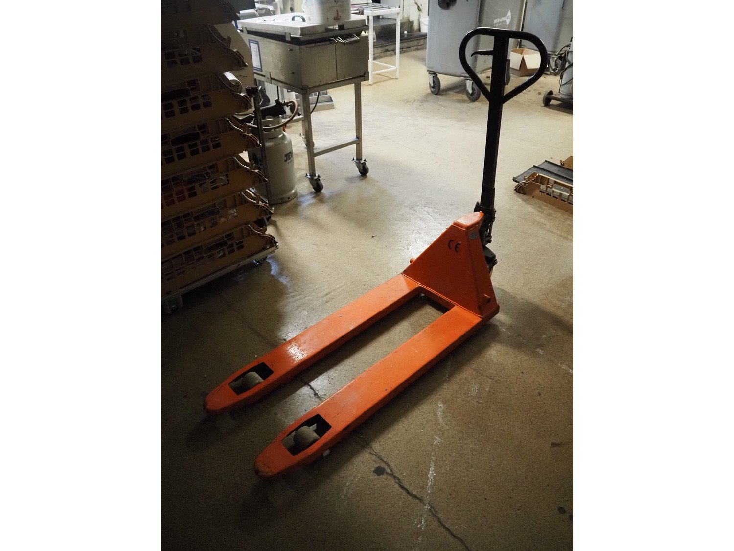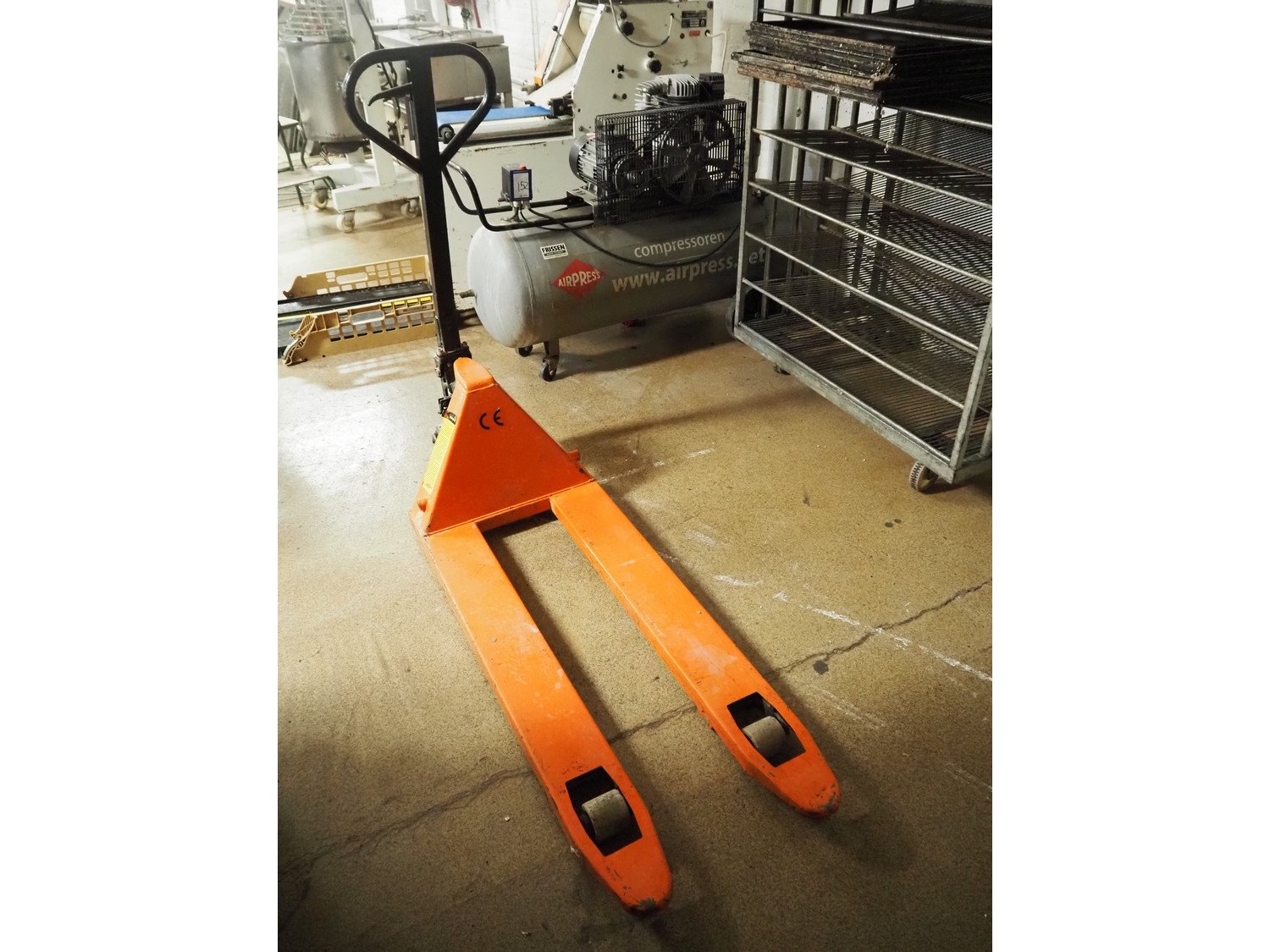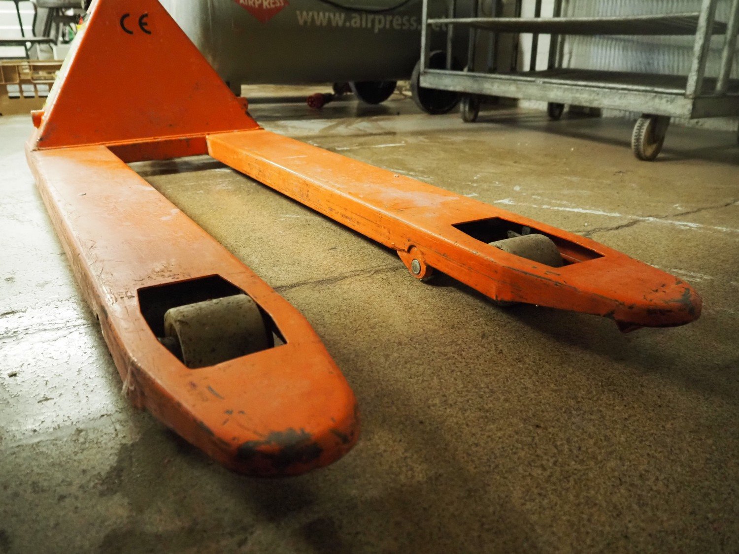 E. Jenissen pallet lifter, fork length 1150 mm, fork width: 510 mm, distance between forks: 220 mm, total dimensions: 1450 mm x 520 mm x 1200 mm.
