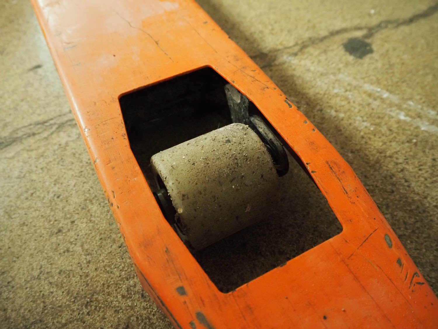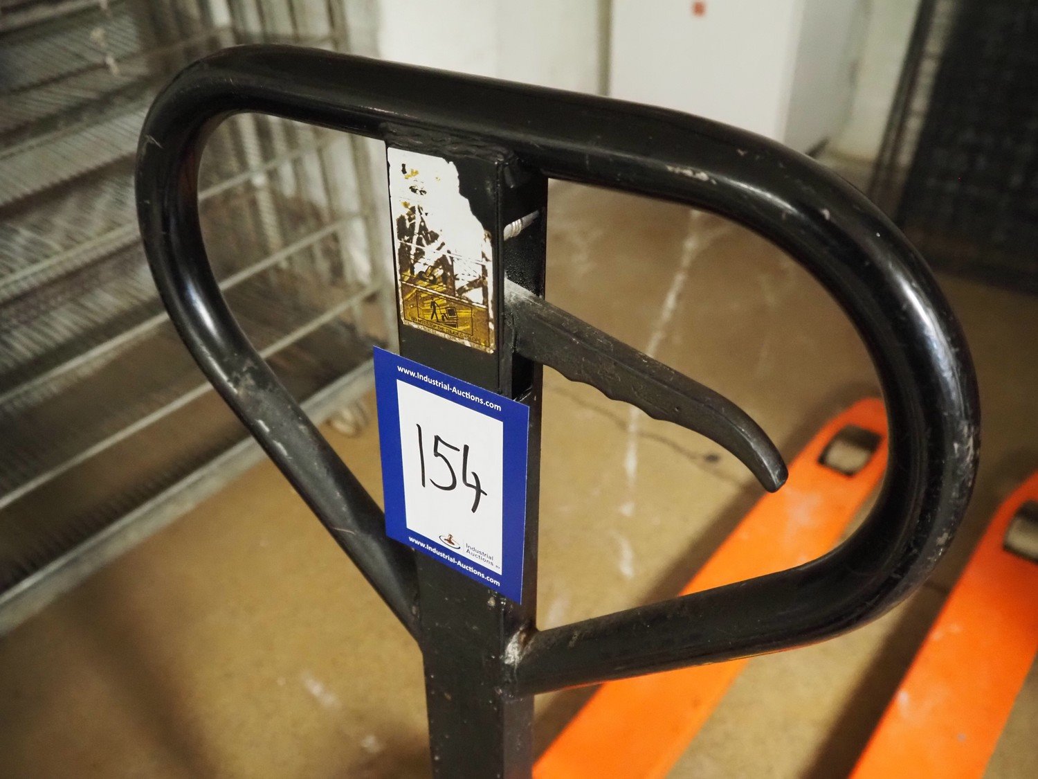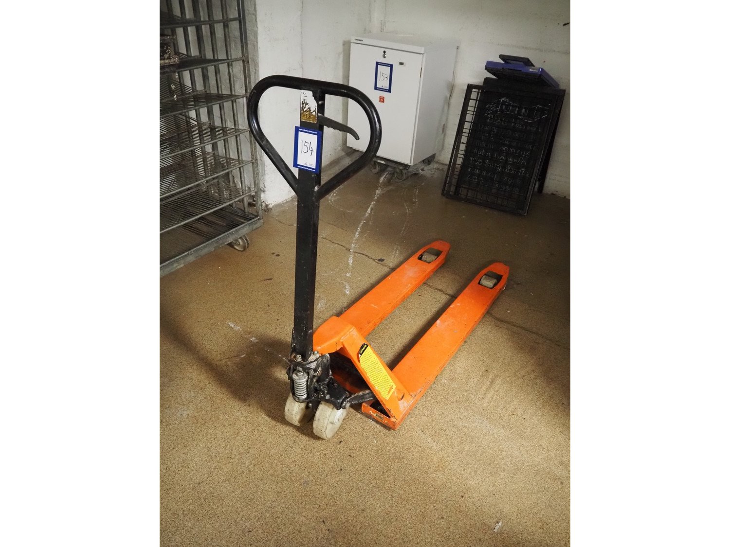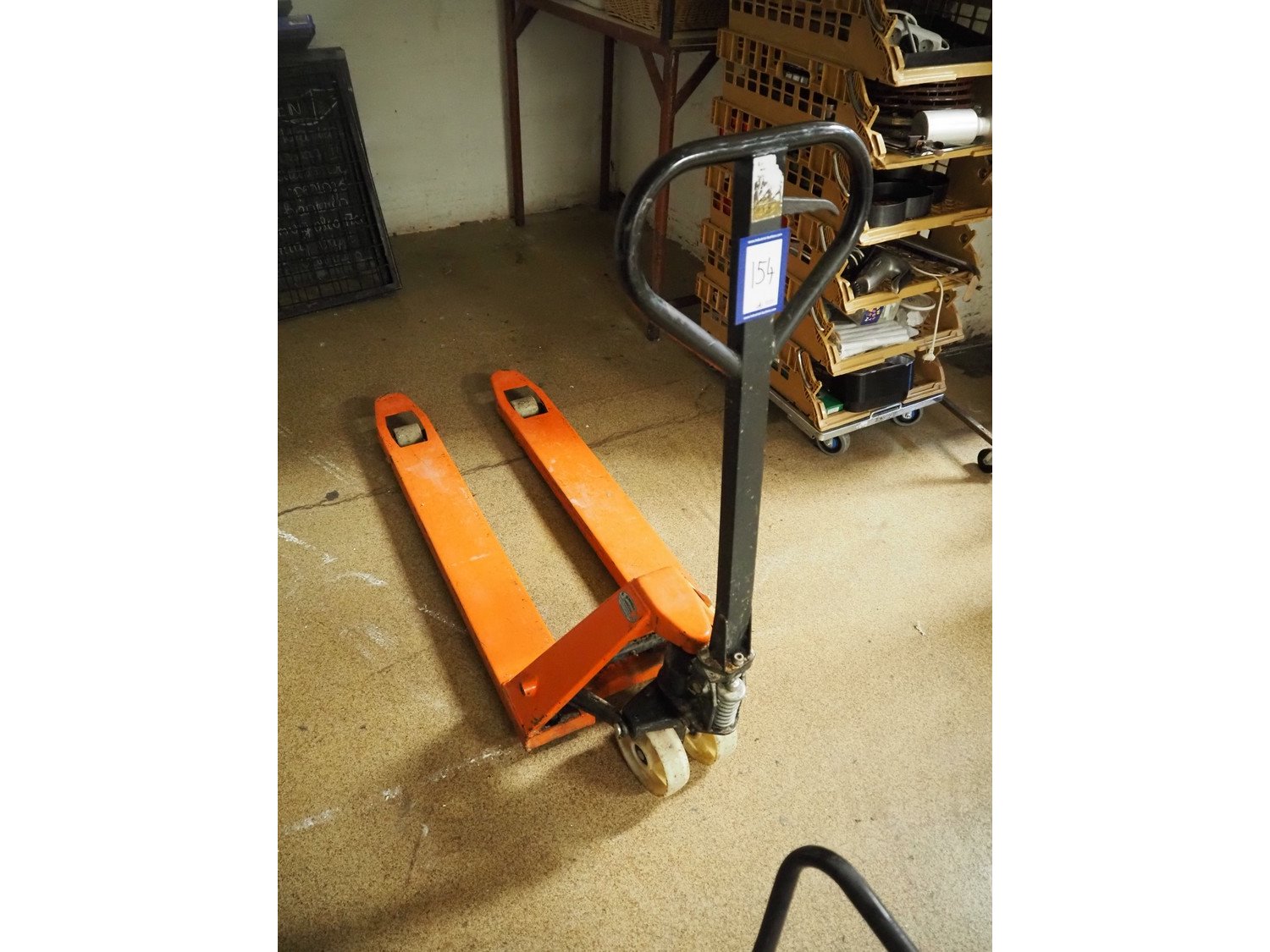 E. Jenissen pallet lifter, fork length 1150 mm, fork width: 510 mm, distance between forks: 220 mm, total dimensions: 1450 mm x 520 mm x 1200 mm.