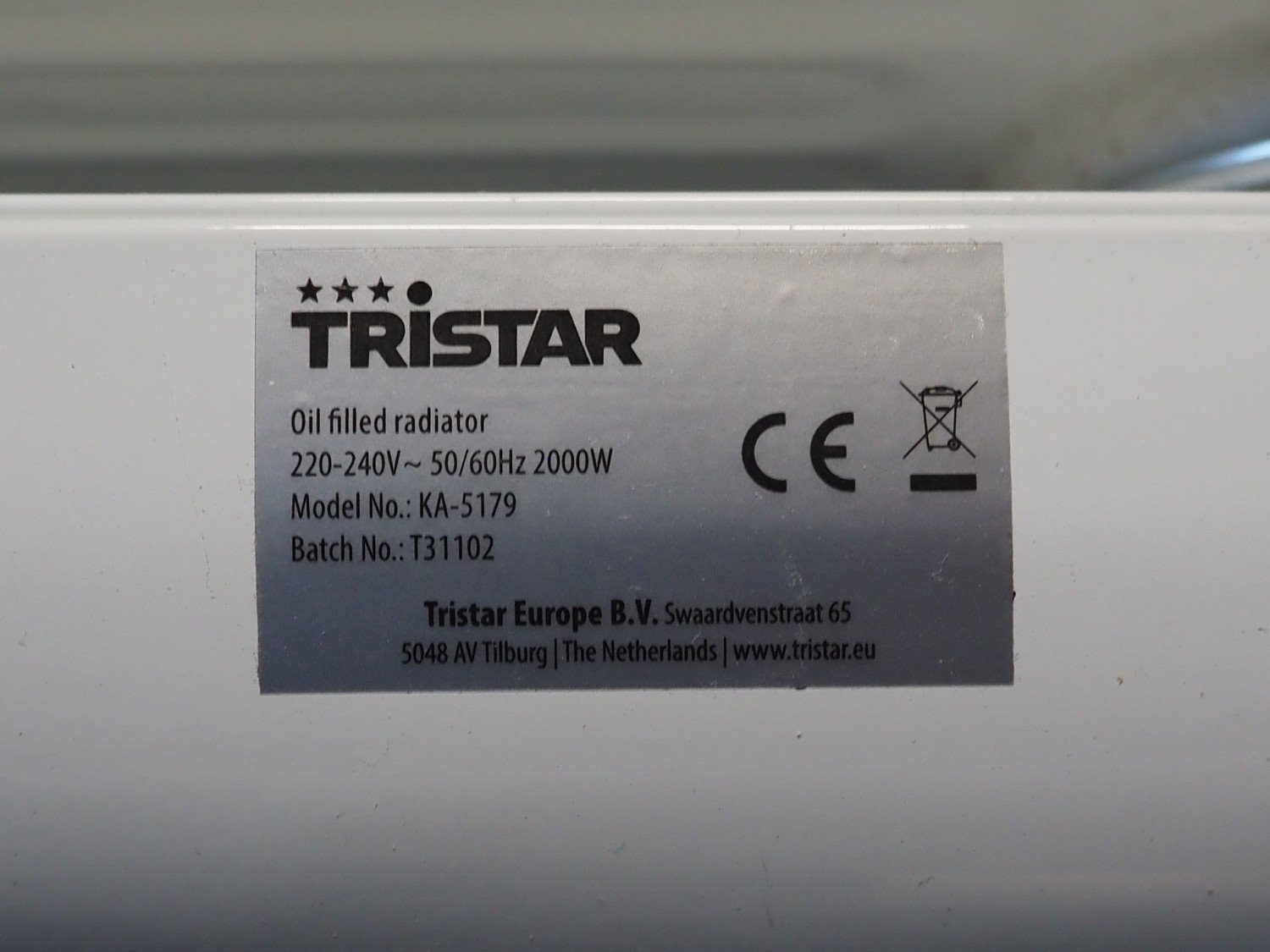 Tristar oil filled radiator, model number: KA-5179, batch number: T31102, 220/240V, 50/60 Hz, 2000 Watt, dimensions: 350 mm x 250 mm x 600 mm.