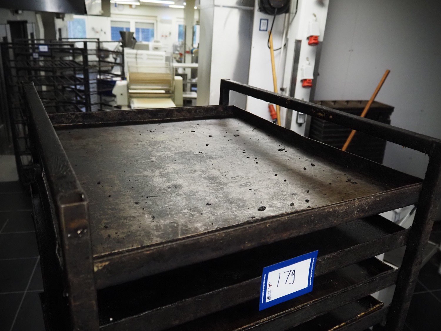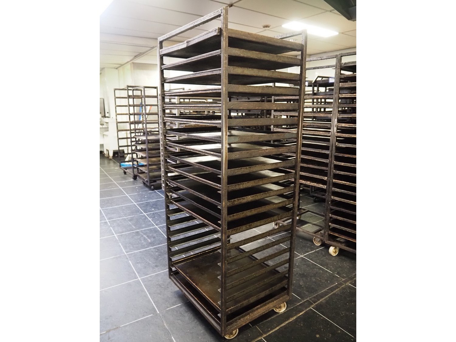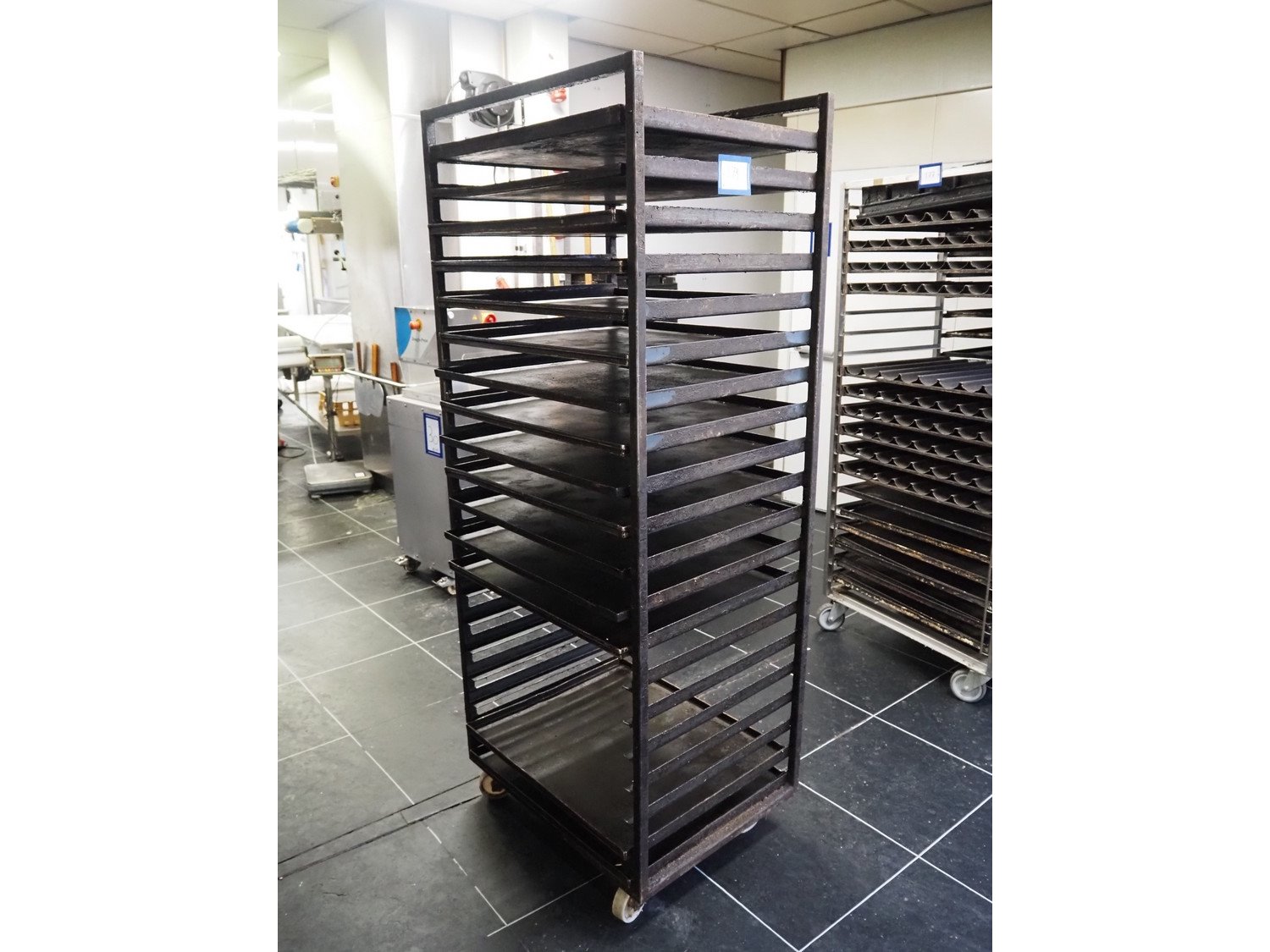4 trolleys with plates, 20 floors, floor dimensions: (20x) 700 mm x 600 mm, total dimensions: (4x) 760 mm x 600 mm x 1910 mm.