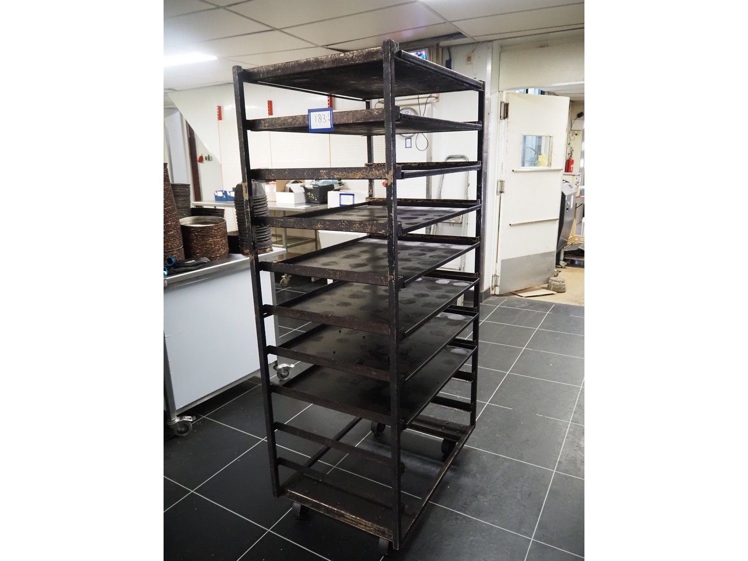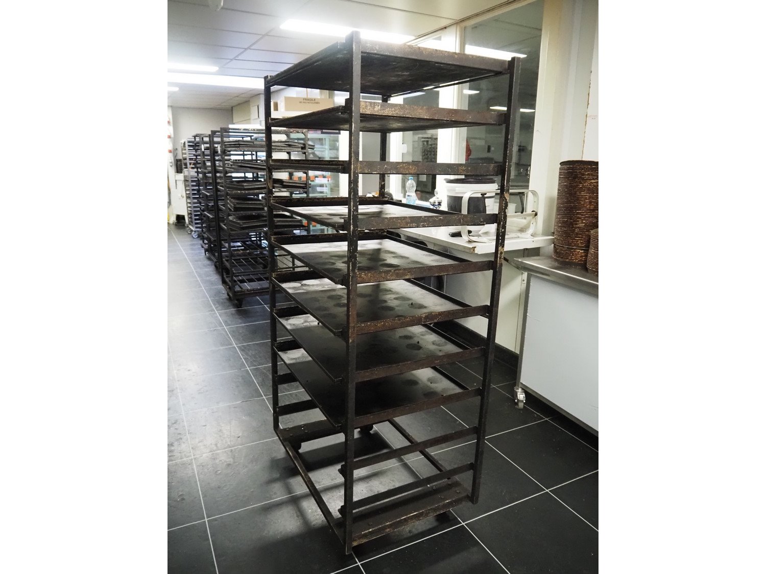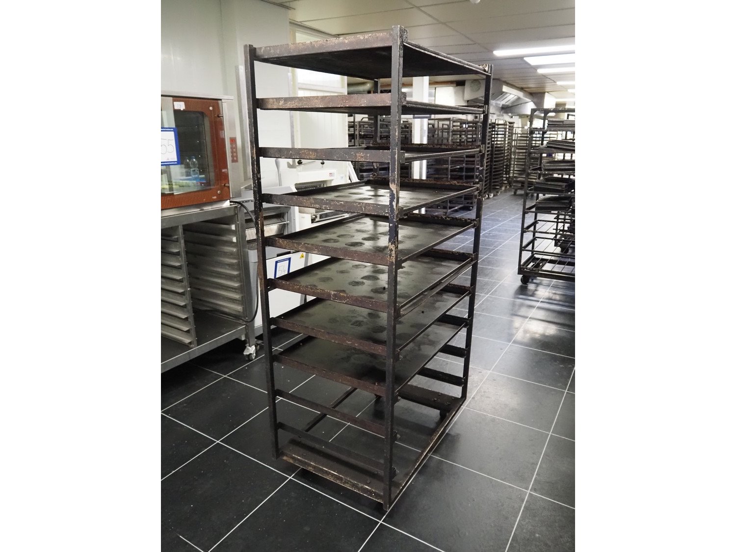Trolley with plates, 10 floors, floor dimensions: (10x) 800 mm x 600 mm, total dimensions: 940 mm x 610 mm x 1840 mm.