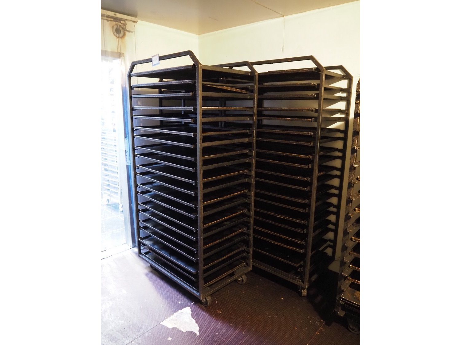 3 trolleys with plates, 10 floors, floor dimensions: (10x) 800 mm x 570 mm, total dimensions: (3x) 940 mm x 600 mm x 1910 mm.