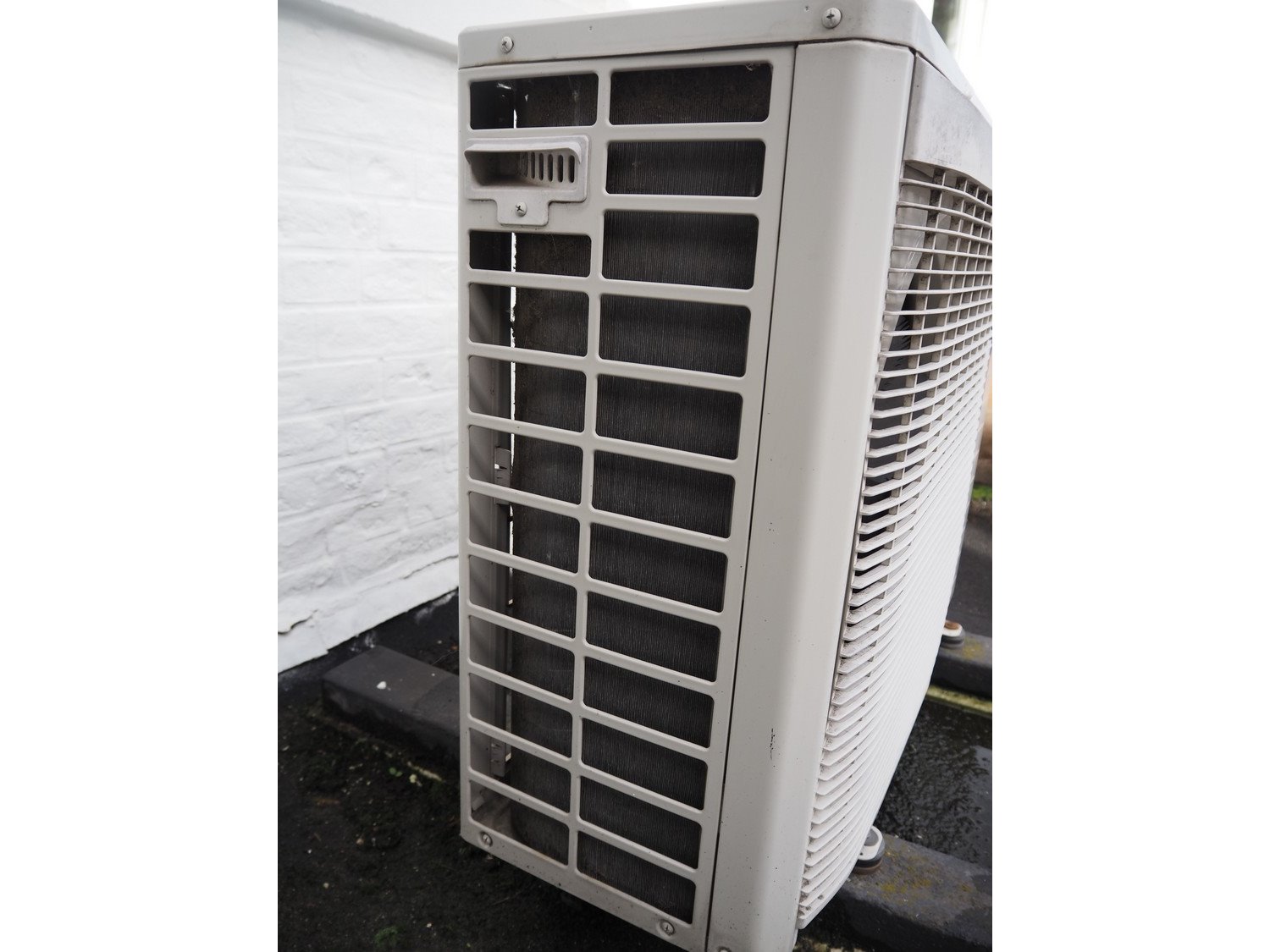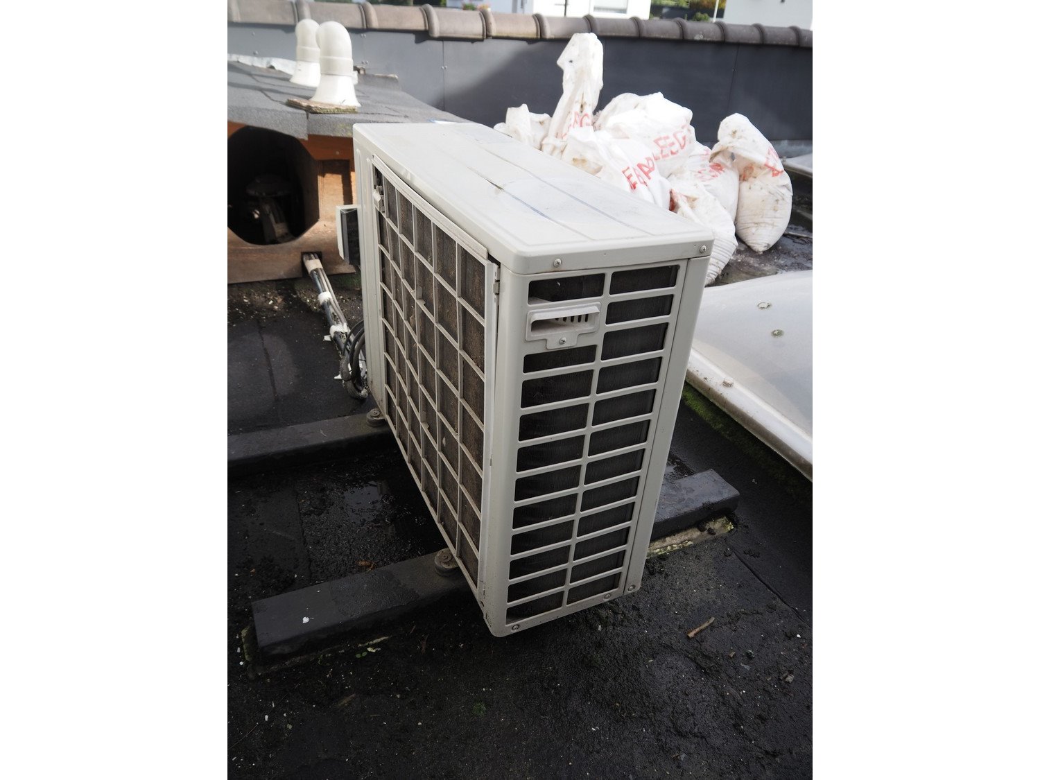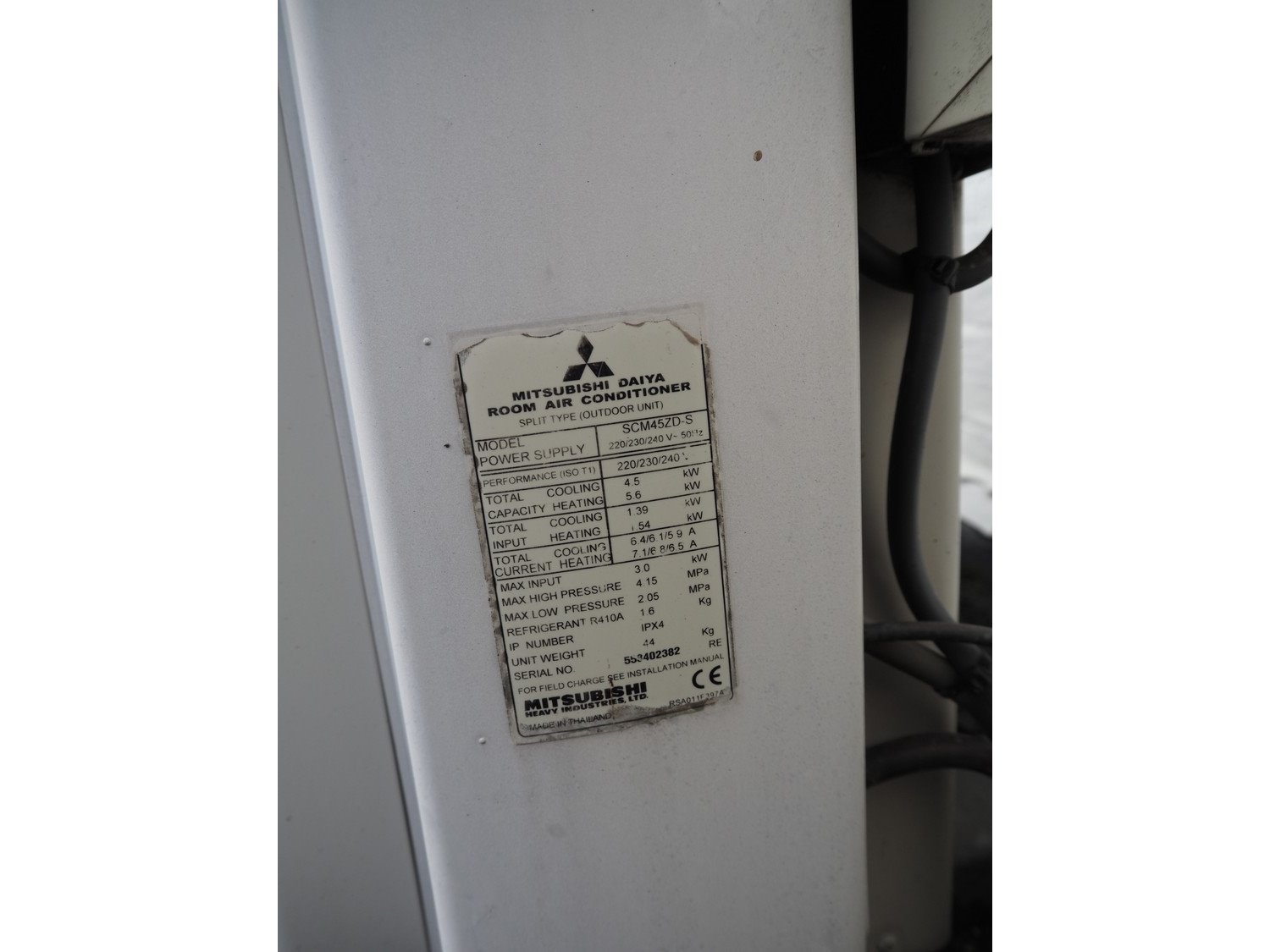 Mitsubishi outside unit for airconditioning, model: SCM45ZD-S, serial number: 553402382, 220/230/240 V, 50 Hz, 4.5 kW, weight: 44 kg, refrigerant: R410A, dimensions: 900 mm x 320 mm x 650 mm.