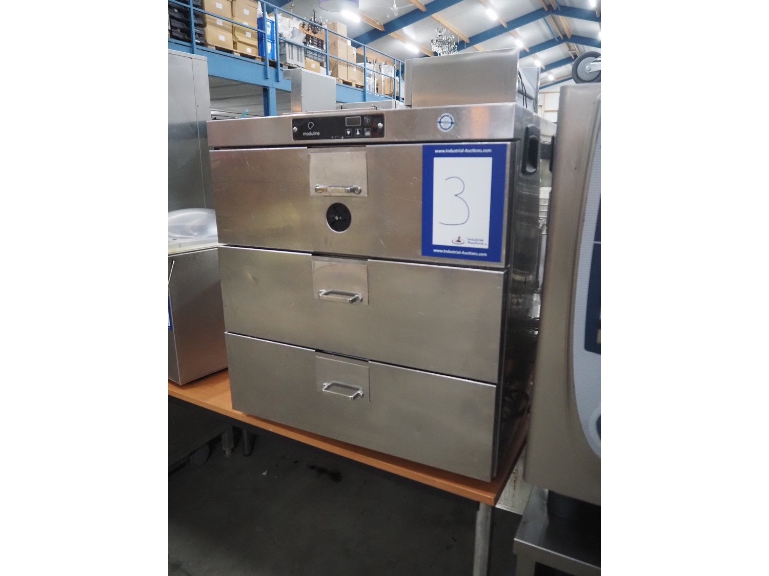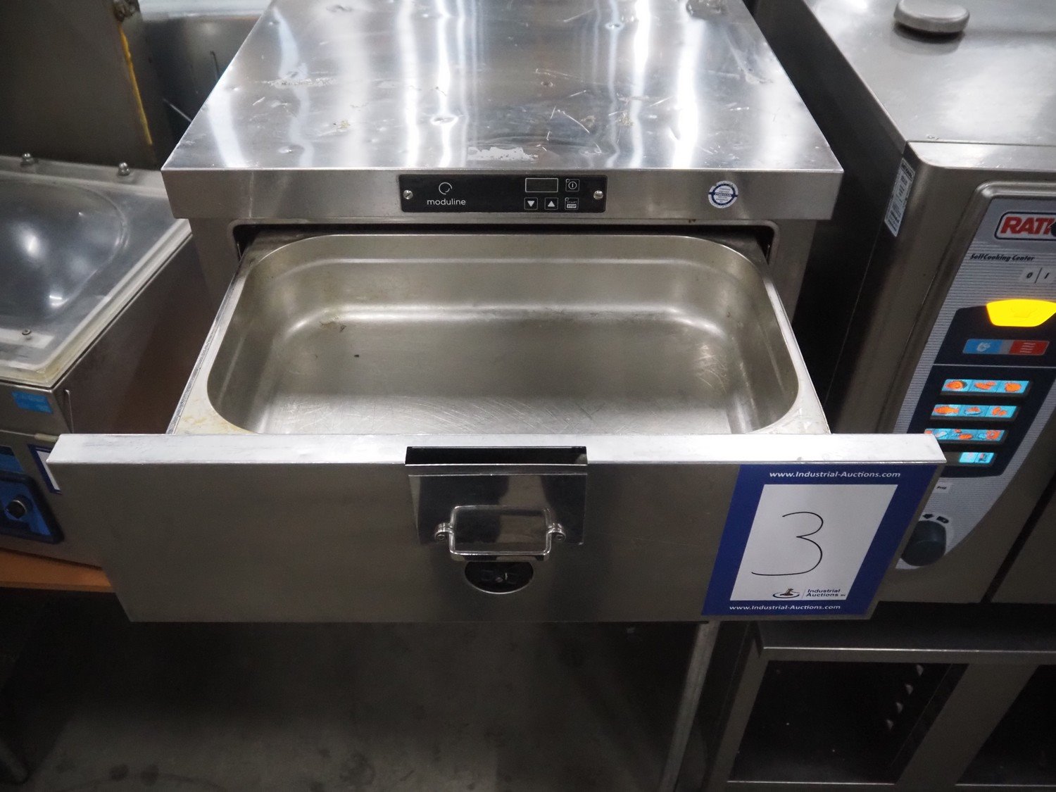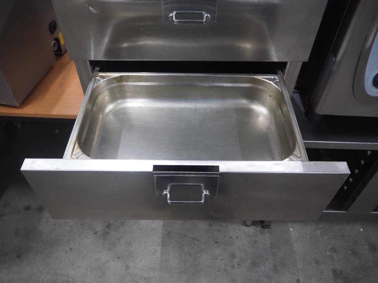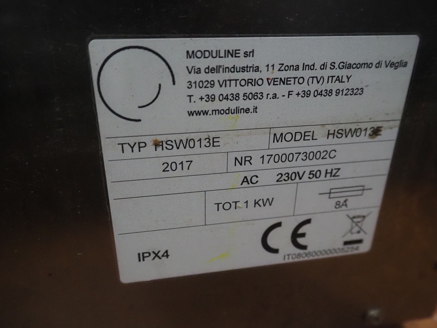 Moduline srl heating cabinet, type: HSW013E, number: 1700073002C, year of construction: 2017, 230 V, 50 Hz, 8 A, 1 kW, 3 drawers, drawer dimensions: (3x) 500 mm x 290 mm x 100 mm, total dimensions: 660 mm x 600 mm x 720 mm.