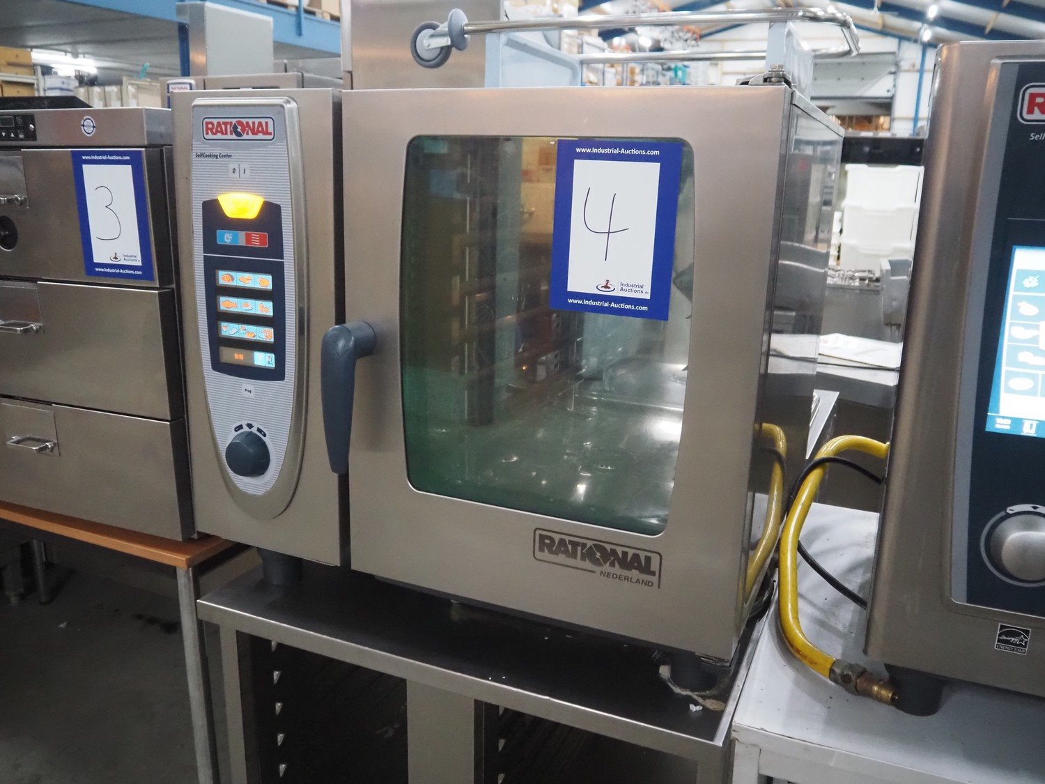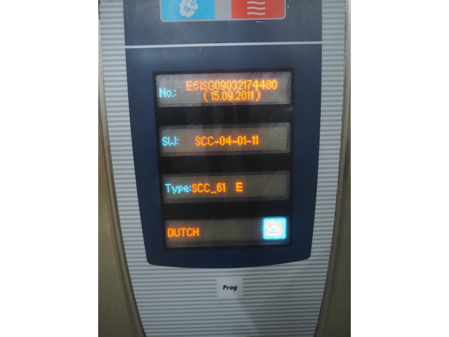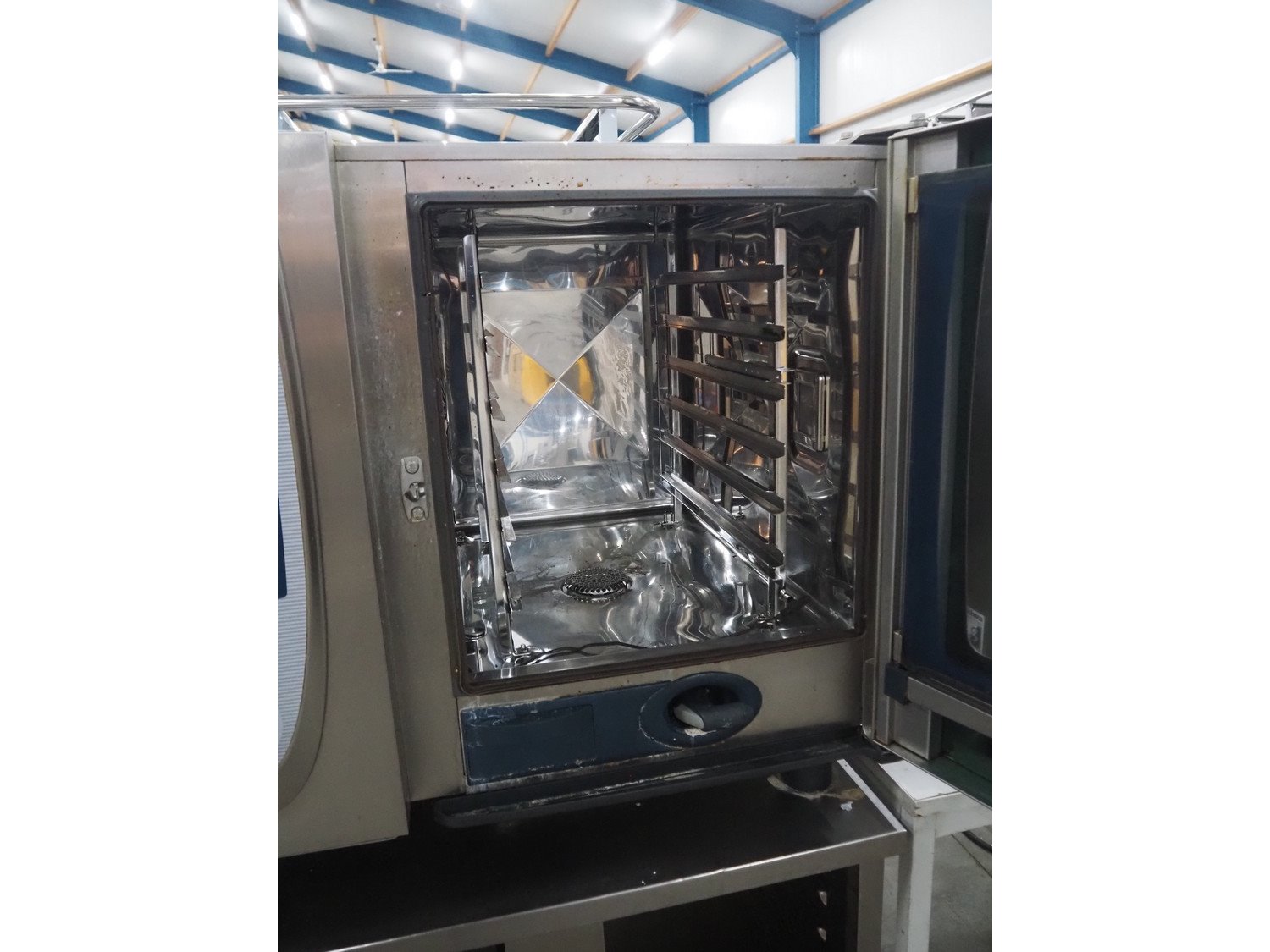 Rational combi steamer on s/s frame, type: SCC61 E, serial number: E61SG09032174480, year of construction: 2009 230 V, 11 kW, electric heated, 6 floors, floor dimensions: 540 mm x 330 mm, total dimensions: 850 mm x 800 mm x 1500 mm.