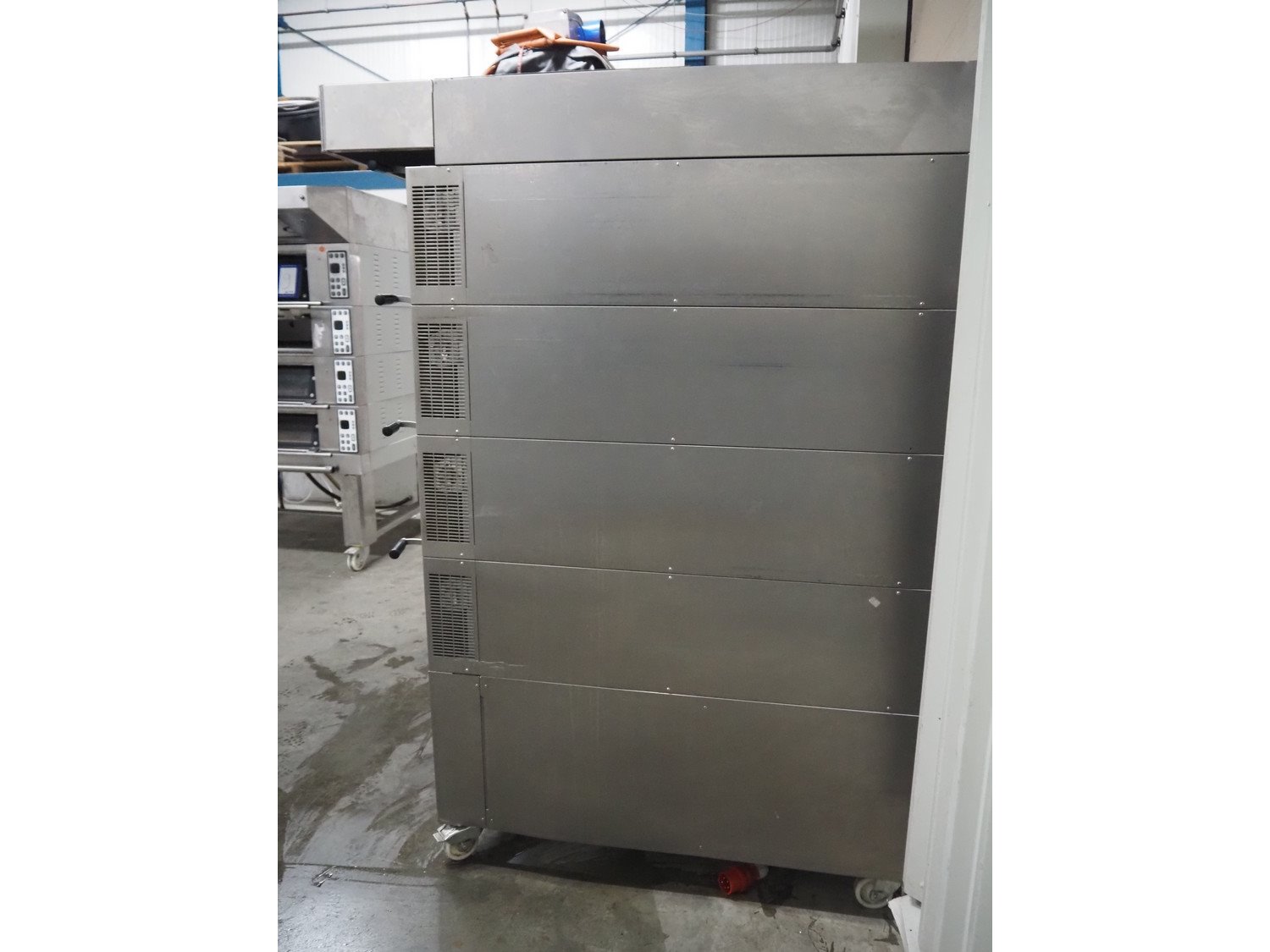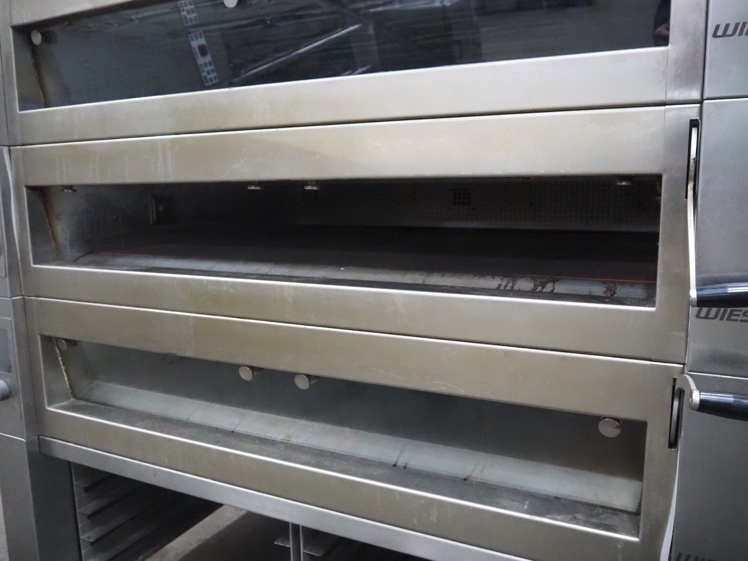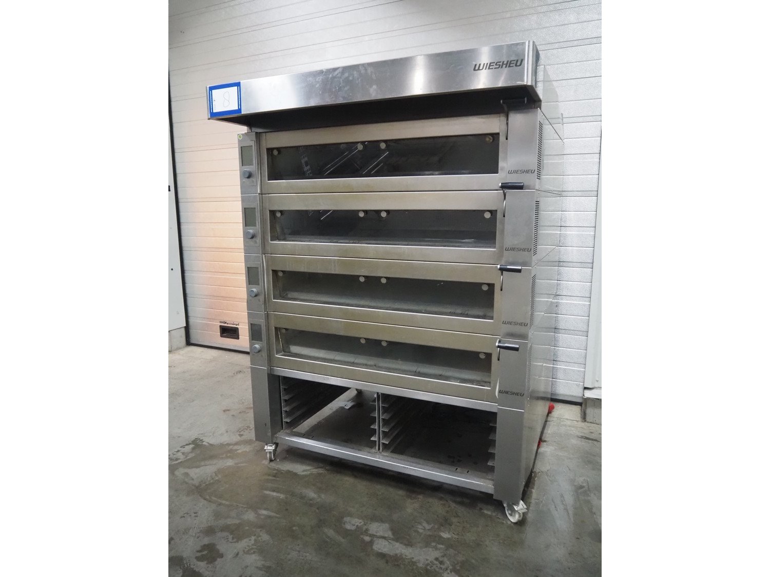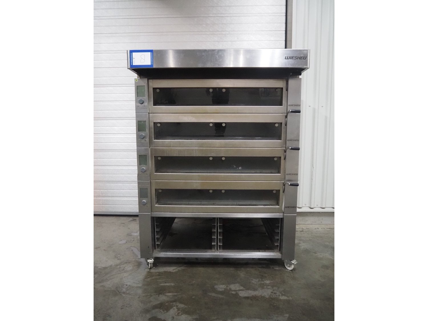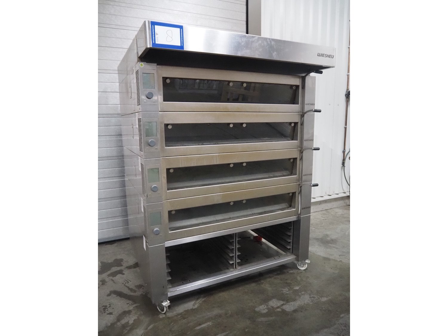 Wiesheu GmbH mobile deck oven, type: EBO 1 128 B, serial numbers: 10221990/10221991/10221992/10221993, year of construction: 2012-11, 400 V, 3 Ph, 50/60 Hz, 15.1 A, 10.45 kW, 4 decks, deck dimensions: 1200 mm x 1000 mm x 150 mm, total dimensions: 1550 mm x 1550 mm x 2080 mm.