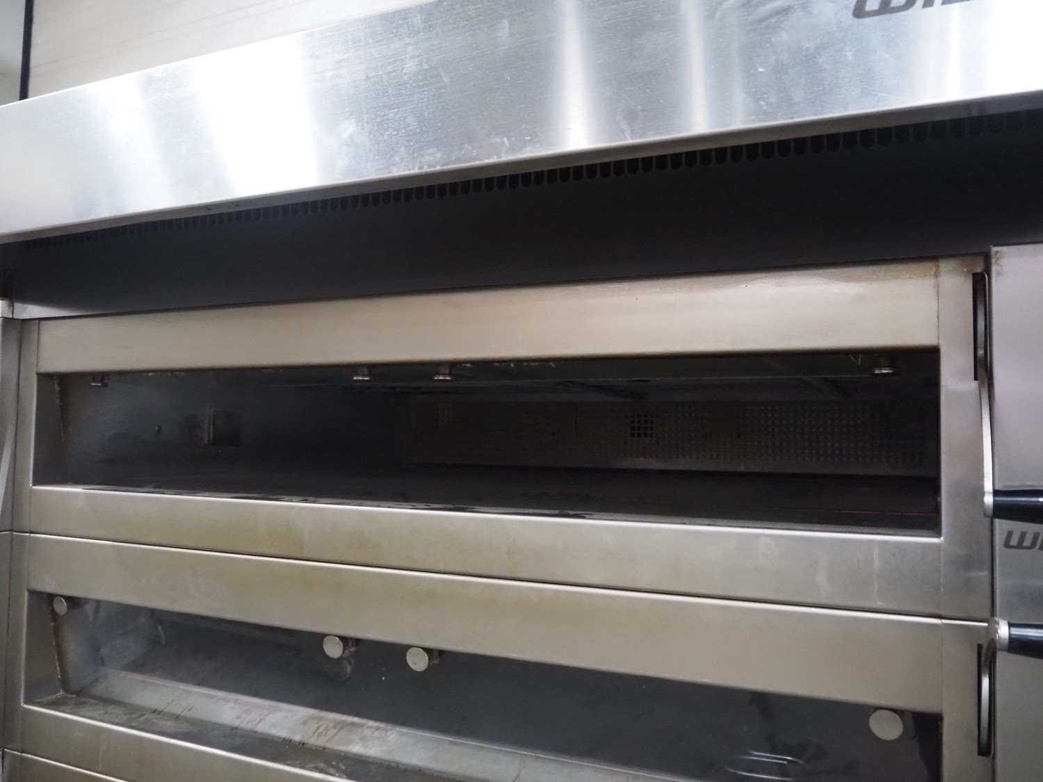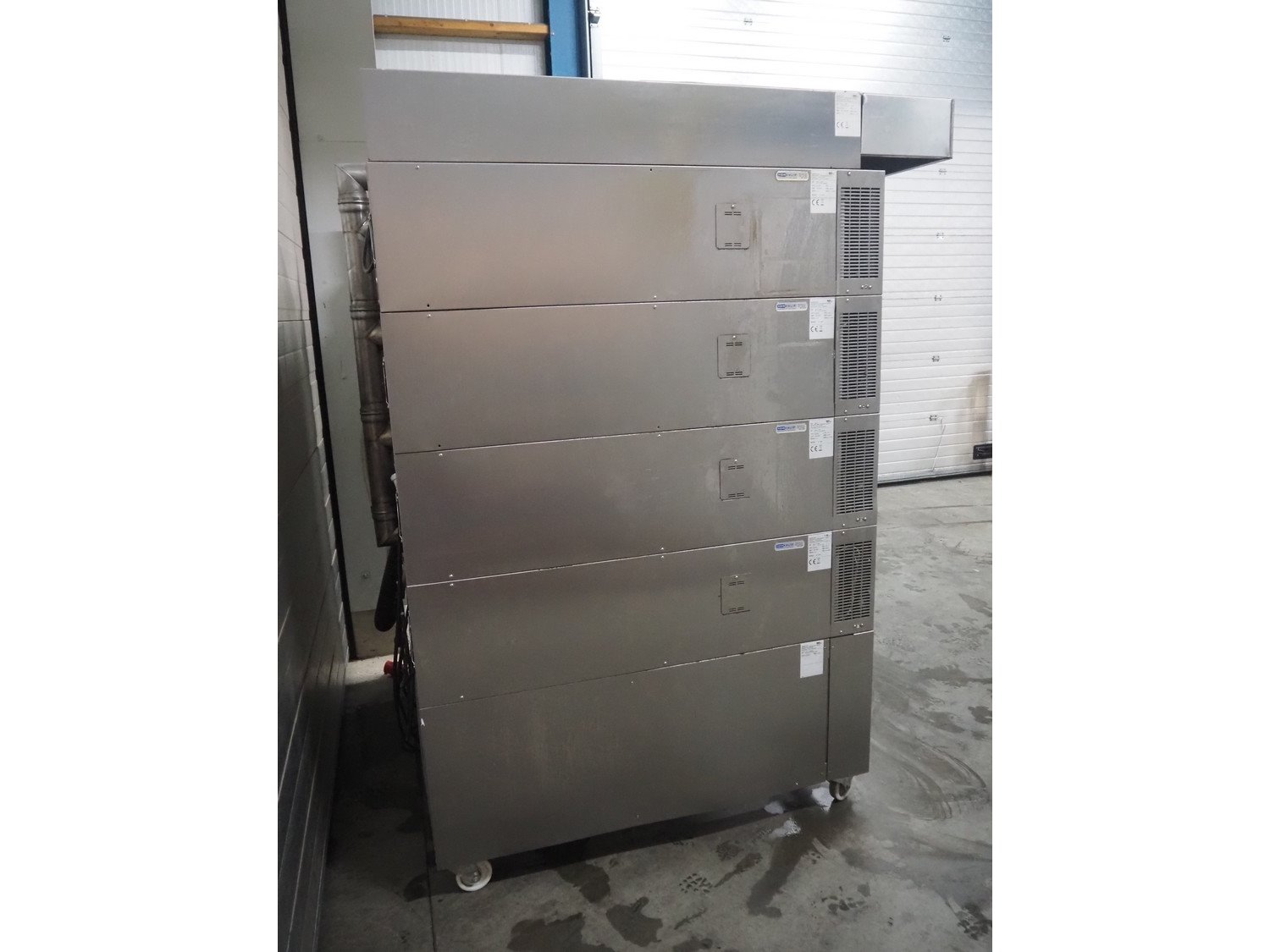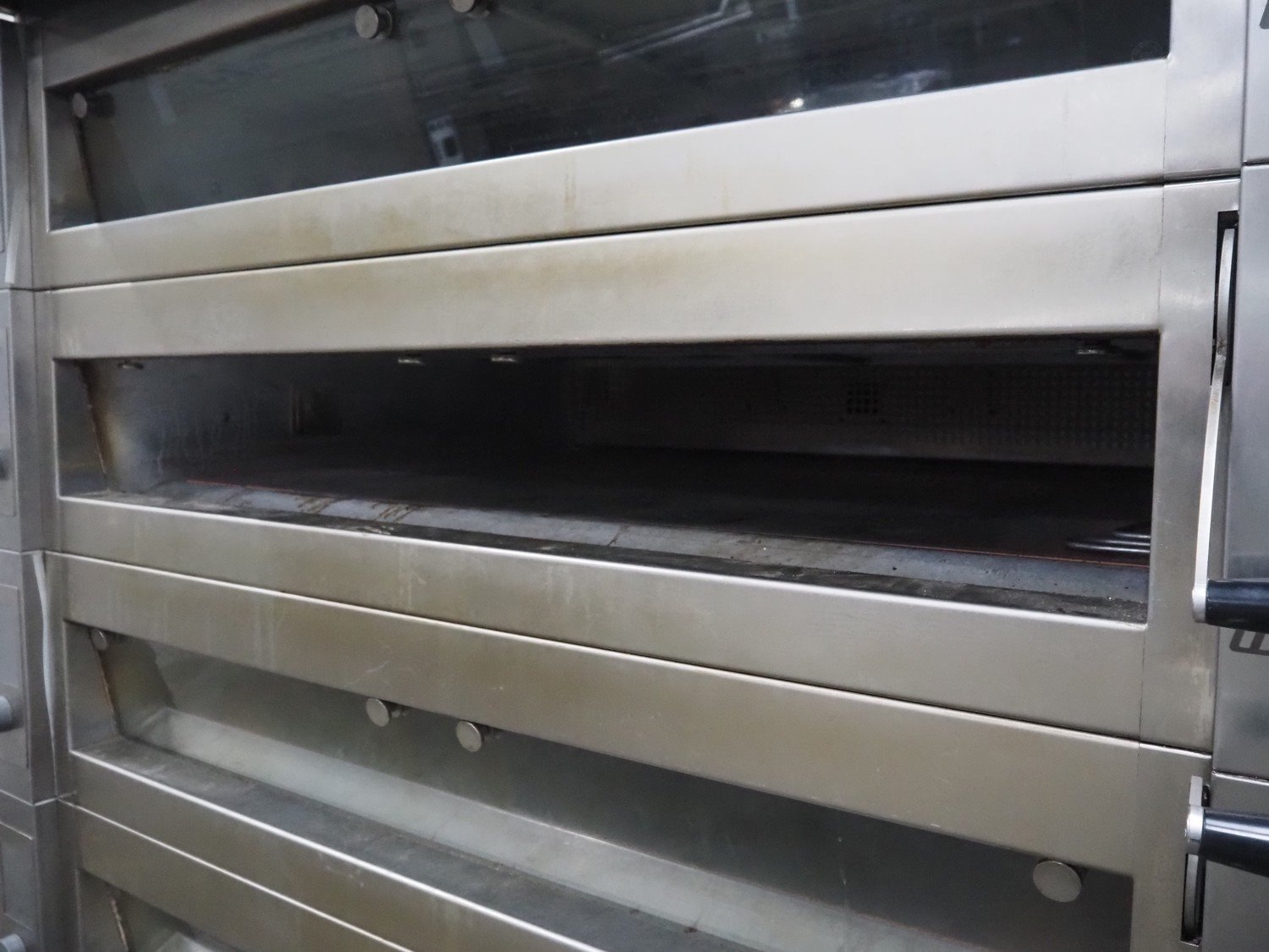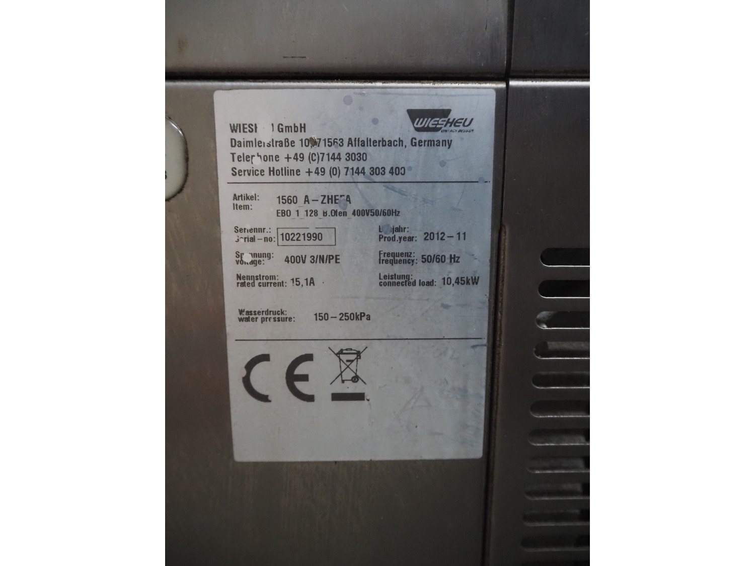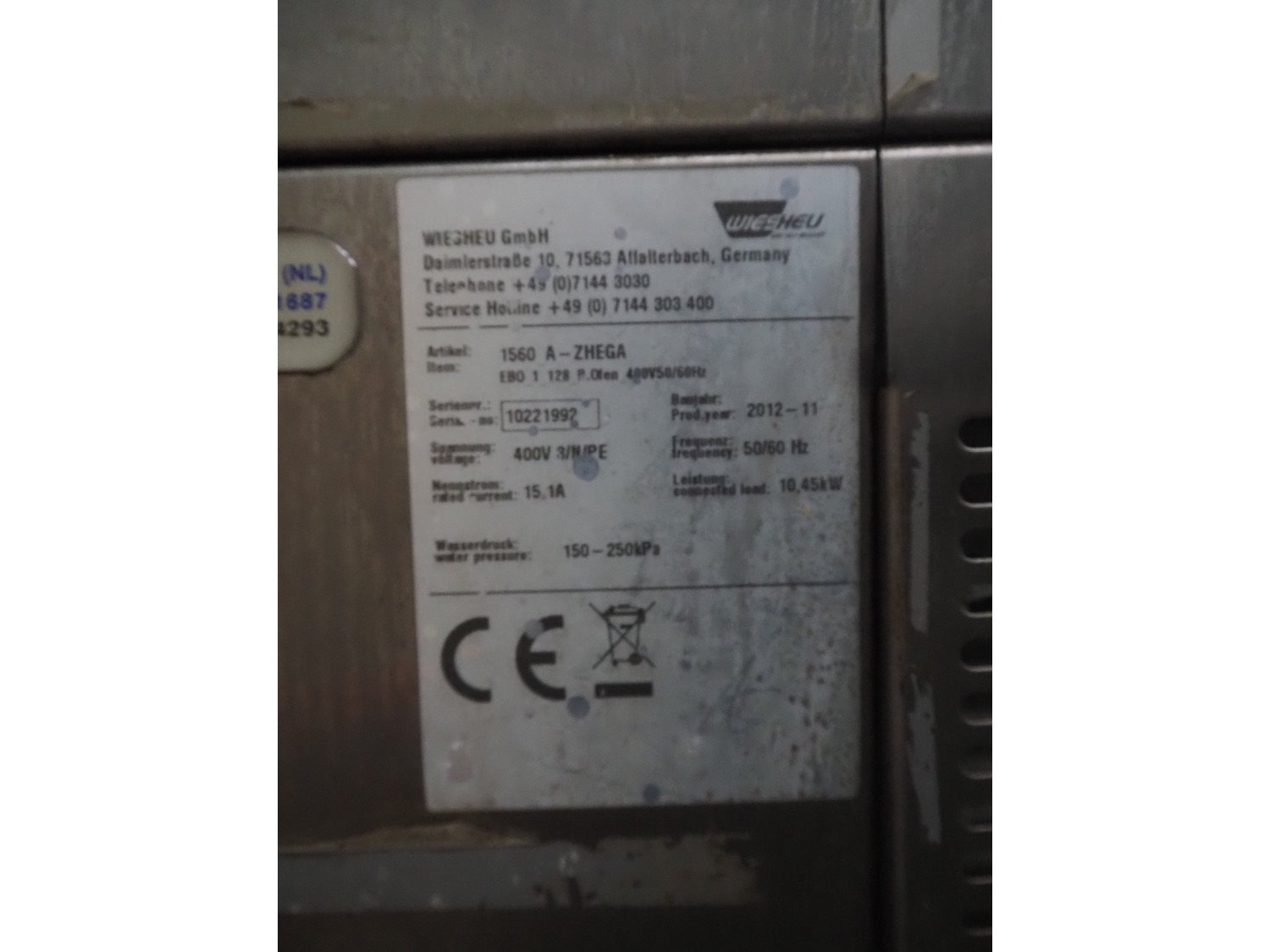 Wiesheu GmbH mobile deck oven, type: EBO 1 128 B, serial numbers: 10221990/10221991/10221992/10221993, year of construction: 2012-11, 400 V, 3 Ph, 50/60 Hz, 15.1 A, 10.45 kW, 4 decks, deck dimensions: 1200 mm x 1000 mm x 150 mm, total dimensions: 1550 mm x 1550 mm x 2080 mm.
