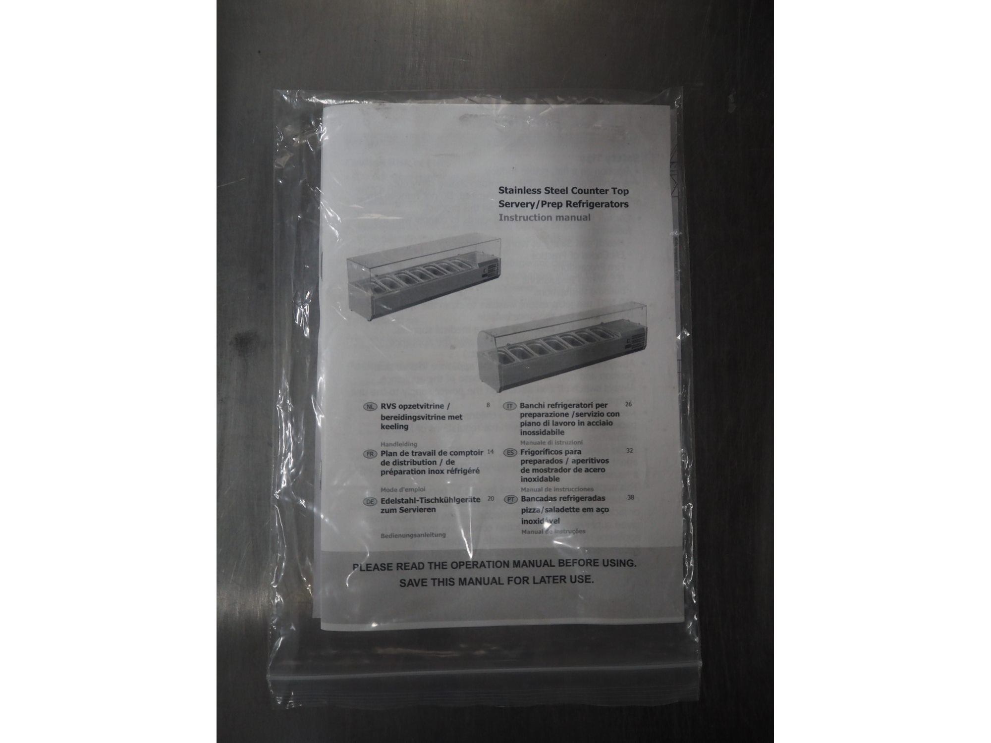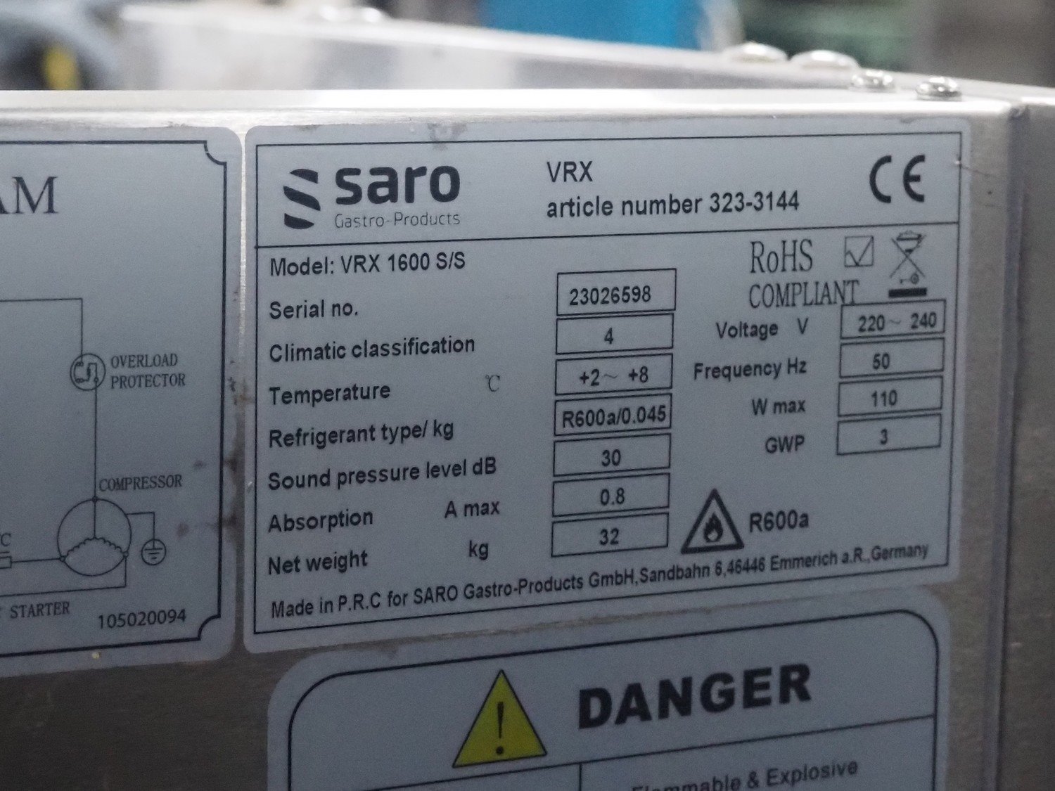 Saro Gastro-Products GmbH s/s counter top servery refrigerator,, model: VRX 1600 S/S, serial number: 23026598, 220-240 V, 3 Ph, 50 Hz, 110 W, refrigerant: R600a/0.045 kg, dimensions: 1600 mm x 395 mm x 280 mm.