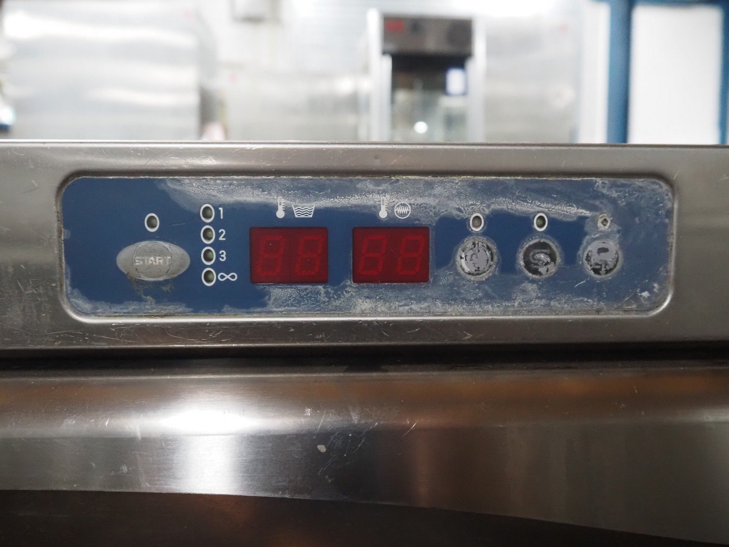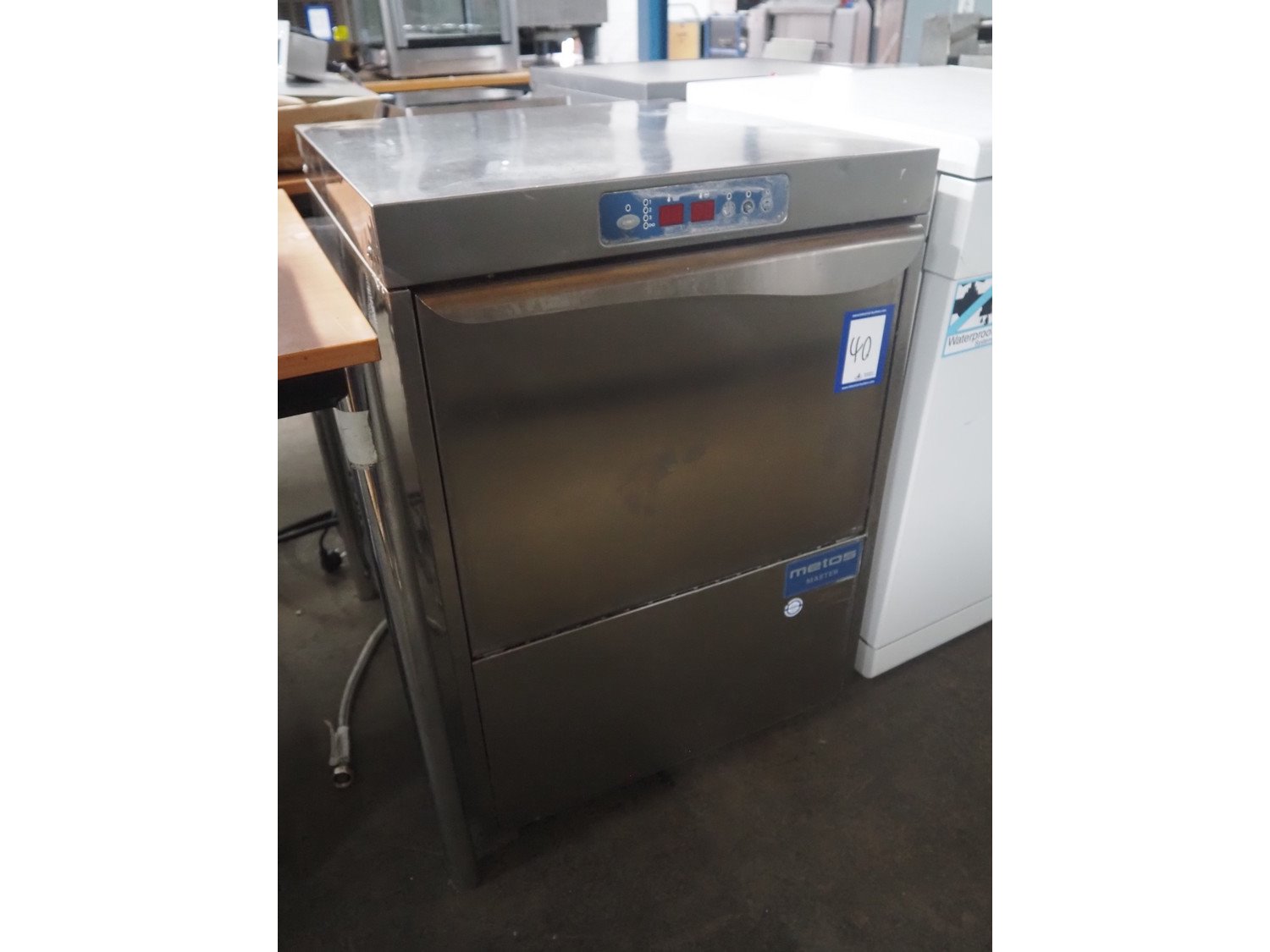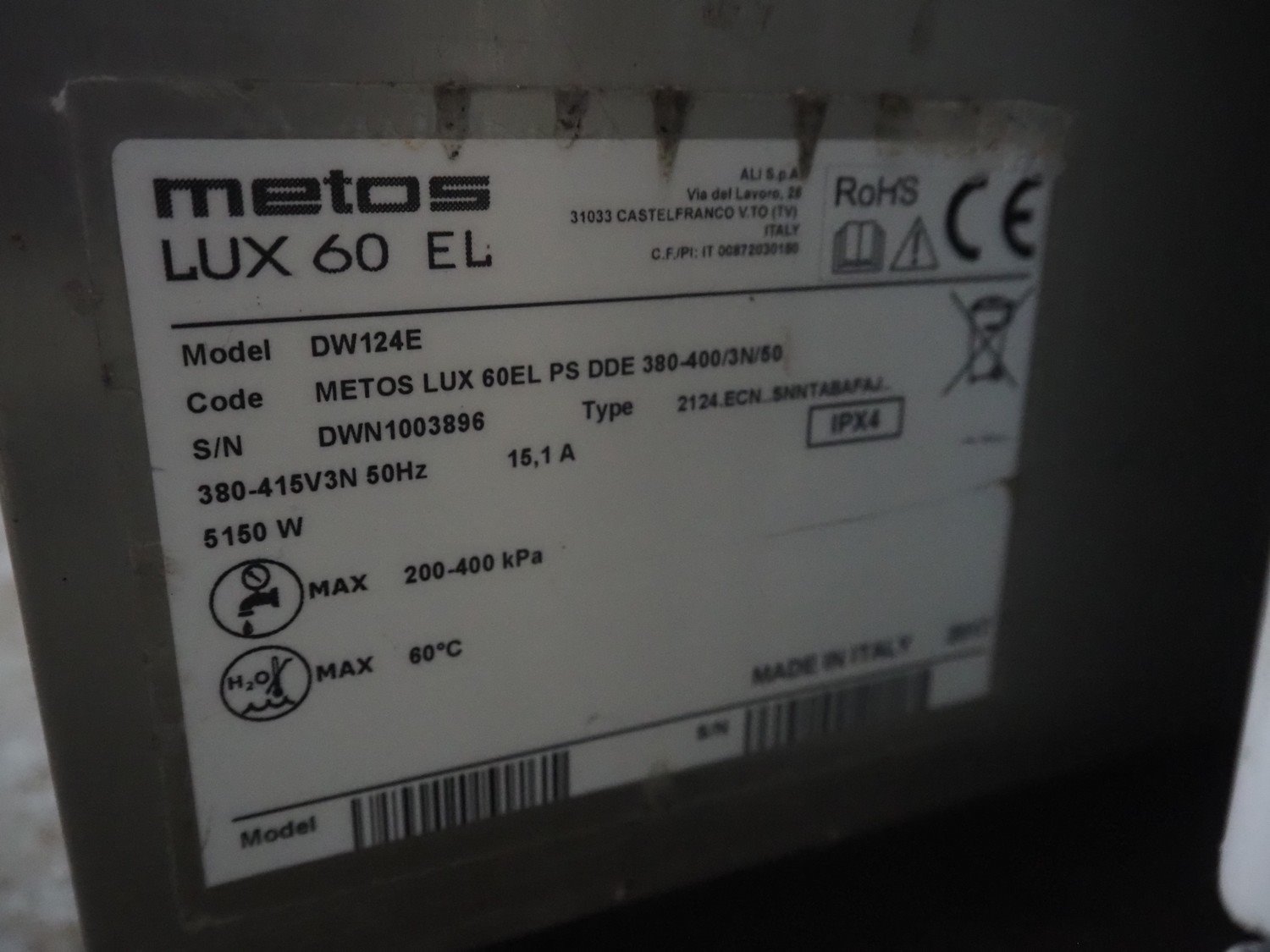 Metos dishwasher, type: DW124E, serial number: DWN1003896, 380-415 V, 3 Ph, 50 Hz, 15.1 A, 5150 W, dimensions: 640 mm x 600 mm x 860 mm.