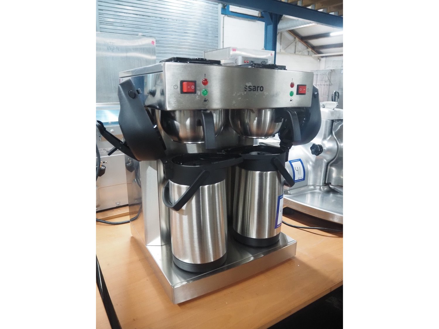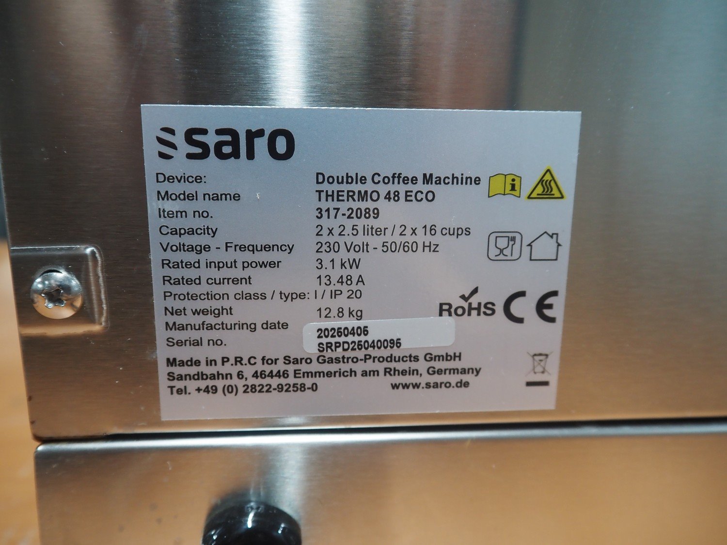 Saro Gastro-Products GmbH coffee machine, model: THERMO 48 ECO, serial number: 20250405, 230 V, 50/60 Hz, 13.48 A, 3.1 kW, weight: 12.8 kg, capacity: (2x) 2.5 liter, dimensions: 500 mm x 400 mm x 550 mm.