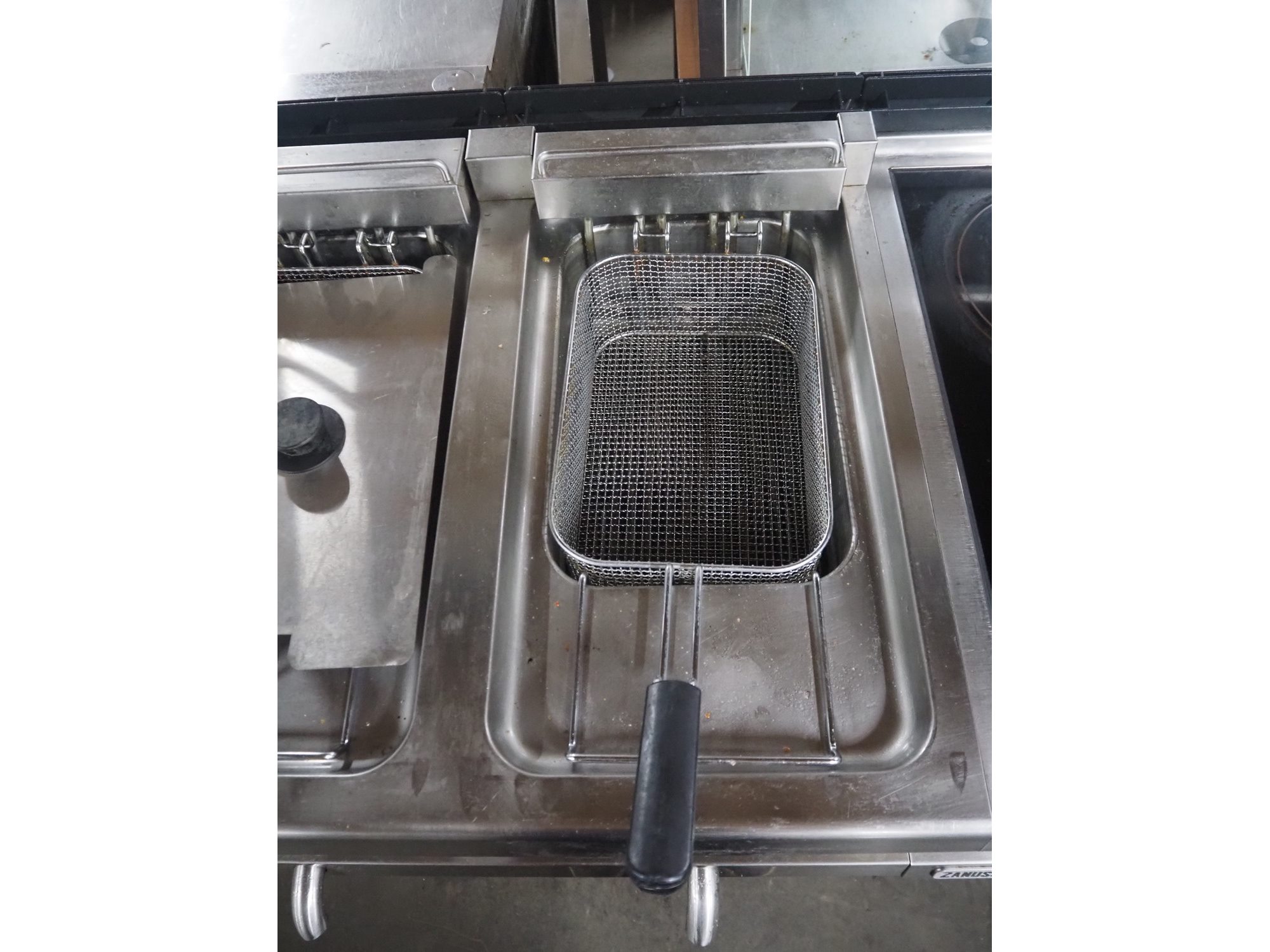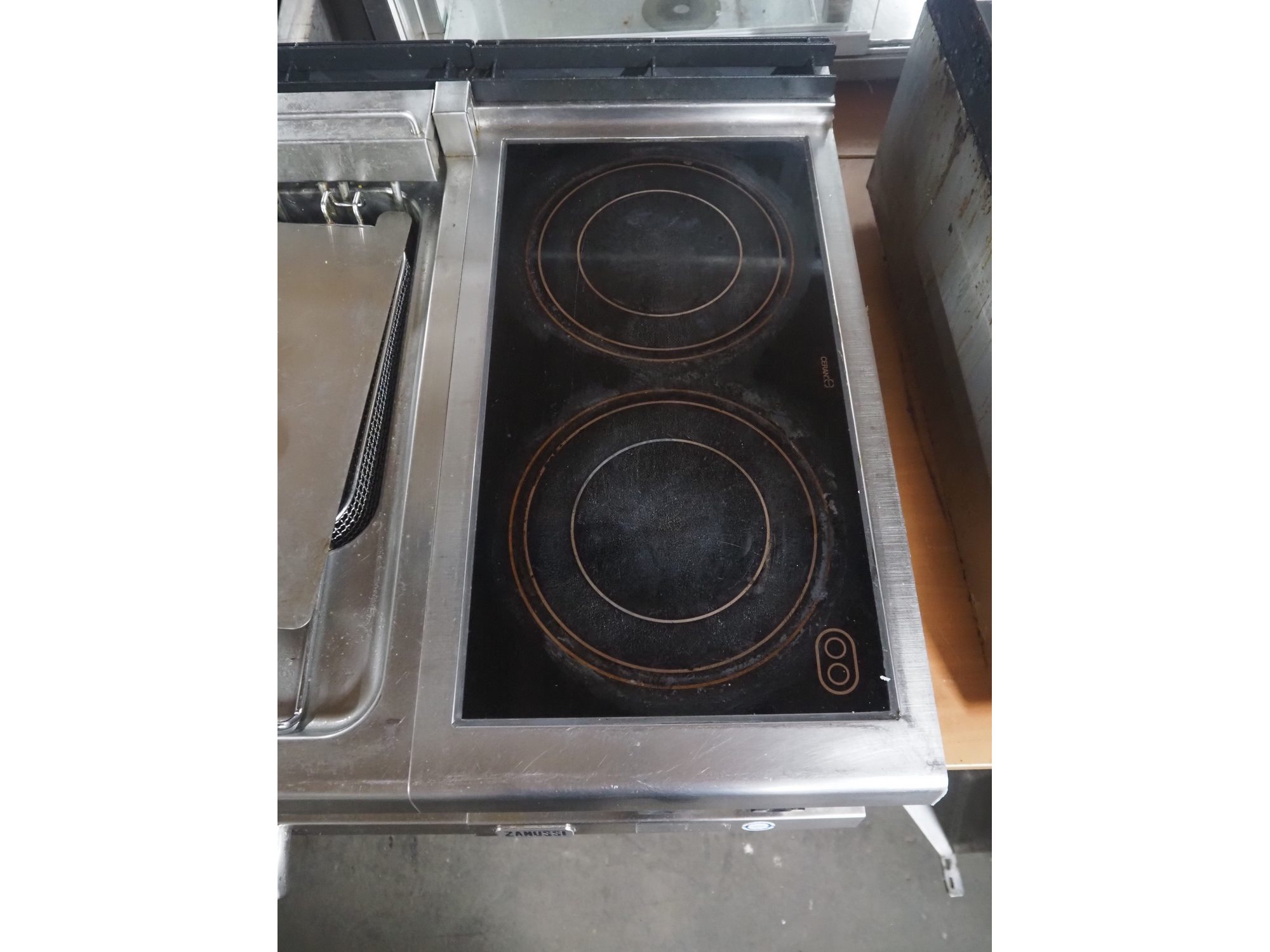 Zanussi double fryer with ceramic hob, dimensions fryer: (2x) 300 mm x 200 mm x 120 mm, dimensions ceramic hob: 550 mm x 300 mm, total dimensions: 1060 mm x 700 mm x 940 mm.