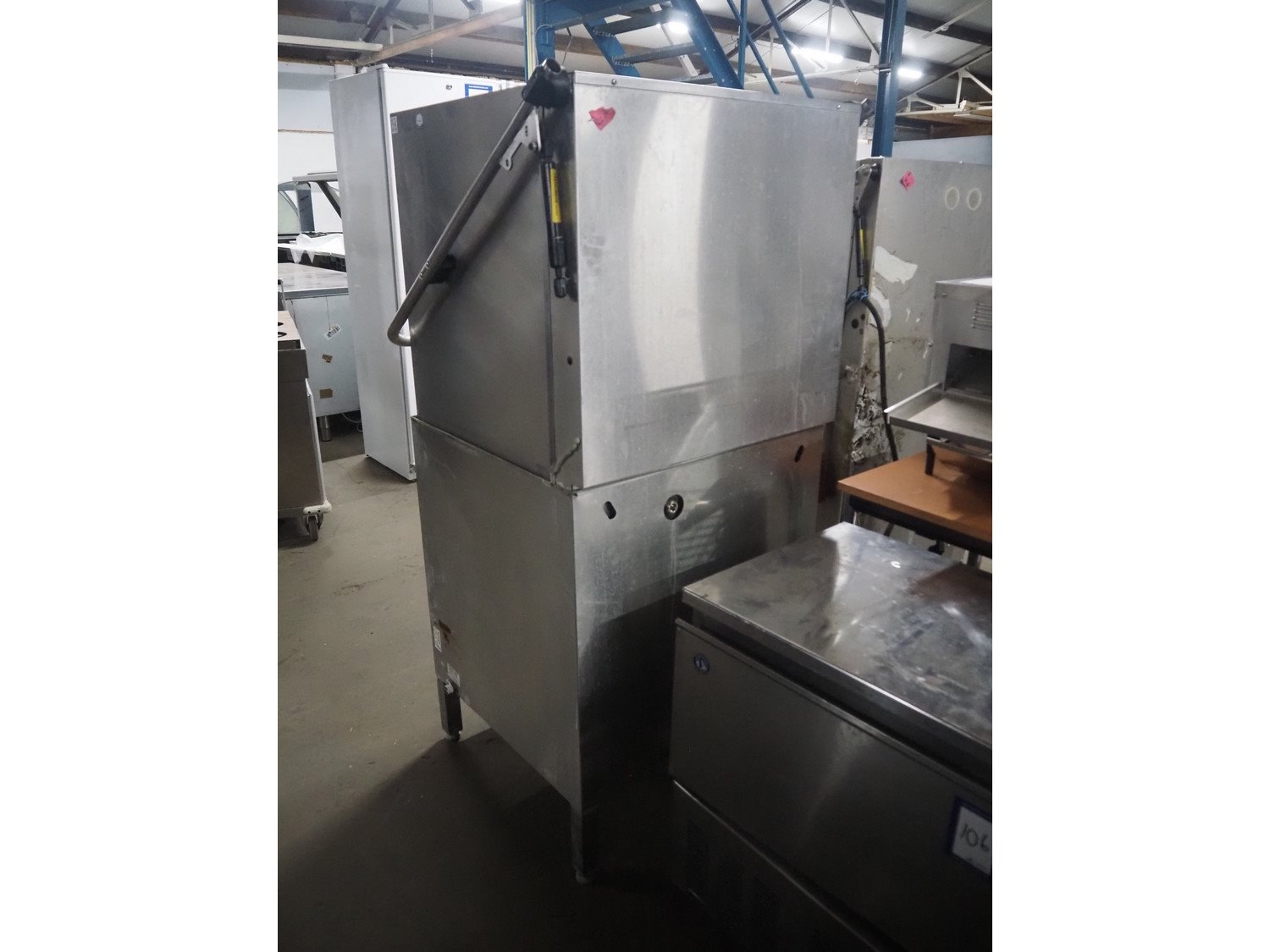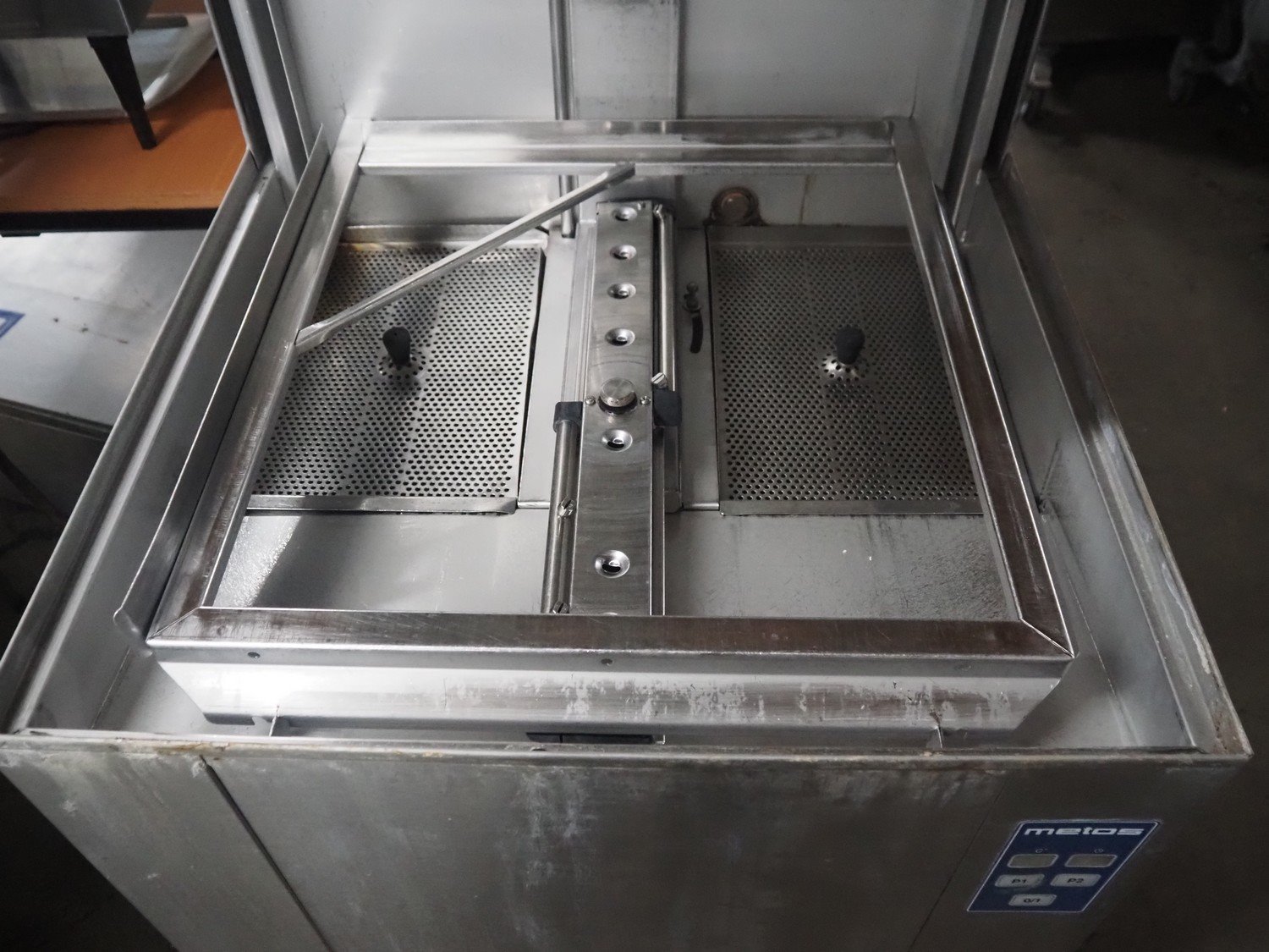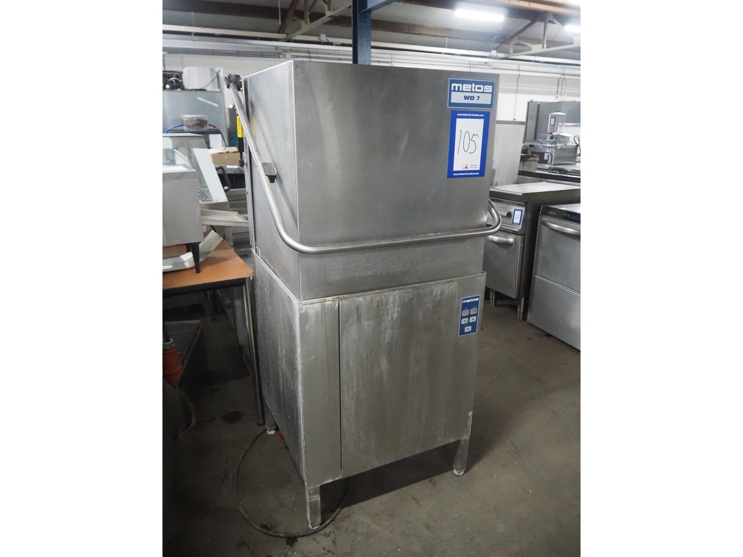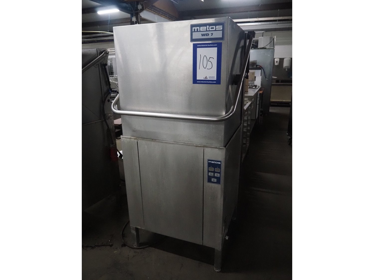 Metos dishwasher, type: WD-7E, number: 064607, year of construction: 2006, 400 V, 3 Ph, 50 Hz, 16 A, 10.1 kW, dimensions: 740 mm x 700 mm x 1500 mm. Including 2 plastic baskets.