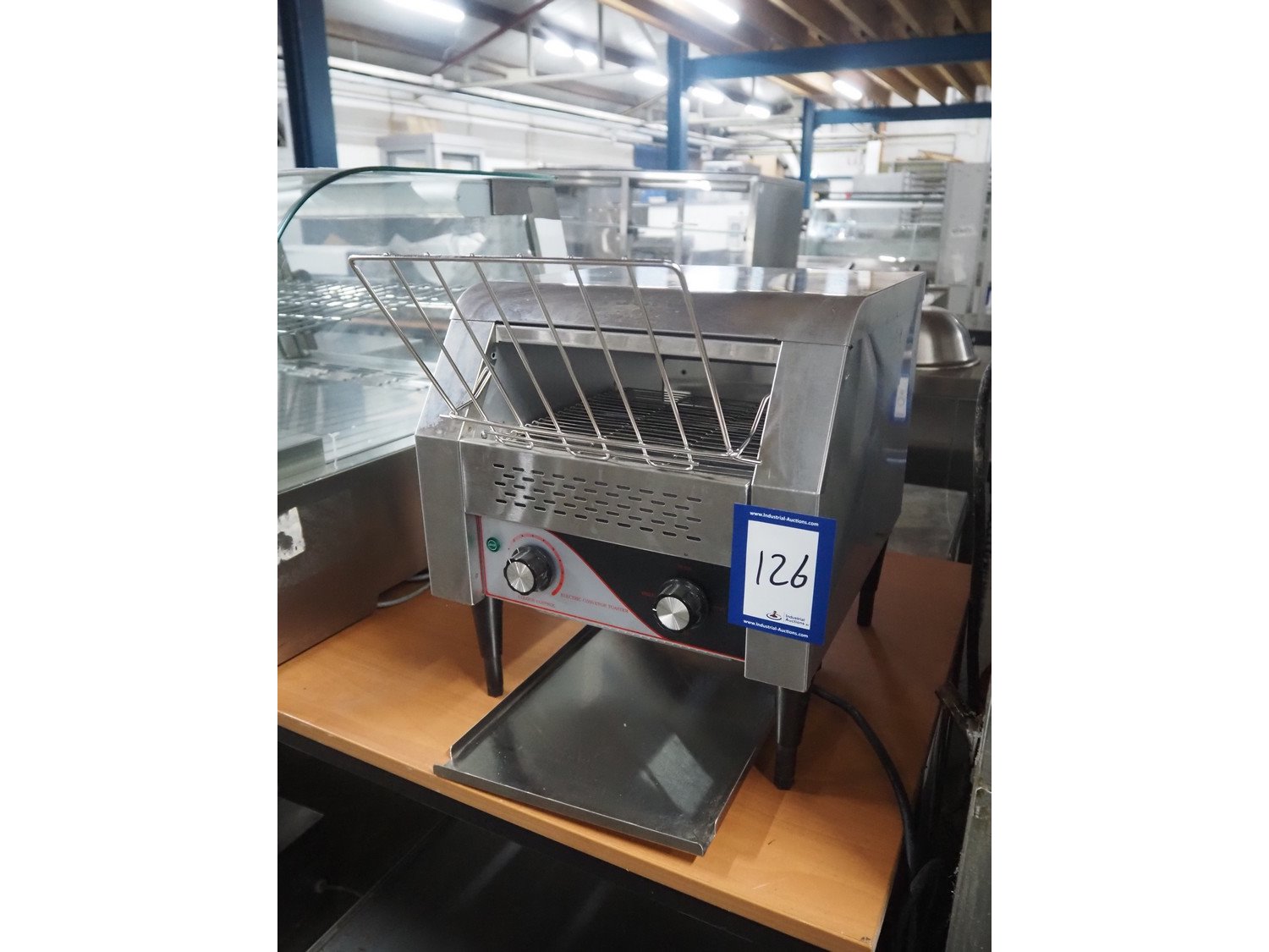 Saro Gastro-Products GmbH electric conveyor toaster, model: CT-2, serial number: 2307033006, year of construction: 07/09/2023, 230 V, 50 Hz, 2240 W, weight: 16 kg, s/s mesh belt, belt width: 260 mm, dimensions: 630 mm x 370 mm x 420 mm.