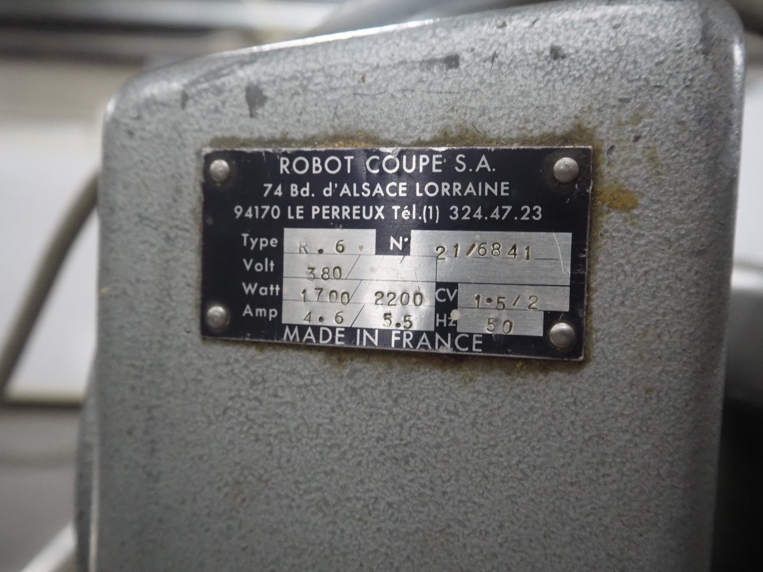 Robot Coupe cutter, type: R.6, number: 21/6841, 360 V, 50 Hz, 4.6/5.5 A, 1700/2200 W, volume: 6 liter, dimensions: 430 mm x 370 mm x 560 mm.