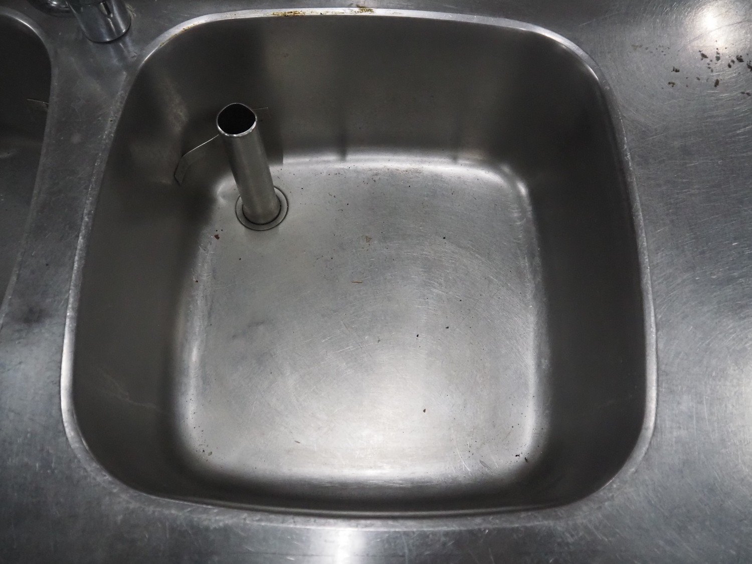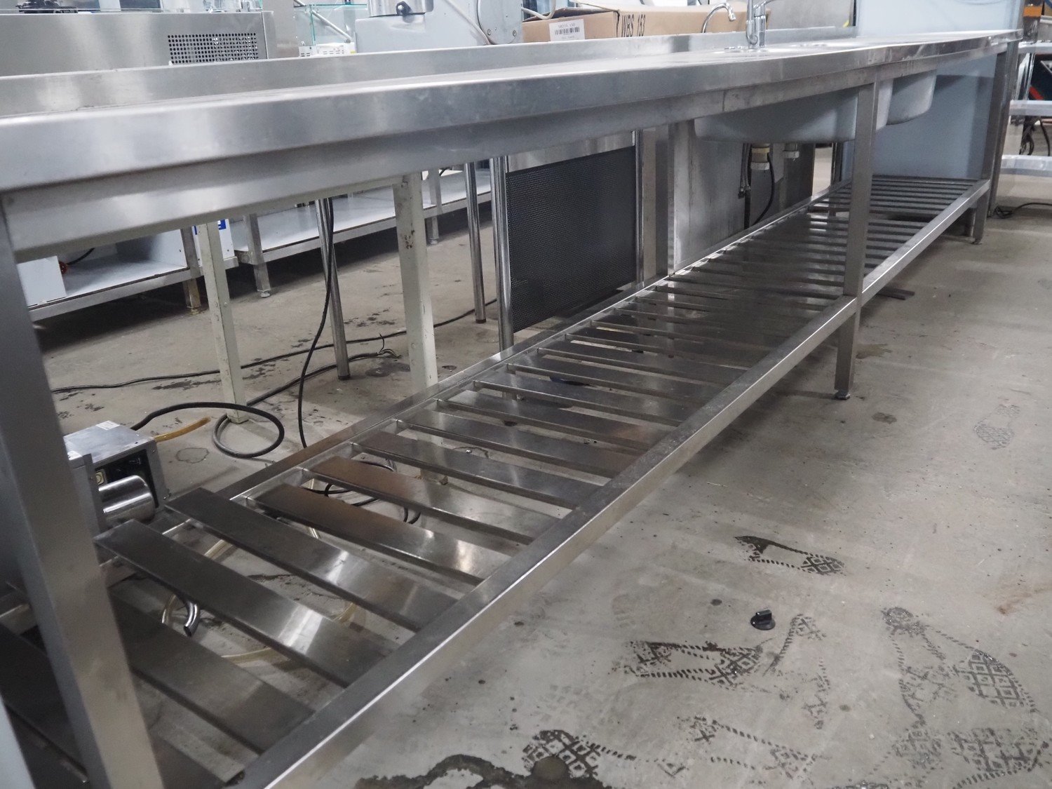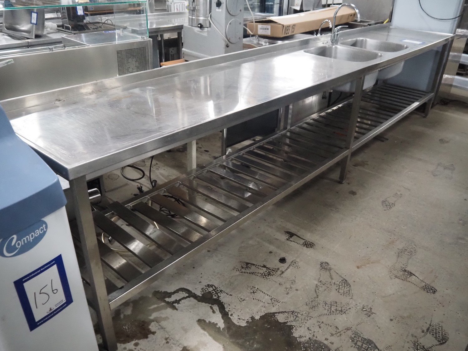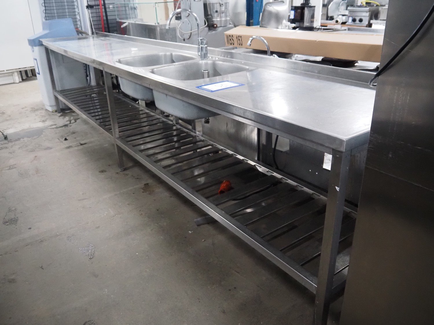 S/s counter with 2 sinks and faucet, dimensions: 4200 mm x 700 mm x 1250 mm.