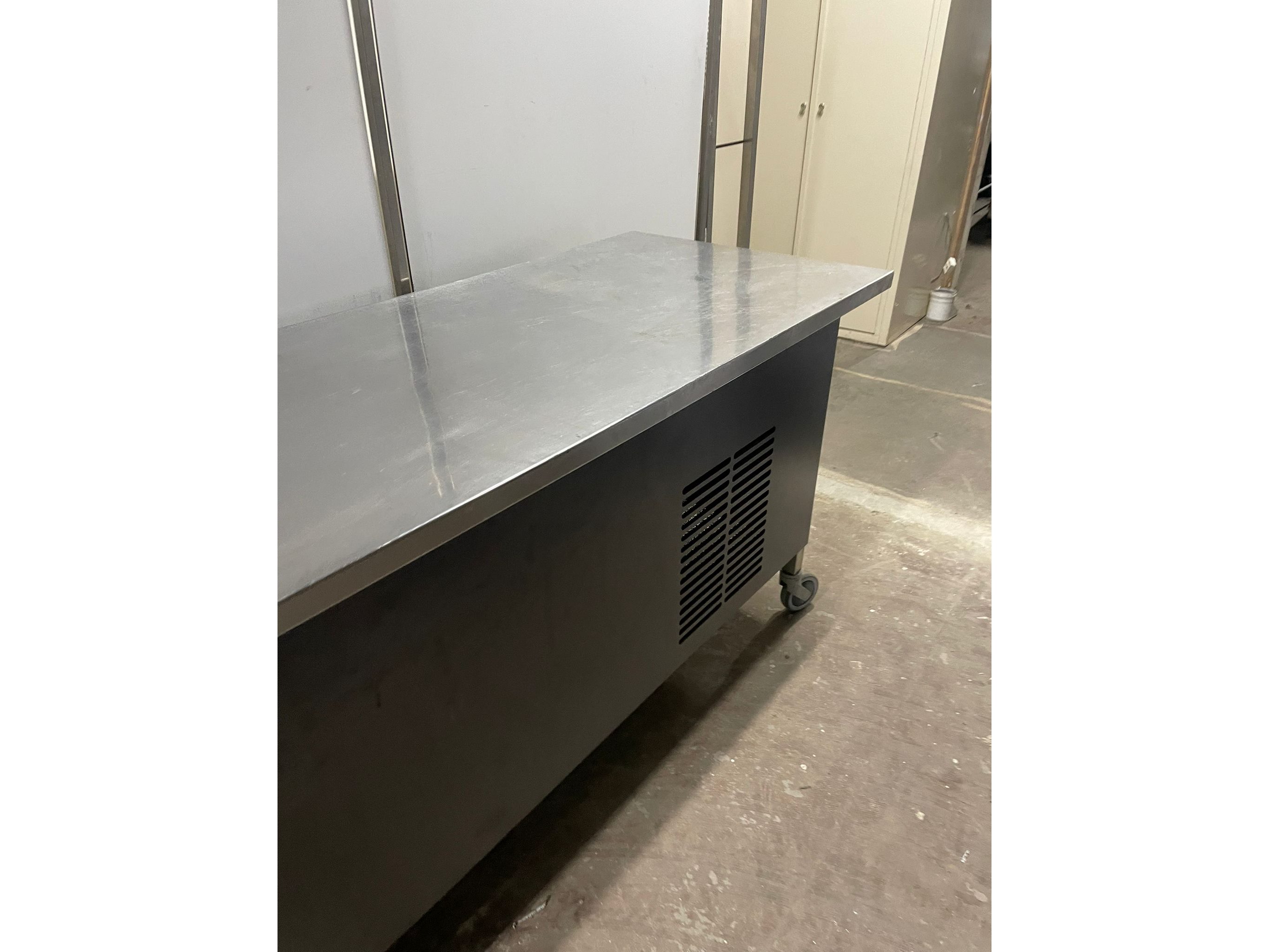 Mobile table, wooden frame, s/s top, dimensions: 2000 mm x 800 mm x 900 mm.
