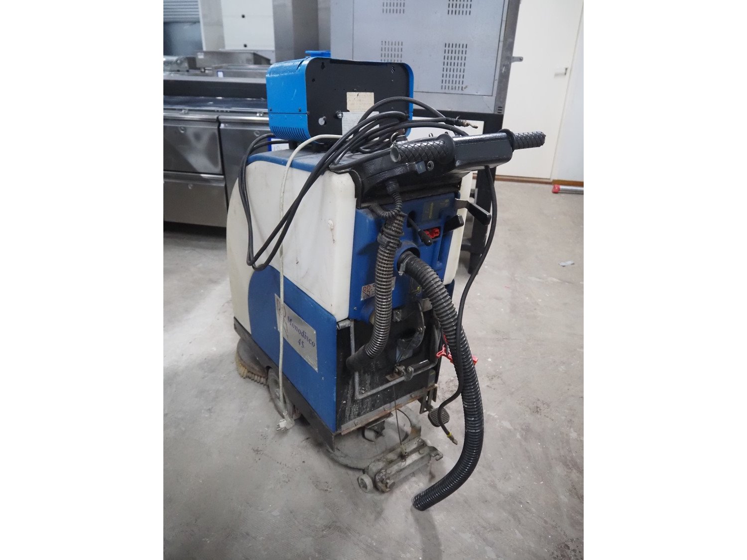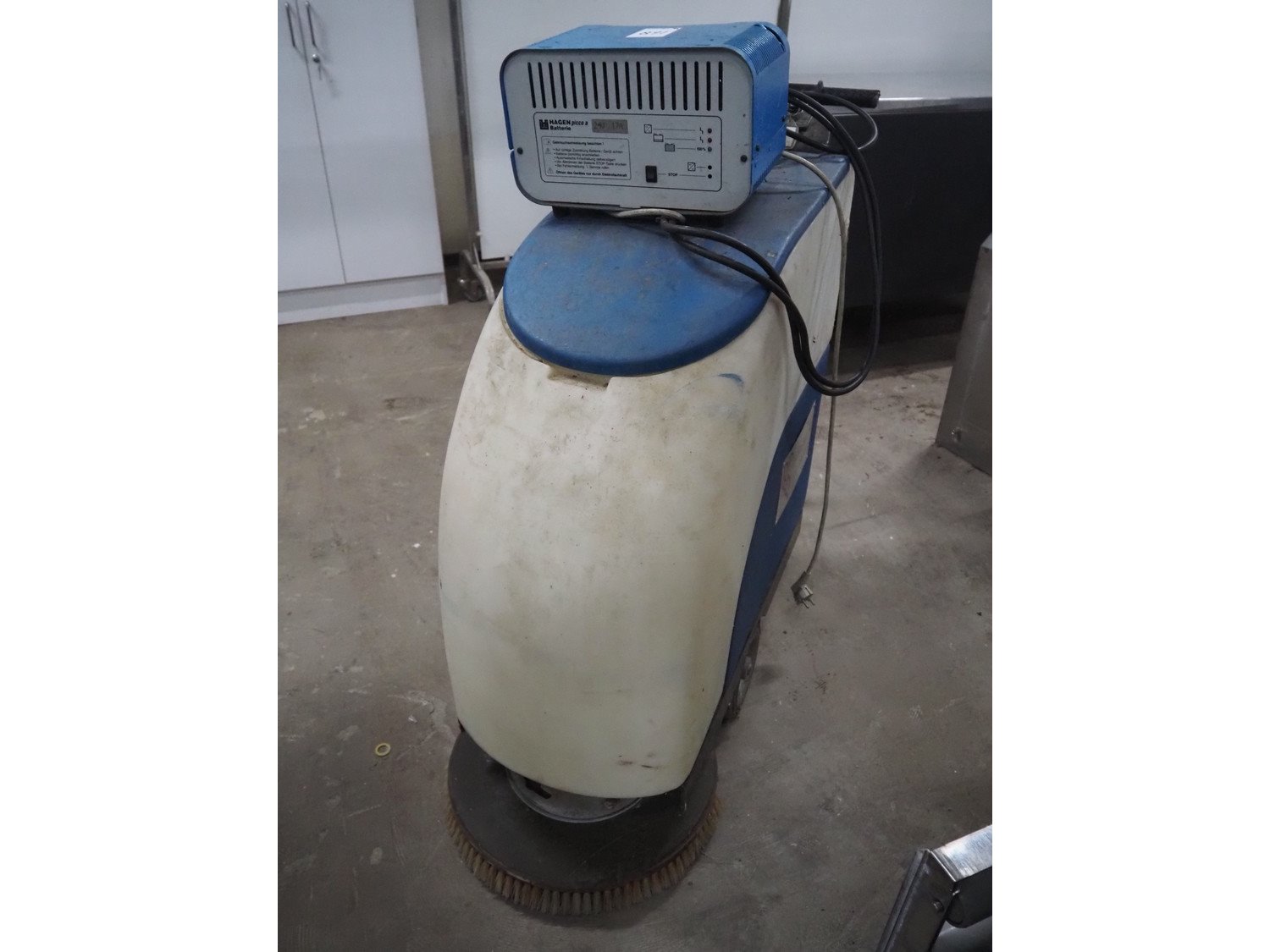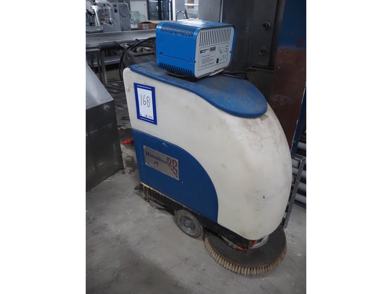 Monodisco floor scrubbing machine, diameter brush: Ø 400 mm, total dimensions: 1100 mm x 400 mm x 1050 mm. Including charger, type: E 24/17, serial number: 36316/0/0009/02/5, 230 V, 1 Ph, 50 Hz, 3.6 A. Missing the sweeping brush and technical condition unknown.