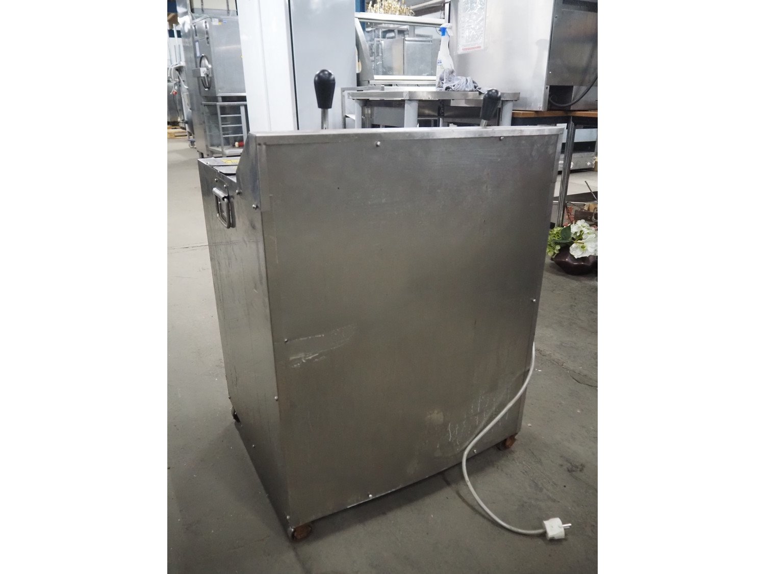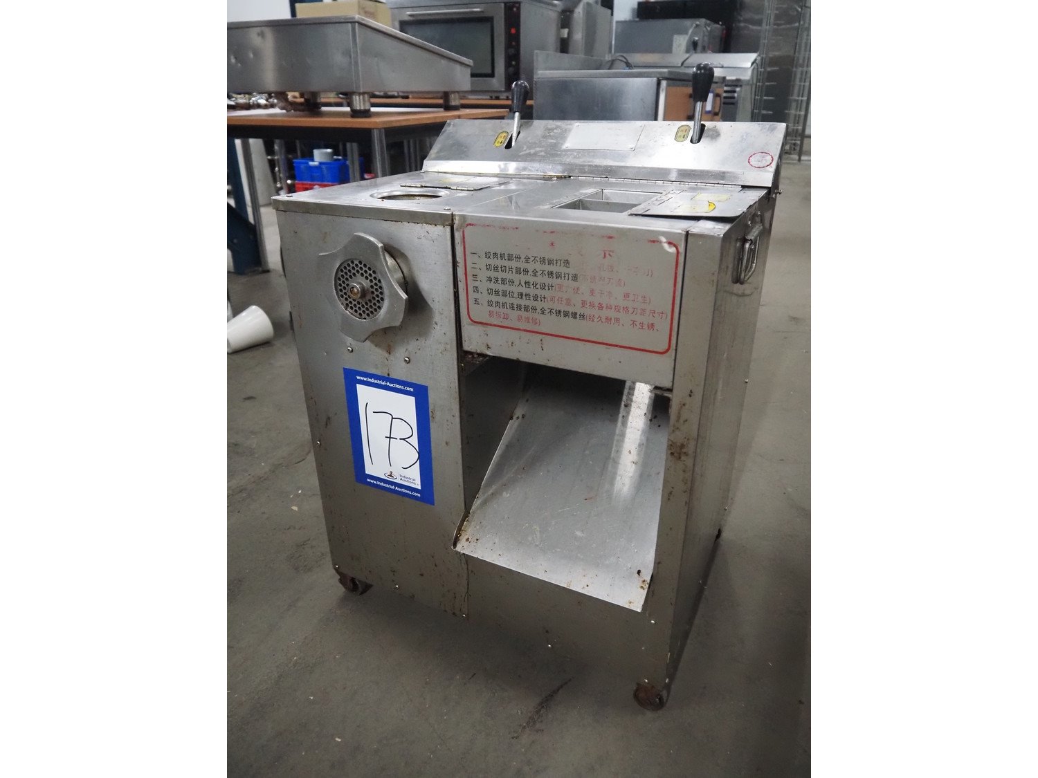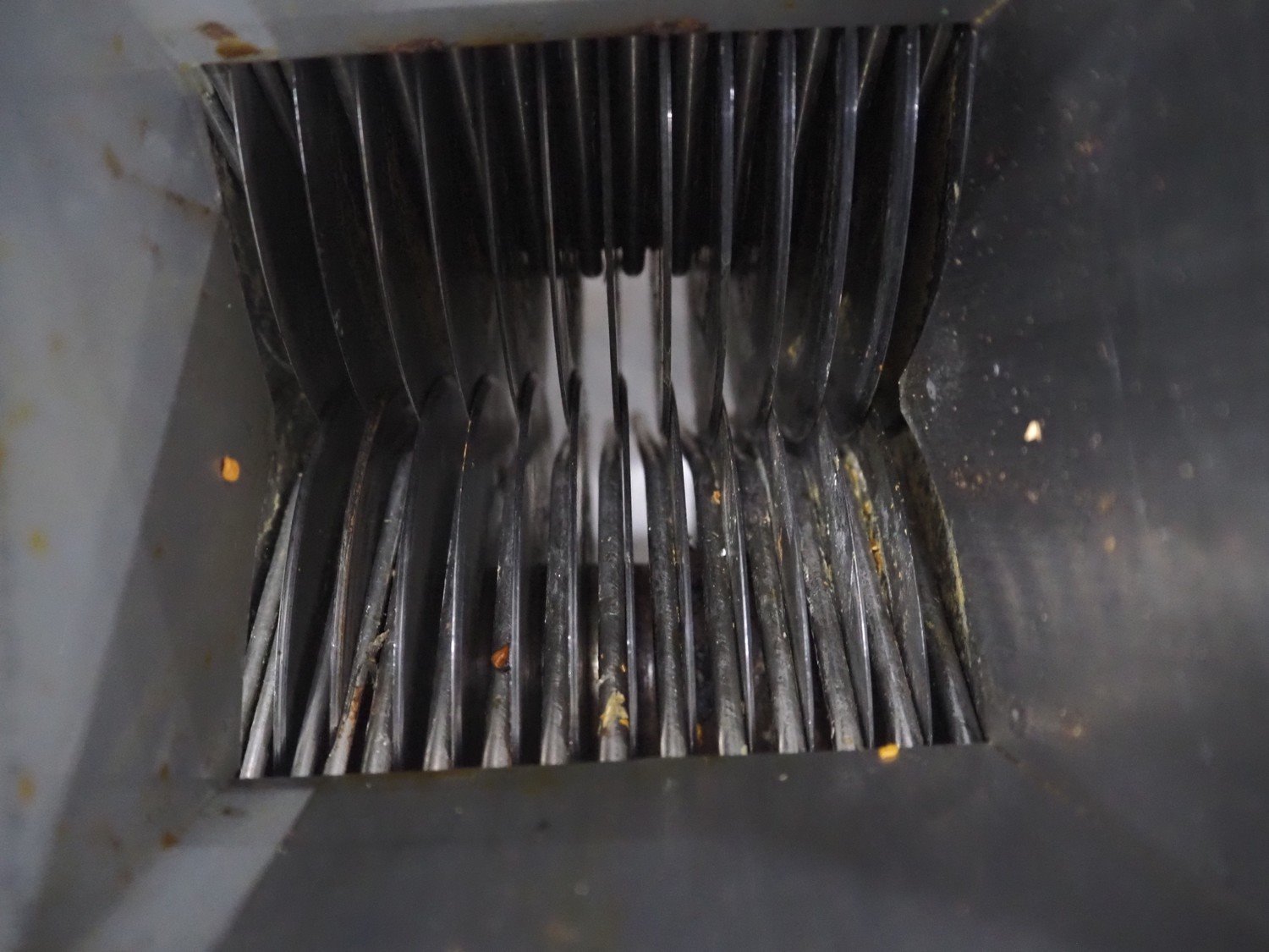 Mobile s/s grinder with strip cutter, 8 knives, diameter knives: 80 mm, distance between knives: 10 mm, diameter plate: 100 mm, total dimensions: 600 mm x 520 mm x 800 mm.