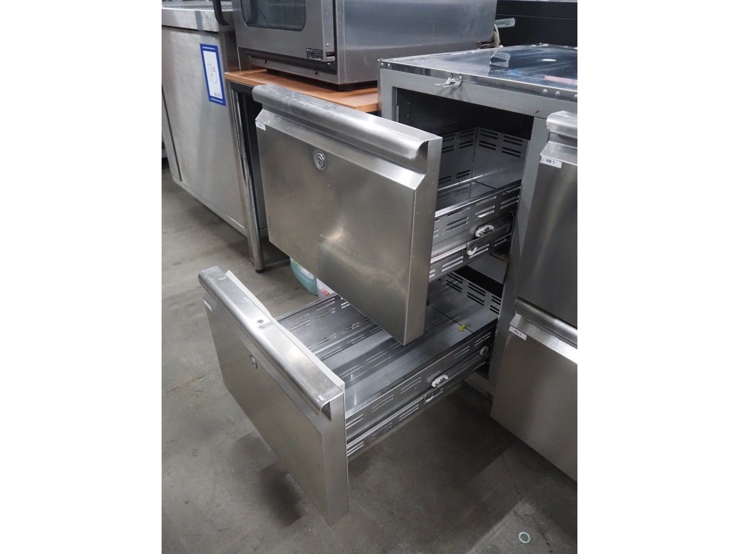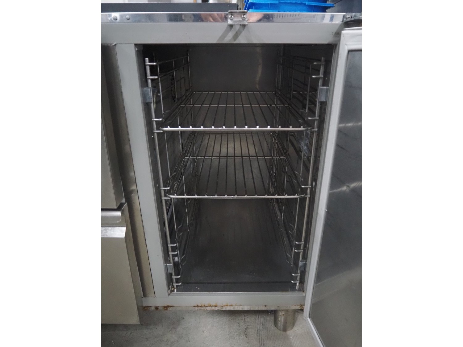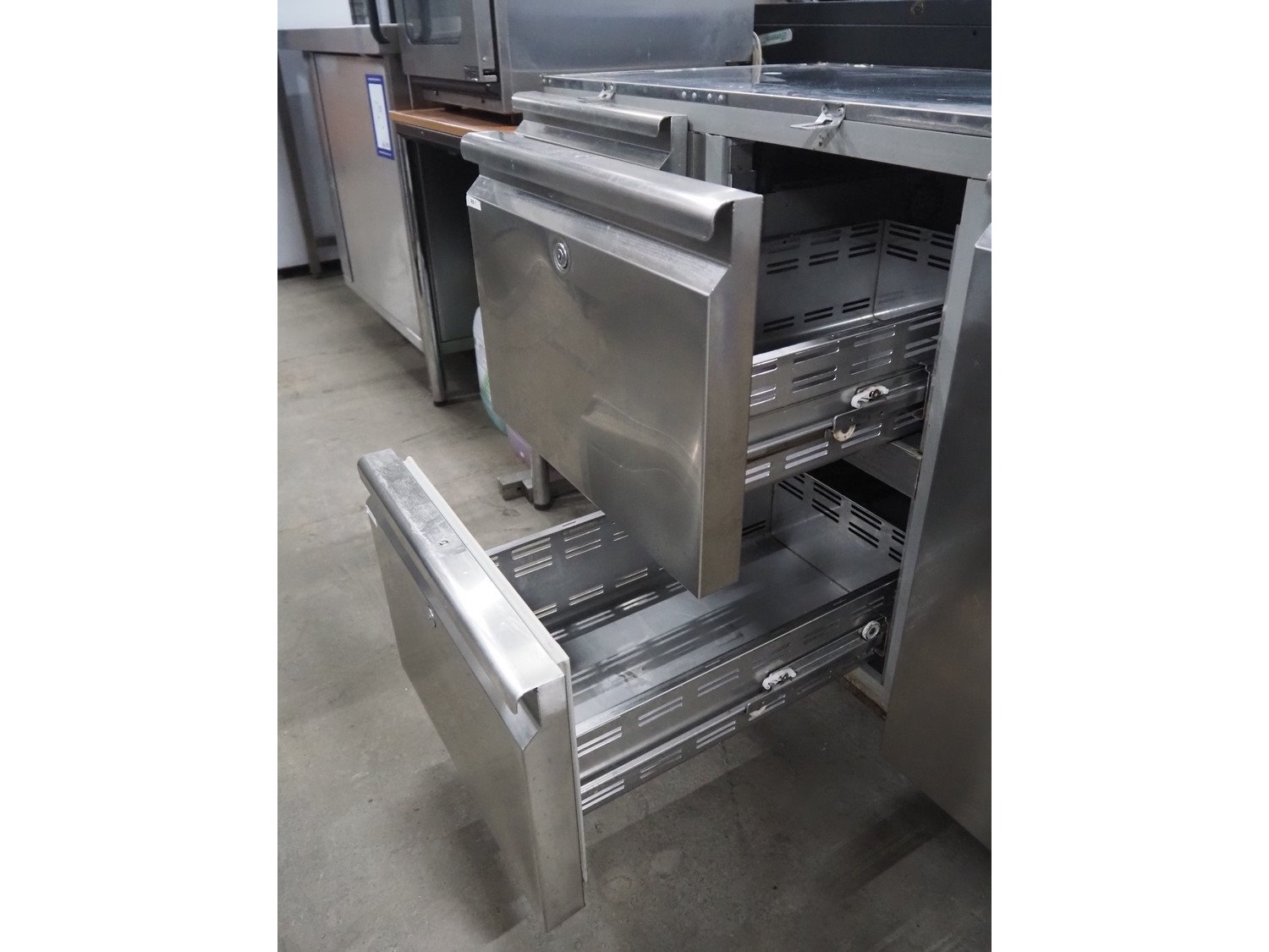 Metos refrigerated counter, type: KSTP03TN H71 C2, serial number: BN020247160, year of construction: 2018, 230 V, 50 Hz, 300 W, refrigerant: R452A/R404/R507/R449, 4 drawers, dimensions drawers: 560 mm x 300 mm x 300 mm, 2 floors, floor dimensions: 550 mm x 330 mm, total dimensions: 1550 mm x 700 mm x 900 mm. Missing top and external cool motor.