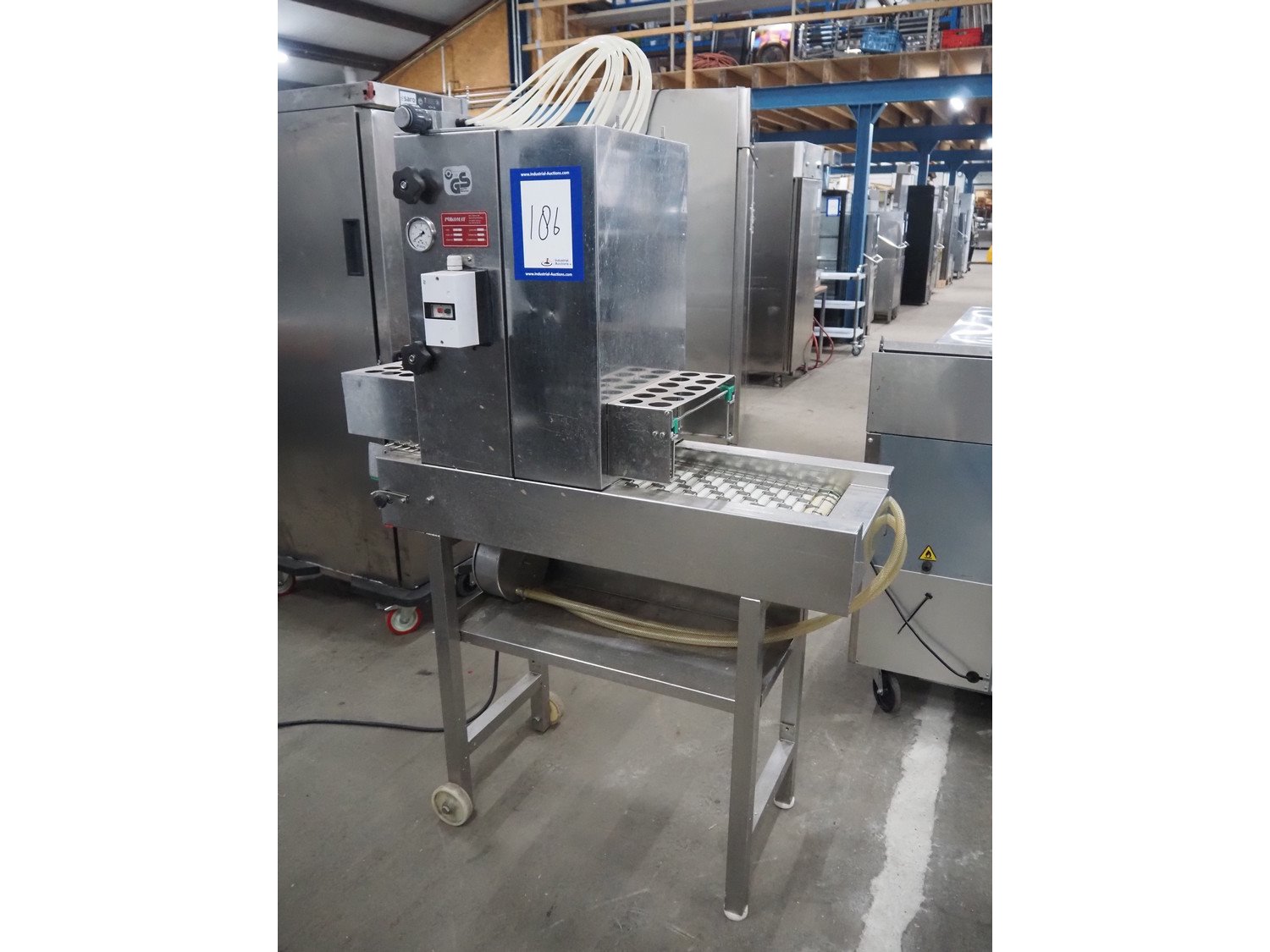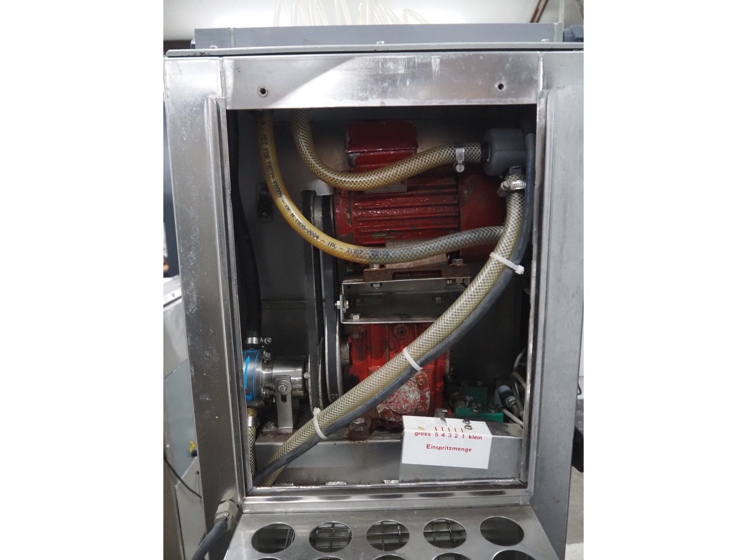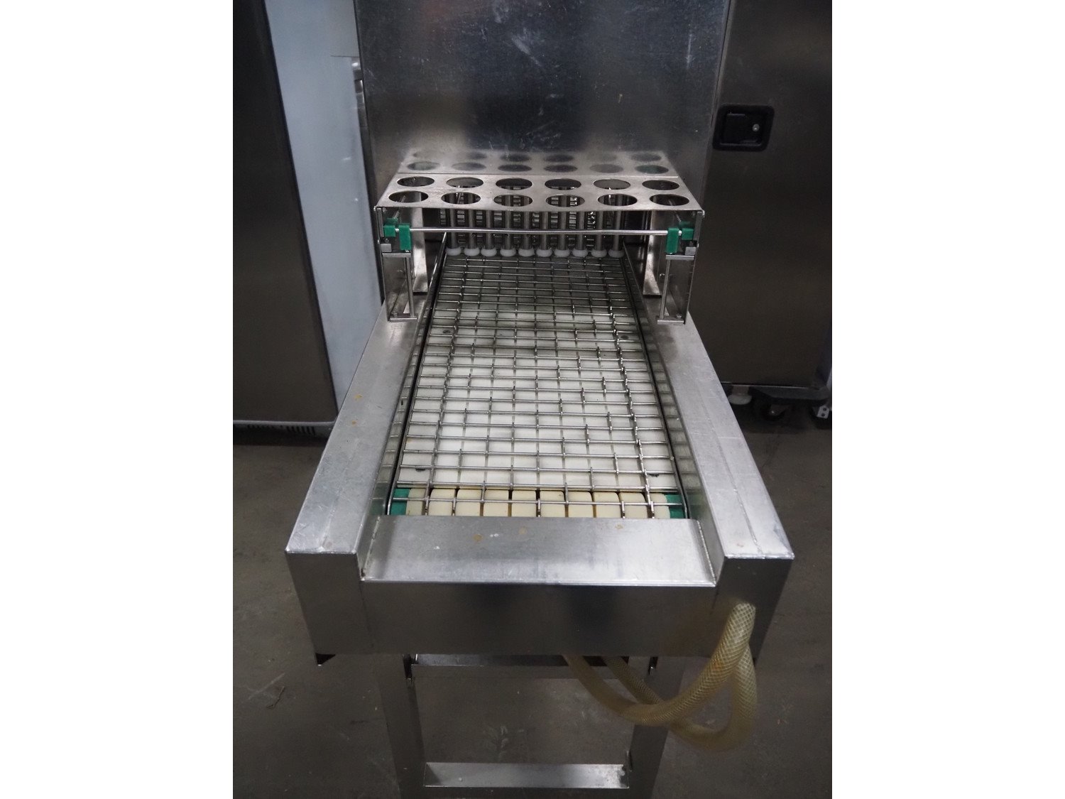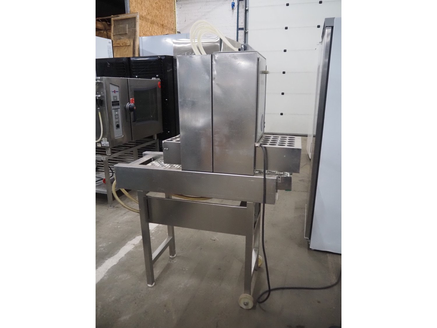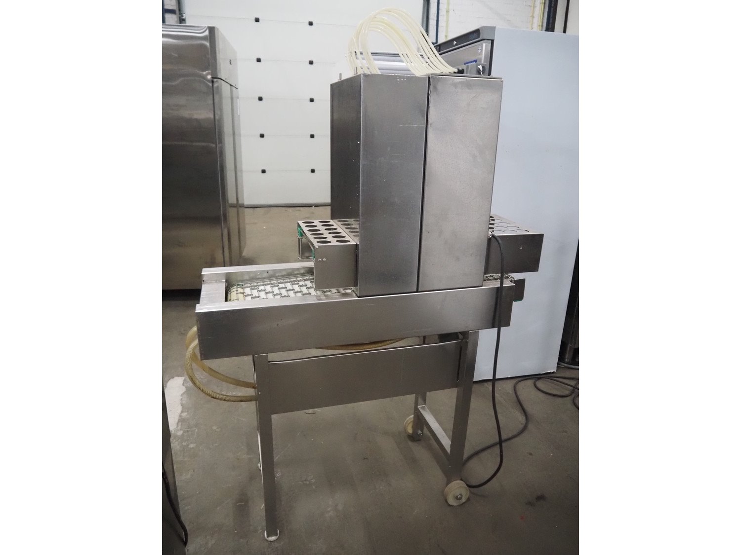Pökomat mobile injector, type: R10/300, fabrication number: 582.1, 380 V, 1.8 A, 0.75 kW, weight: 126 kg, 10 needles, s/s belt, belt width: 300 mm, clearance: 300 mm x 140 mm, total dimensions: 1170 mm x 430 mm x 1750 mm.