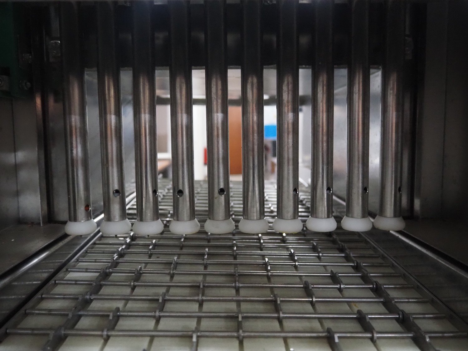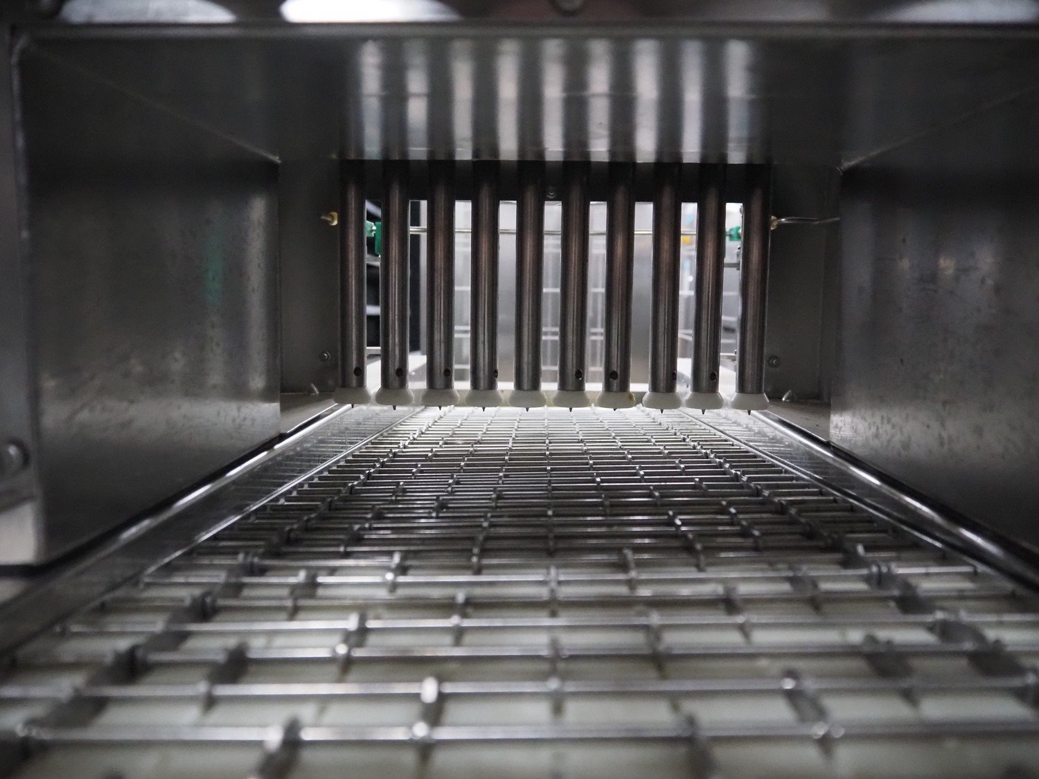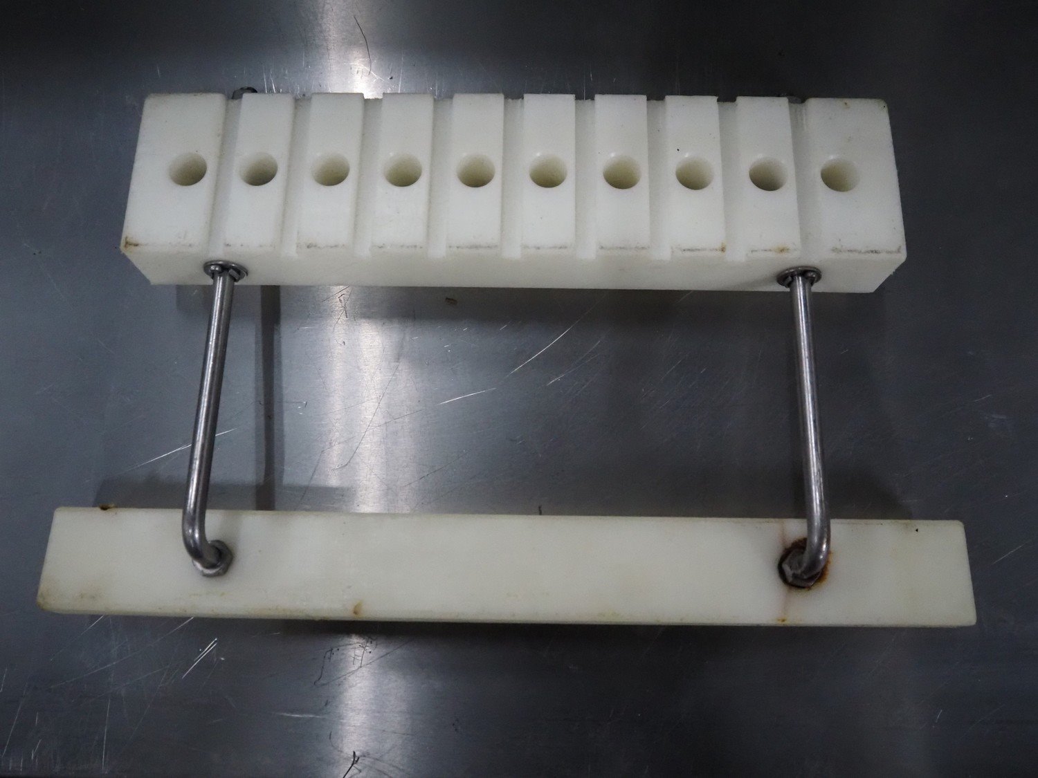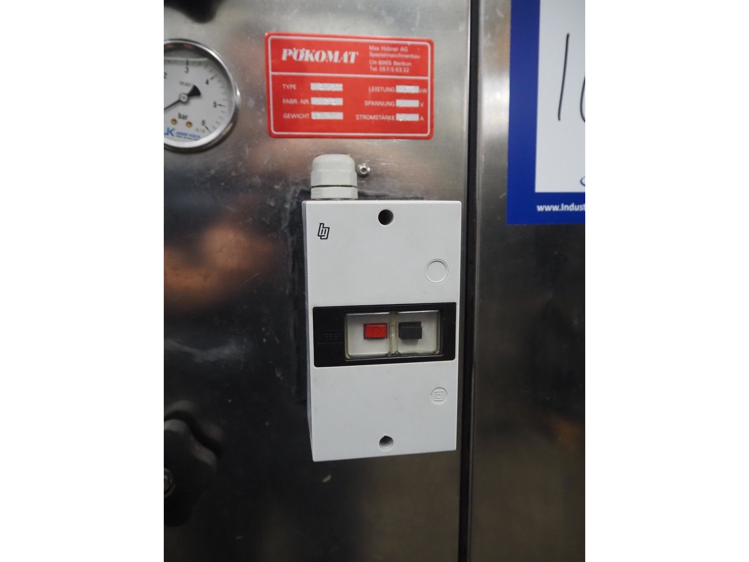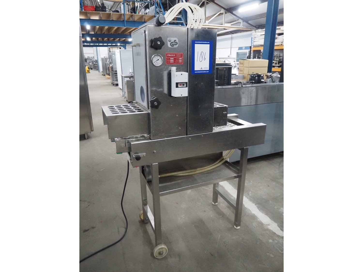 Pökomat mobile injector, type: R10/300, fabrication number: 582.1, 380 V, 1.8 A, 0.75 kW, weight: 126 kg, 10 needles, s/s belt, belt width: 300 mm, clearance: 300 mm x 140 mm, total dimensions: 1170 mm x 430 mm x 1750 mm.