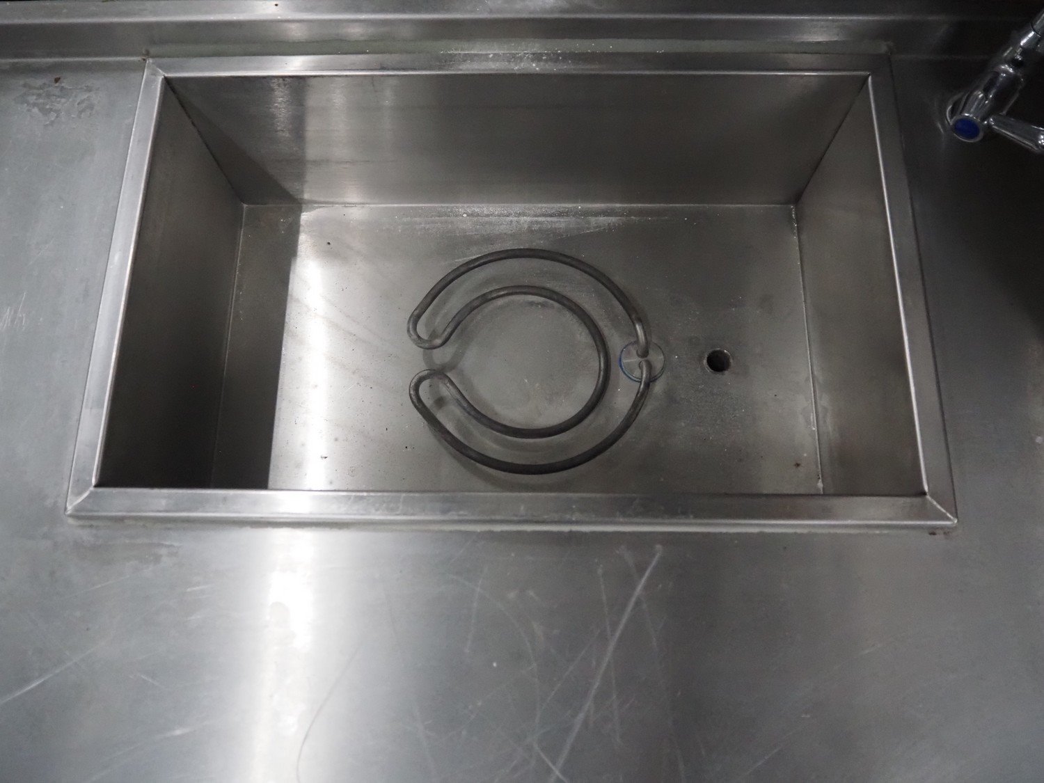 S/s heated table with sink, dimensions: 1700 mm x 900 mm x 1160 mm.
