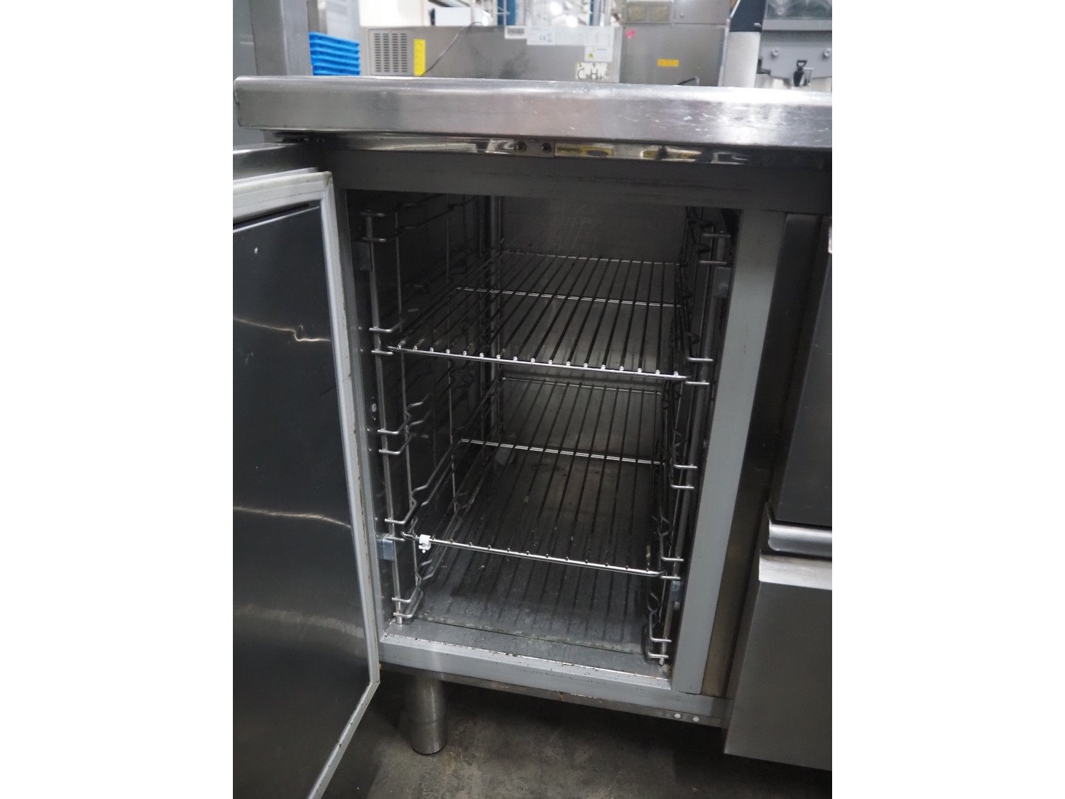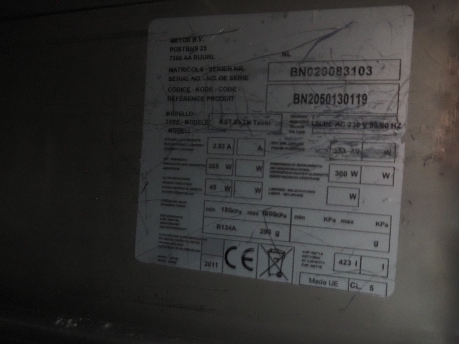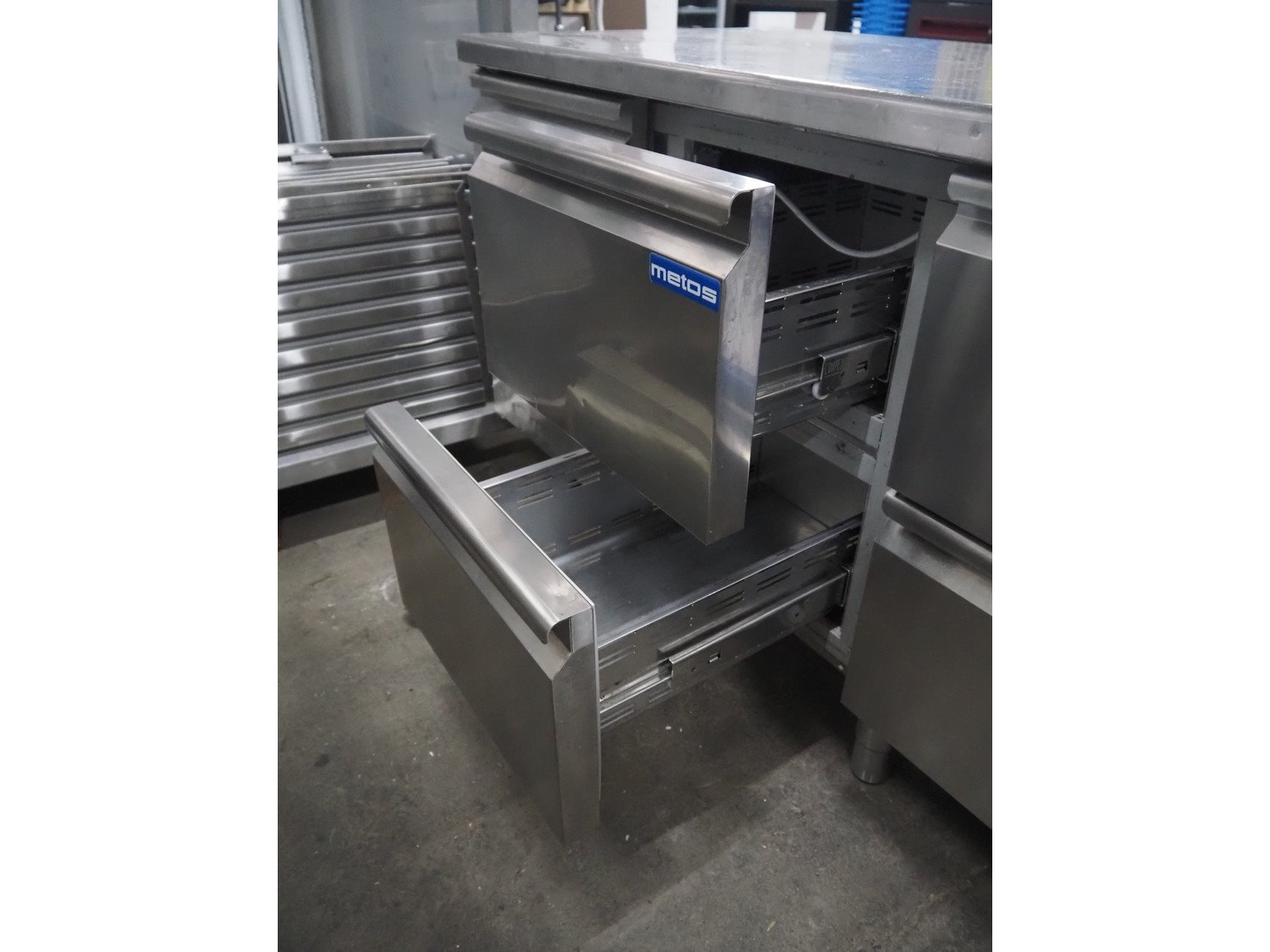 Metos refrigerated counter, type: KST 03 TN Tavol, serial number: BN020083103, 230 V, 50/60 Hz, 2.53 A, 355 W, refrigerant: R134A/0.290 kg, 4 drawers, dimensions drawers: 560 mm x 300 mm x 300 mm, 2 floors, floor dimensions: 550 mm x 330 mm, total dimensions: 1700 mm x 700 mm x 900 mm.