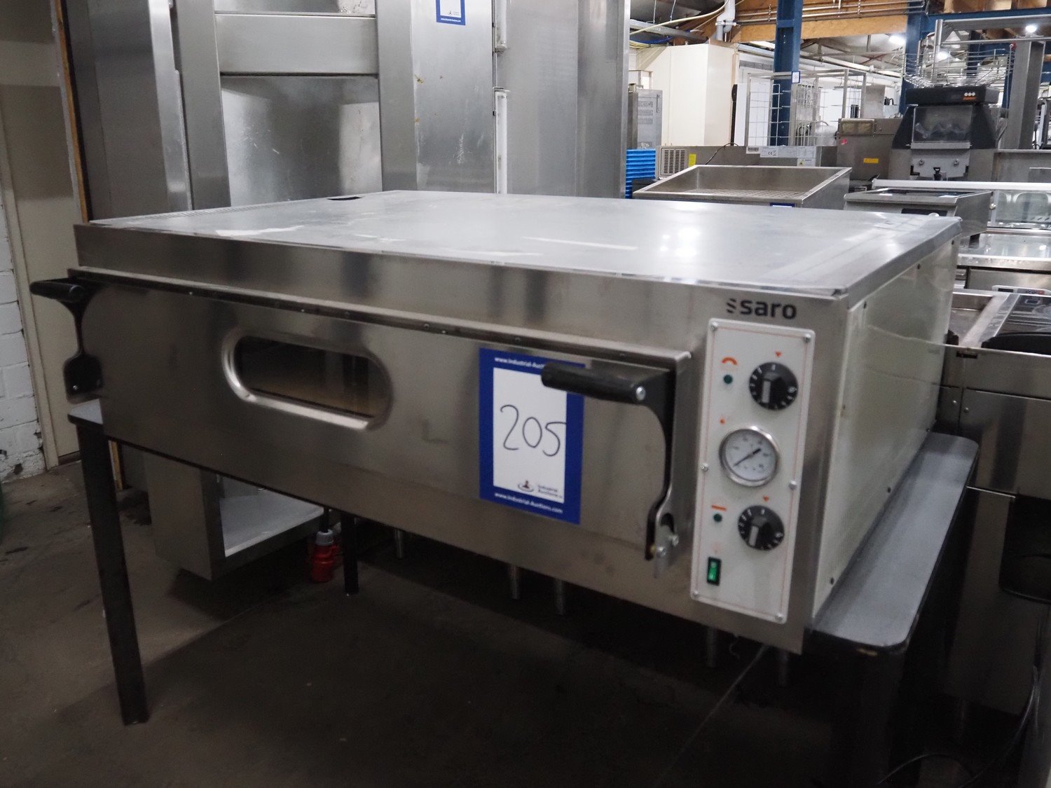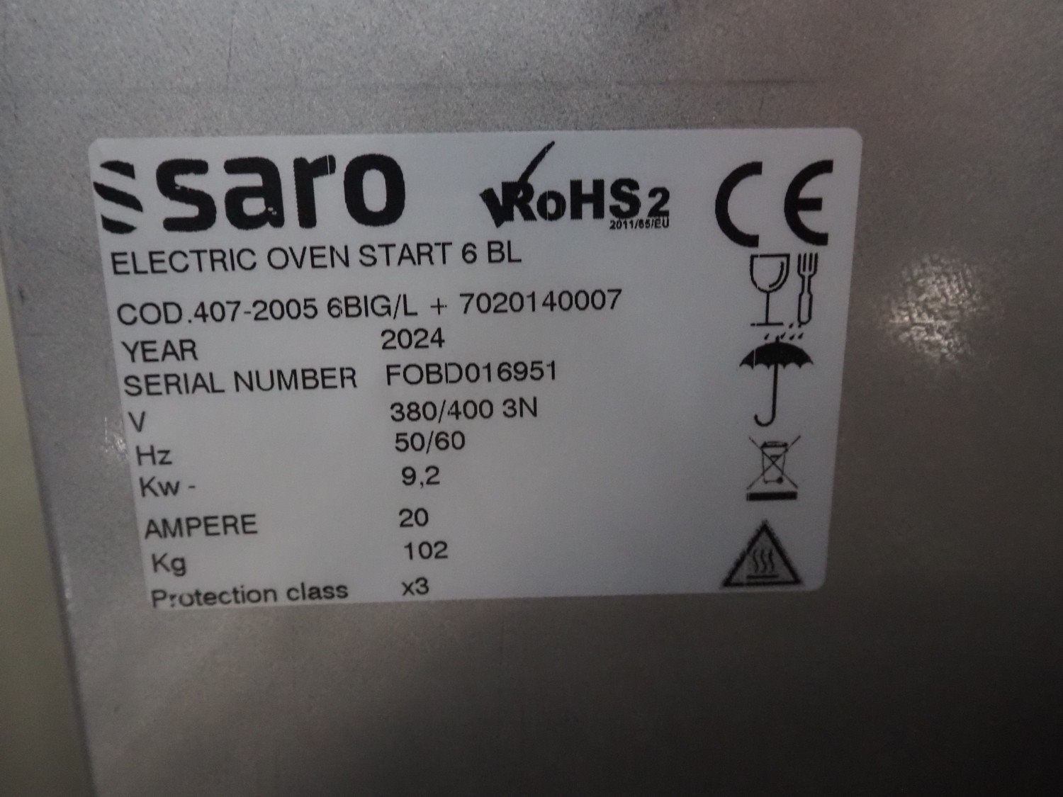 Saro Gastro-Products GmbH pizza oven, type: electric oven start 6 BL, serial number: FOBD016951, year of construction: 2024, 380/400 V, 3 Ph, 50/60 Hz, 20 A, 9.2 kW, weight: 102 kg, inside dimensions: 1100 mm x 740 mm, total dimensions: 1300 mm x 1000 mm x 400 mm.