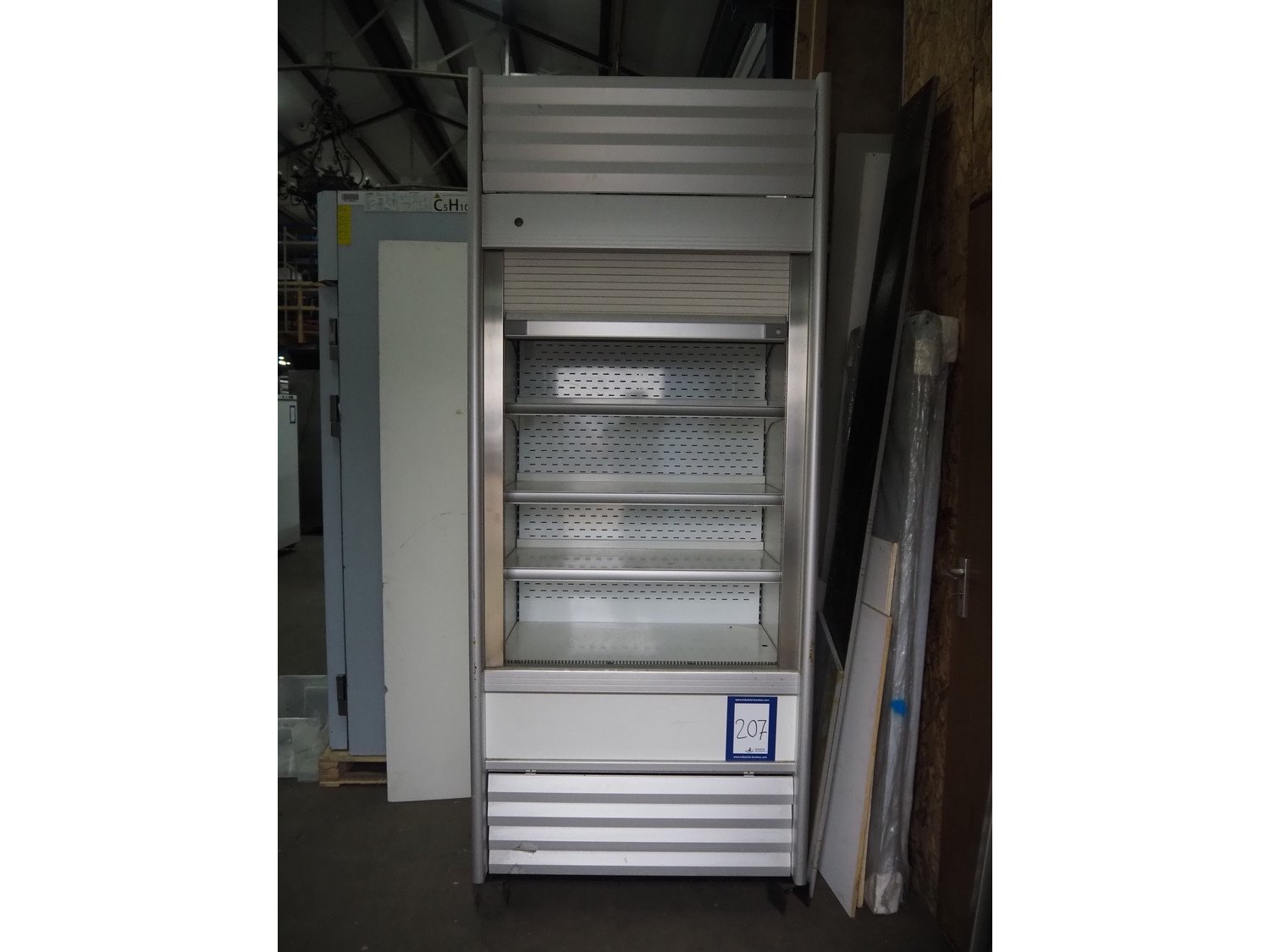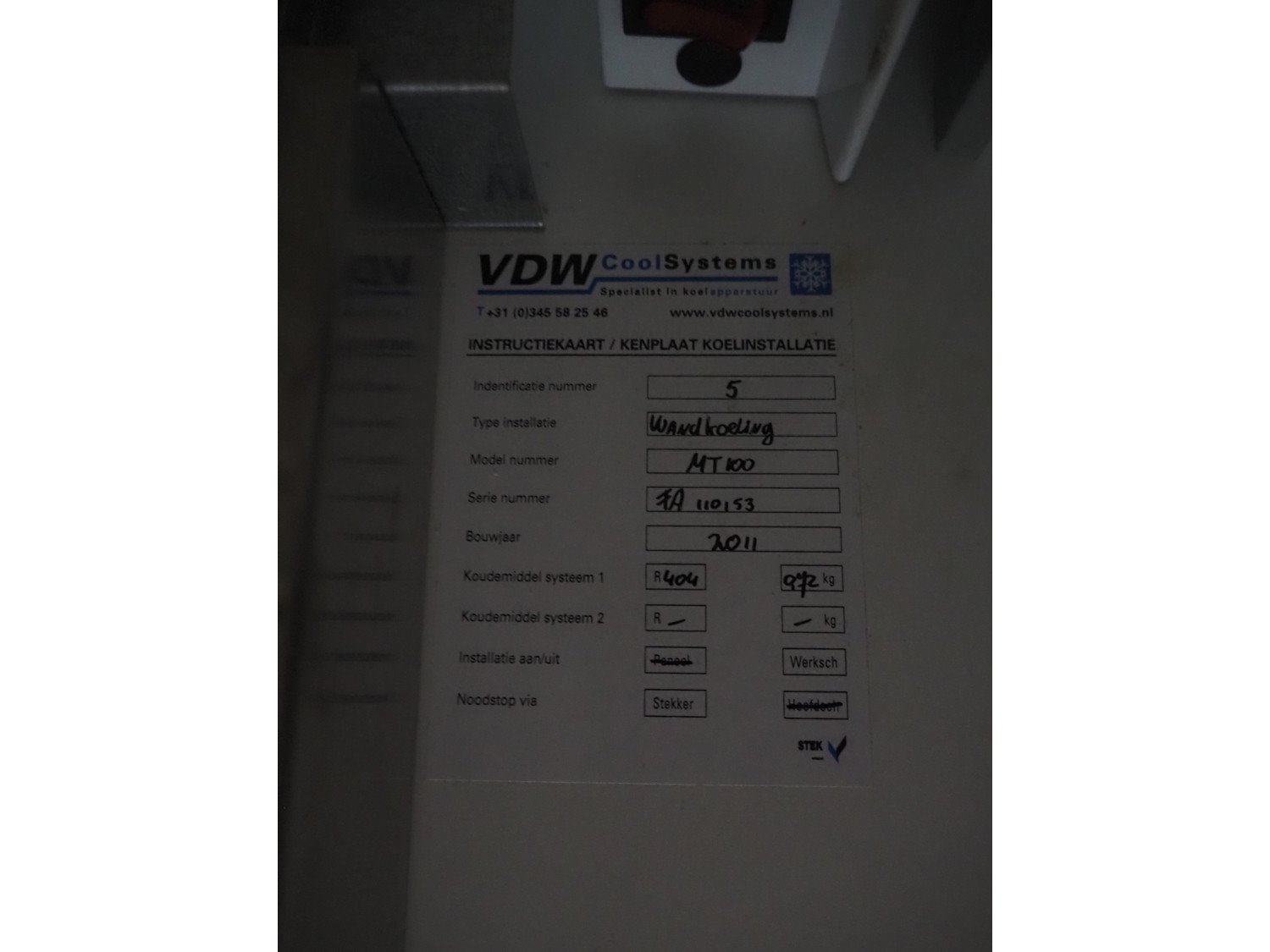 VDW CoolSystems refrigerated showcase, type: Wandkoeling, model: MT100, serial number: FA 110153, year of construction: refrigerant: R404/0.72 kg, 4 floors, floor dimensions: 900 mm x 400 mm, total dimensions: 970 mm x 830 mm x 2400 mm.